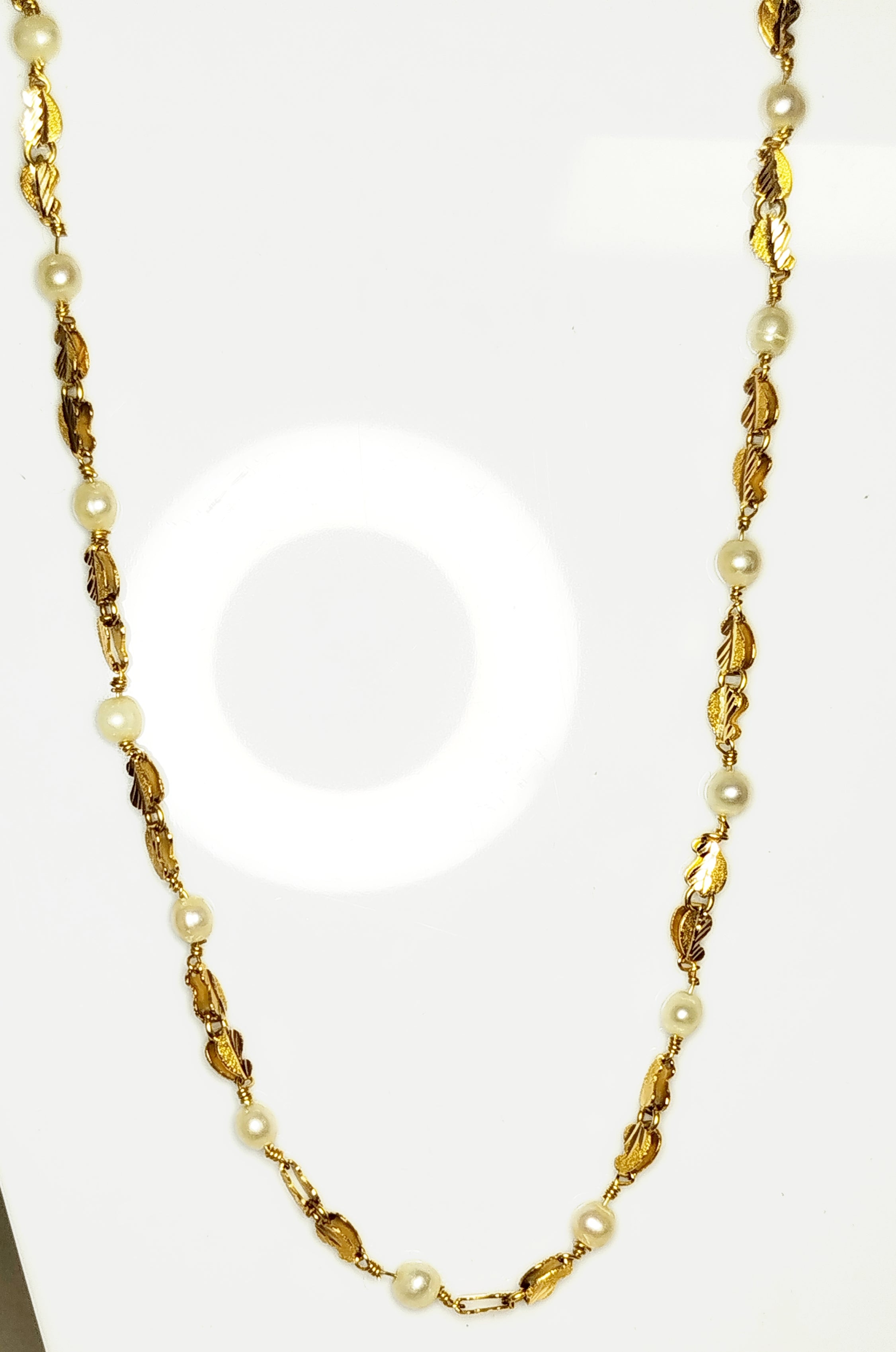 Collier ras du cou en or jaune 18 carats (750/1000), maille fantaisie, sans poinçon visible. Il mesure 44 cm de long, avec une largeur et une épaisseur fines de 0,05 mm. Orné de perles et doté d’un fermoir mousqueton, il pèse 13,54 grammes. État comme neuf.