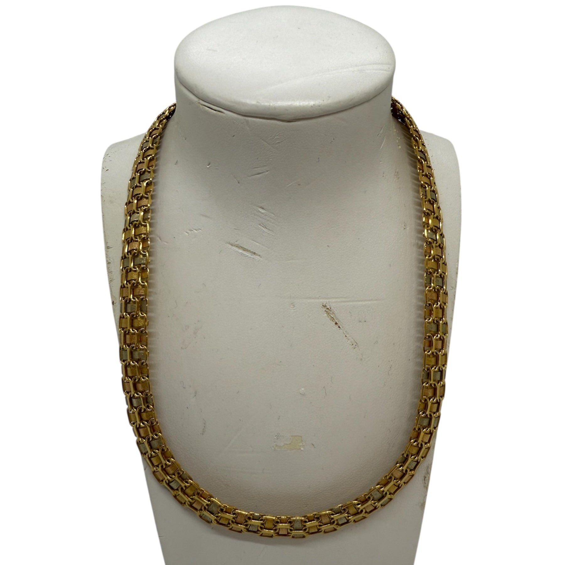 Collier ras du cou en or 18 carats (750/1000), sans poinçon, composé d’une maille forçat aux tons mêlés d’or jaune, or gris et or rose. Il mesure 41 cm de longueur, 10 mm de largeur et 2 mm d’épaisseur, pour un poids total de 37,99 grammes. Doté d’un fermoir à cliquet sécurisé, ce modèle sans pierres est proposé en très bon état général.