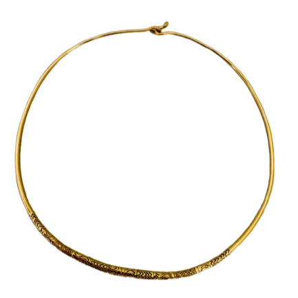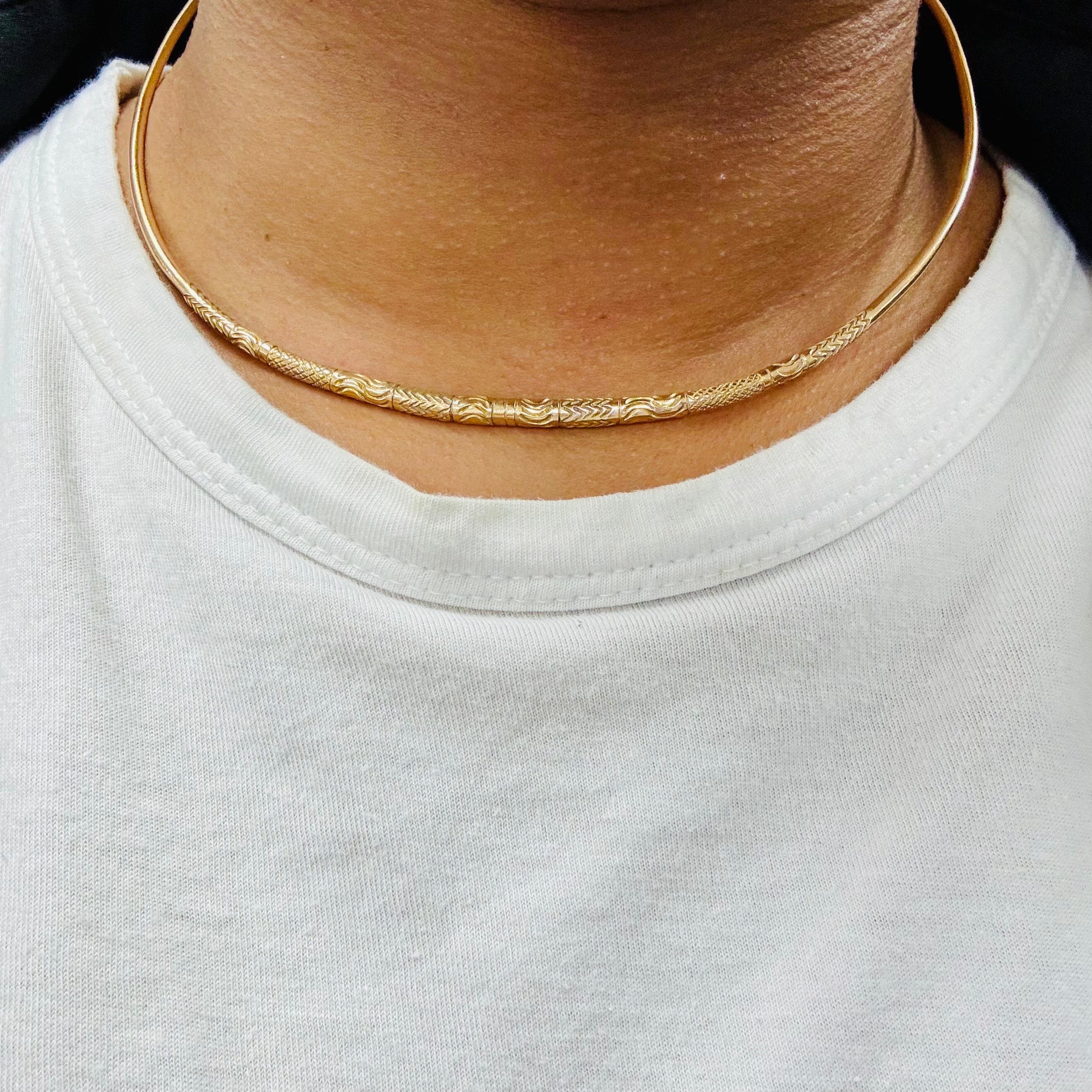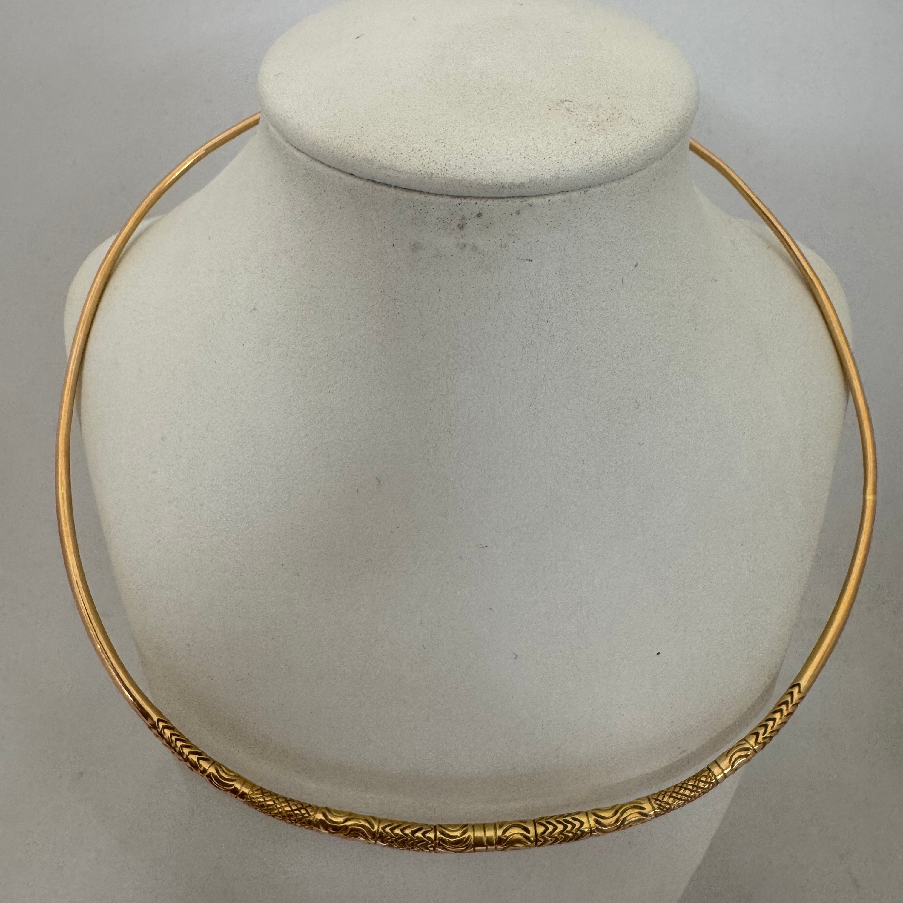 Collier ras du cou de type jonc en or jaune 750/1000 (18 carats), sans poinçon apparent. Il pèse 22,75 grammes et présente un diamètre de 12 cm, avec une largeur et une épaisseur de 3 mm. Sans pierres, ce bijou au design rigide et épuré est en bon état.