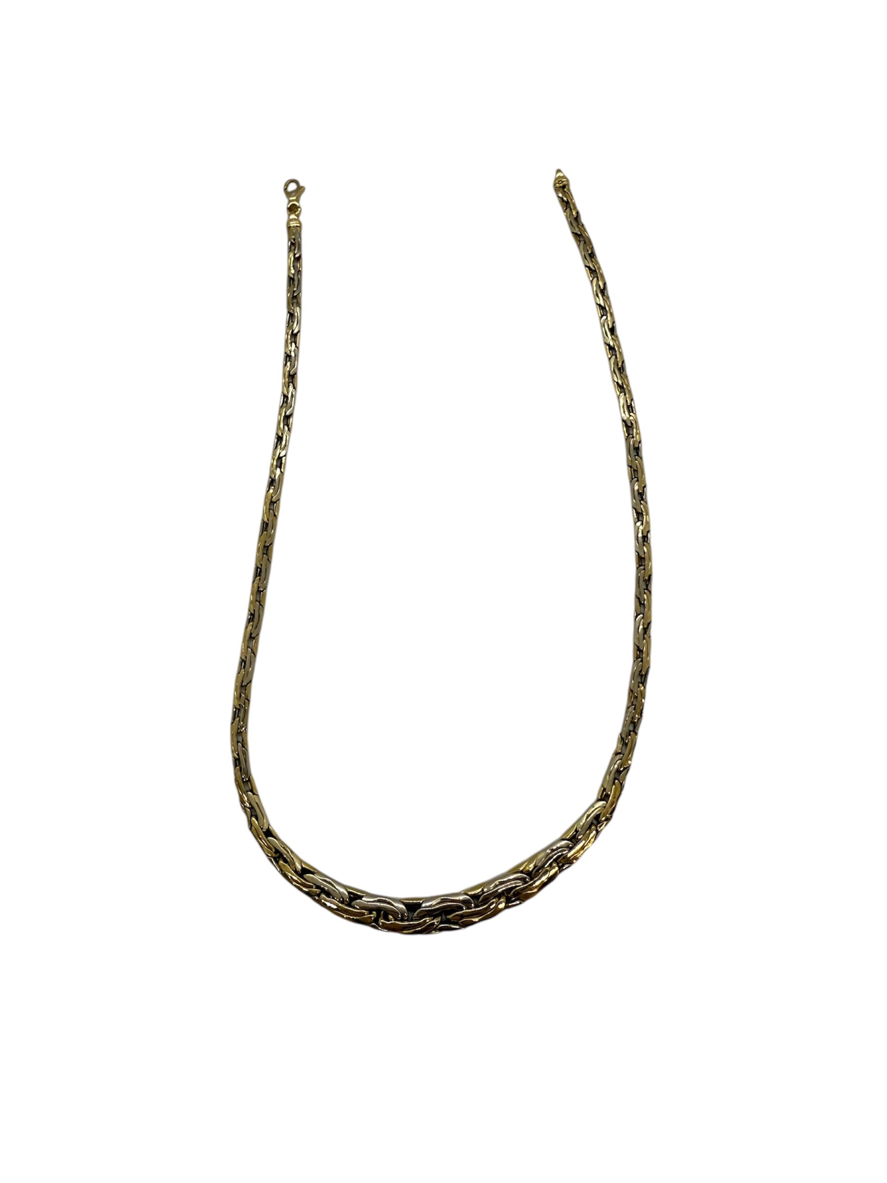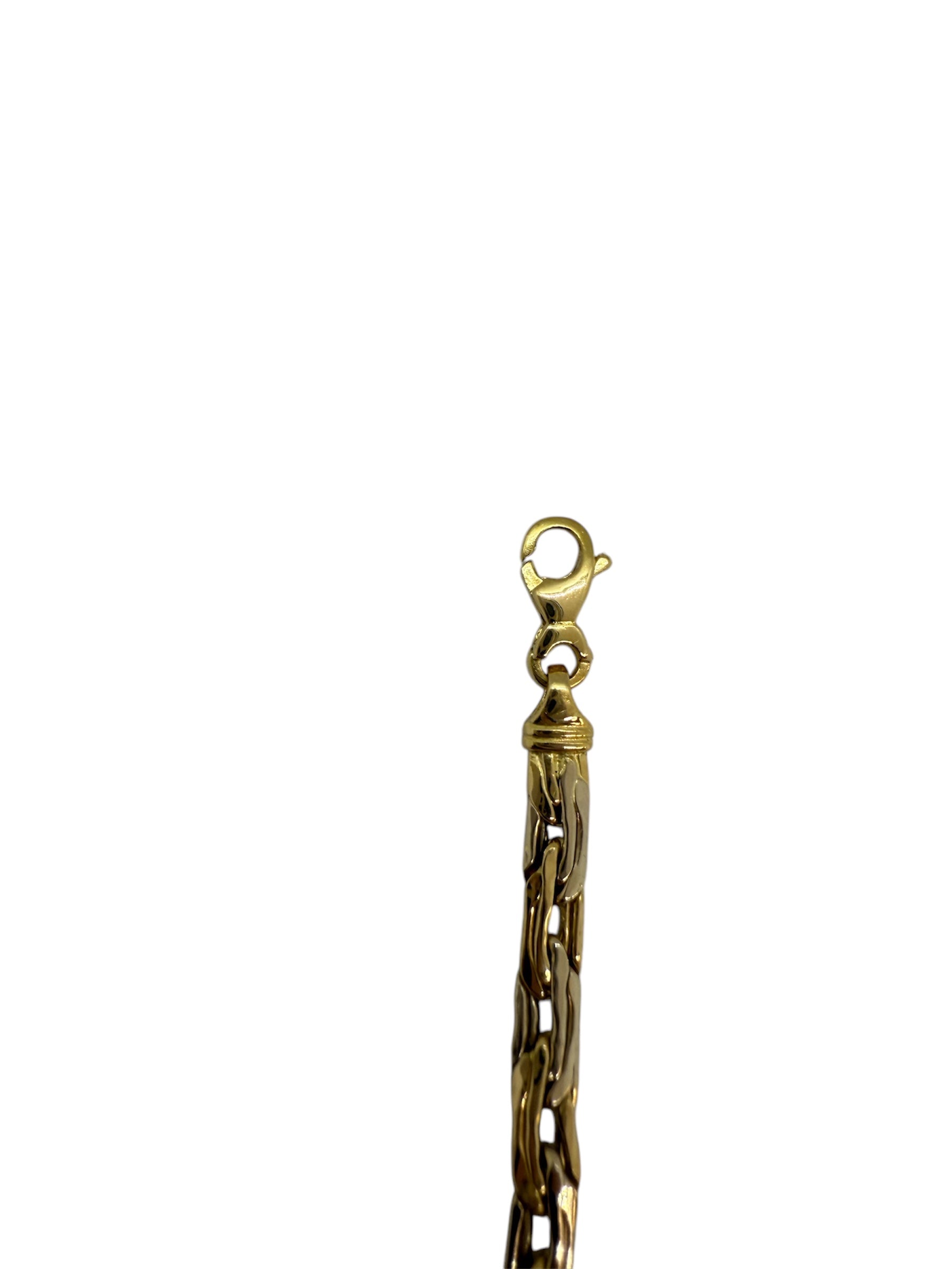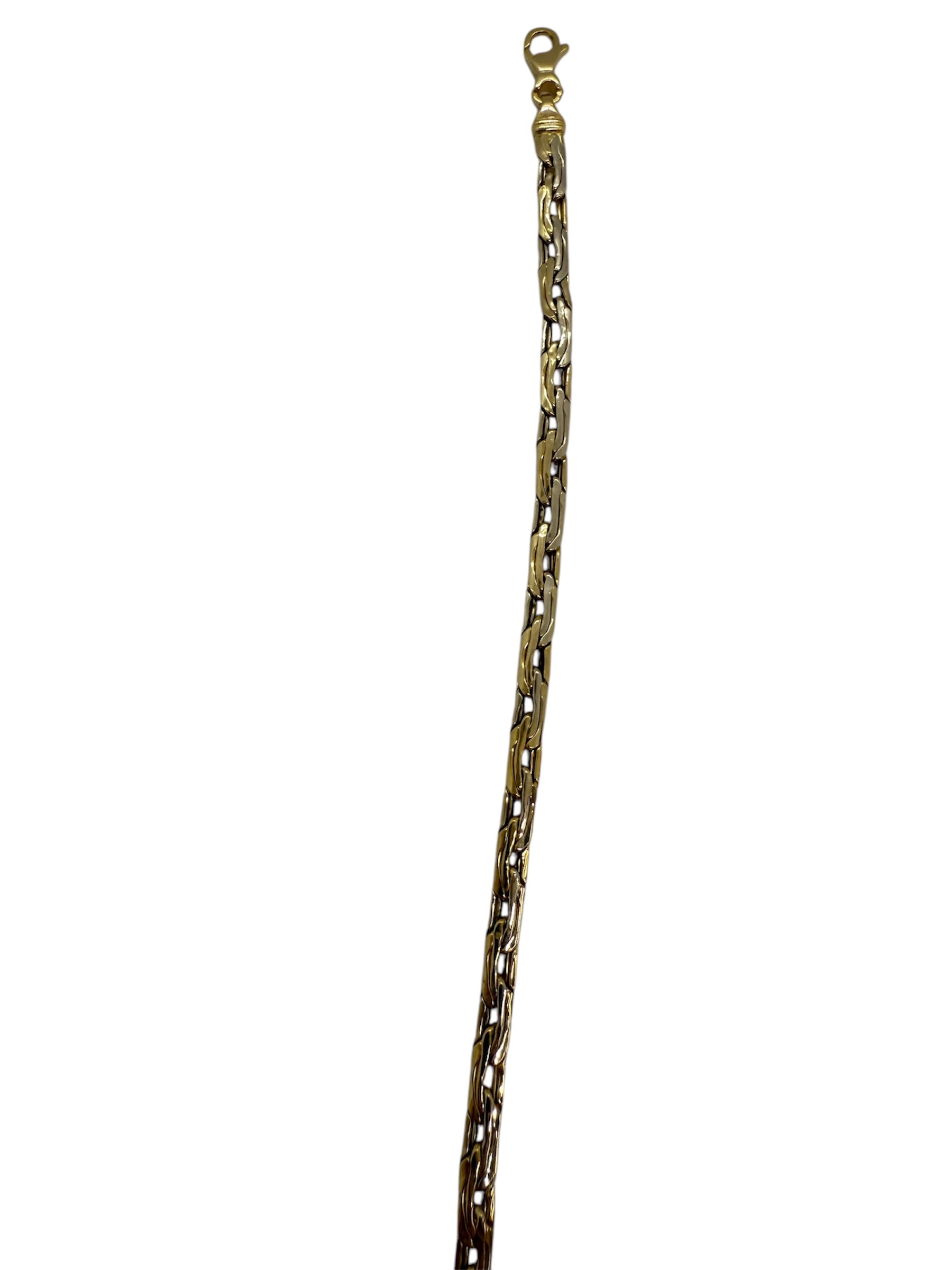 Superbe collier ras du cou en or jaune 18 carats (750/1000). Pesant 11,24 grammes, il mesure 42,5 cm de longueur, avec une largeur de 6 mm et une épaisseur de 2 mm. Sa maille haricot distinctive apporte un style unique et moderne. Doté d’un fermoir mousqueton pratique, ce collier est en très bon état, combinant allure classique et présence remarquable.