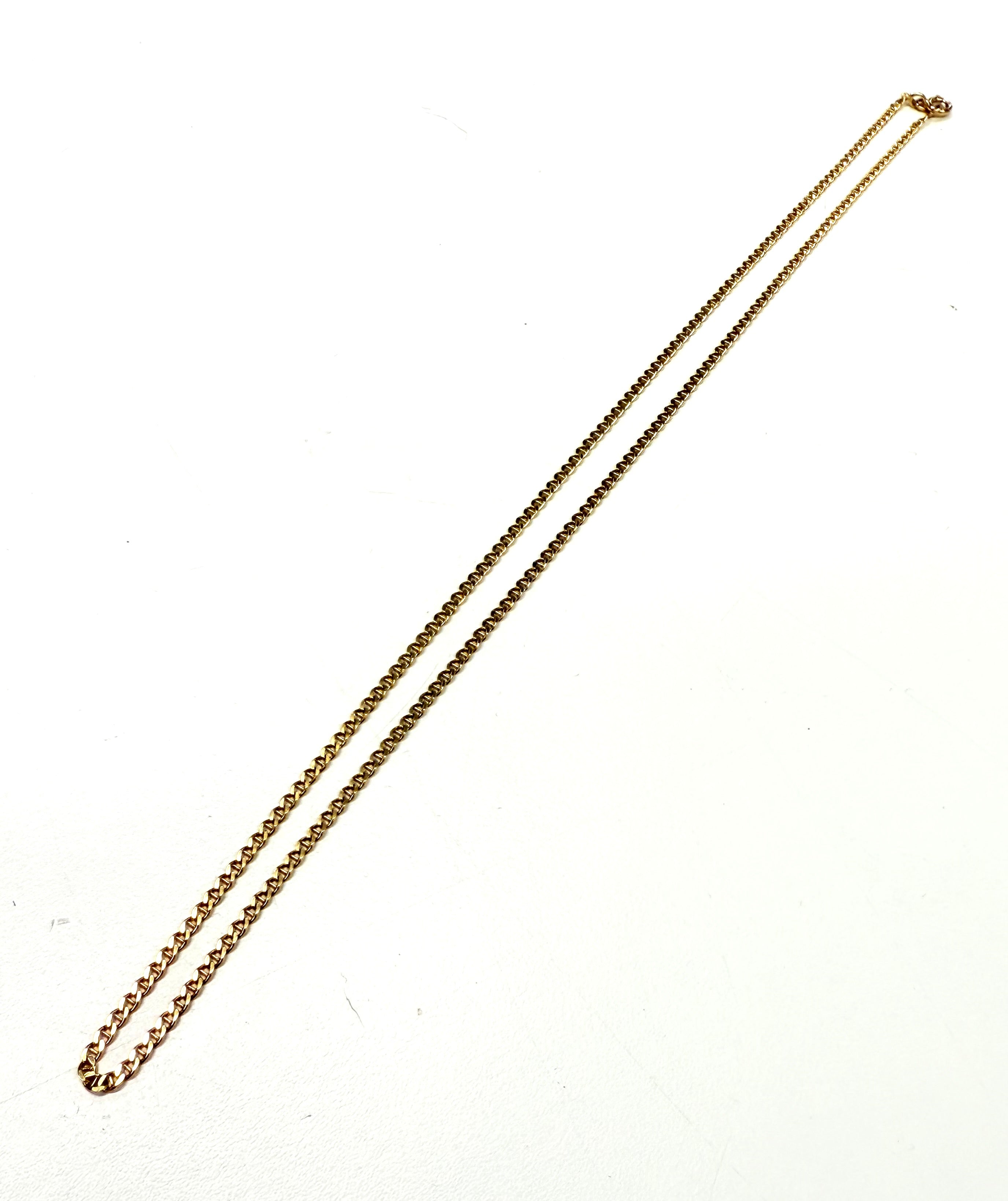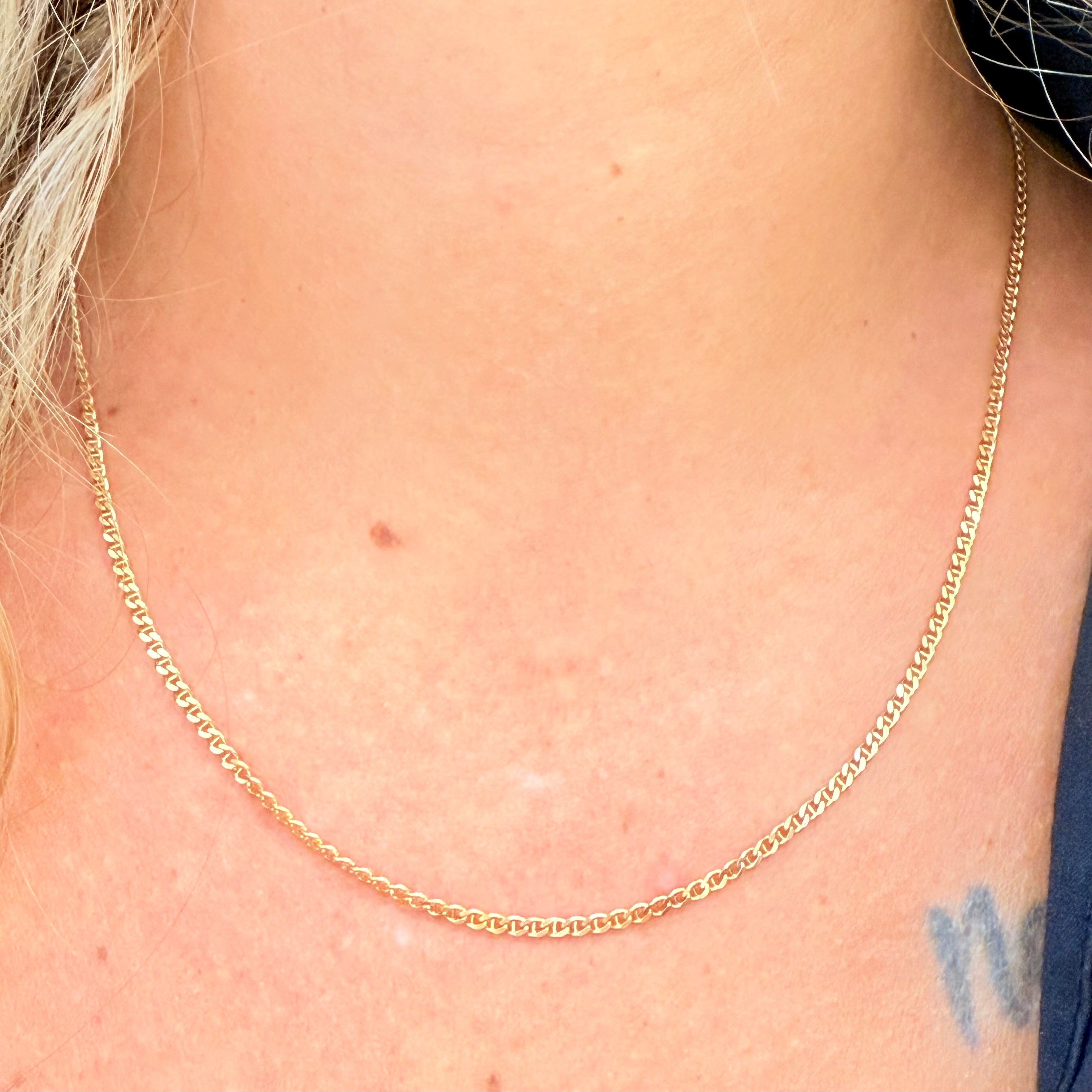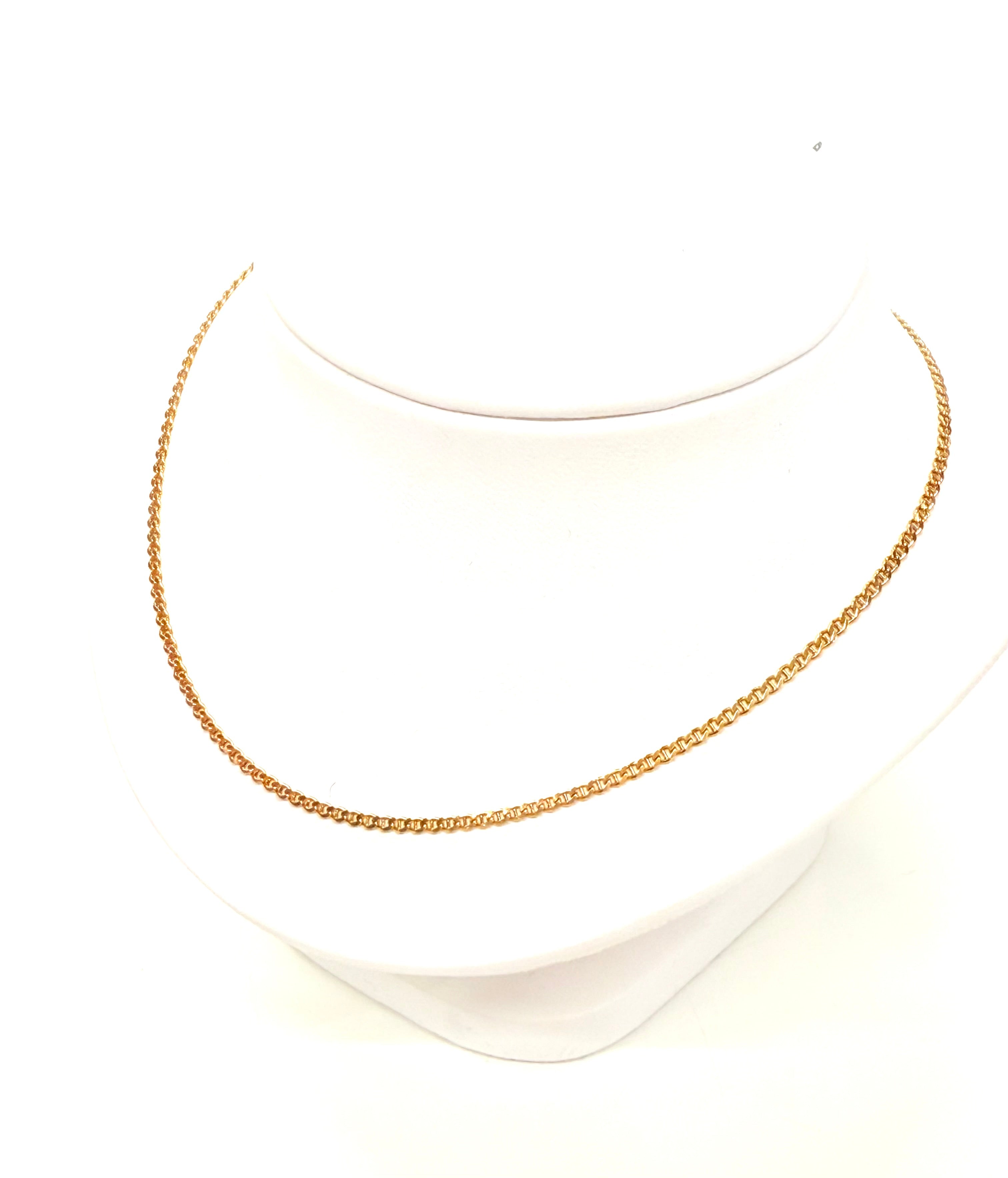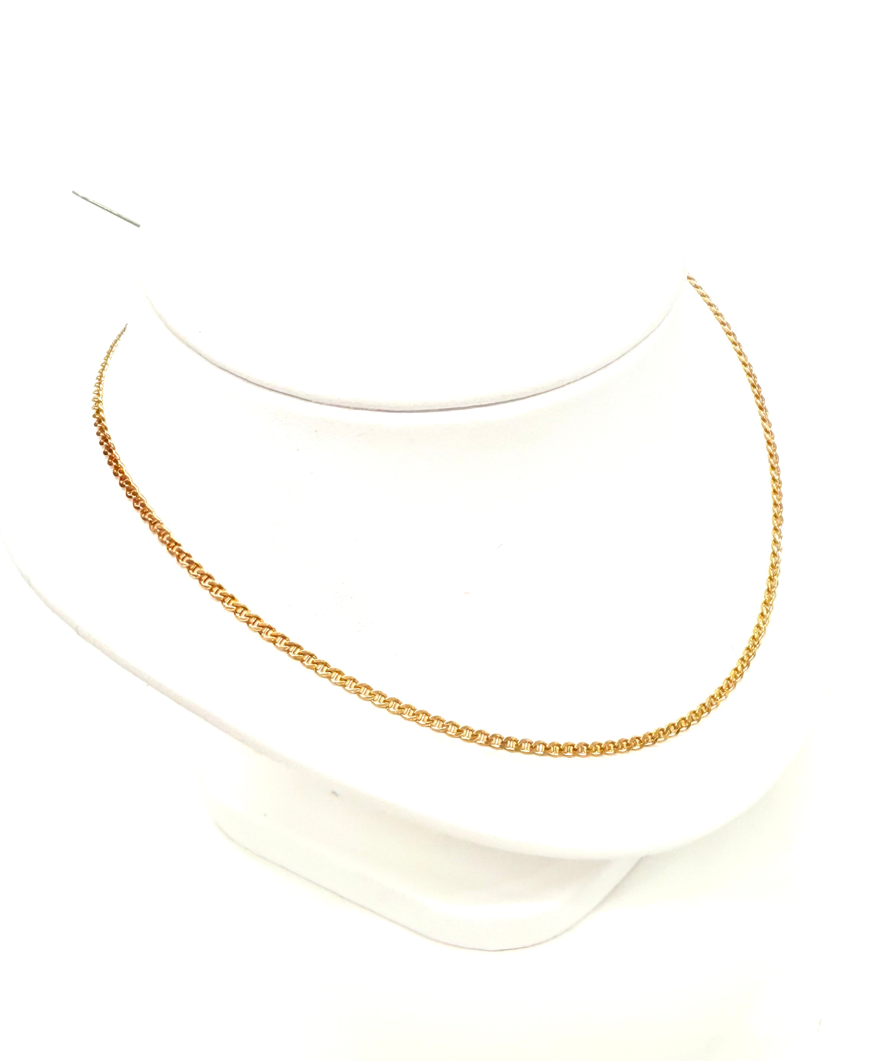 Collier ras du cou en or jaune 18 carats (750/1000), poinçonné 750, avec une maille marine fine. Il mesure 46 cm de long, pour une largeur de 0,2 cm et une épaisseur de 0,1 cm. Fermé par un anneau ressort, ce modèle ne comporte pas de pierres et se trouve en très bon état général.