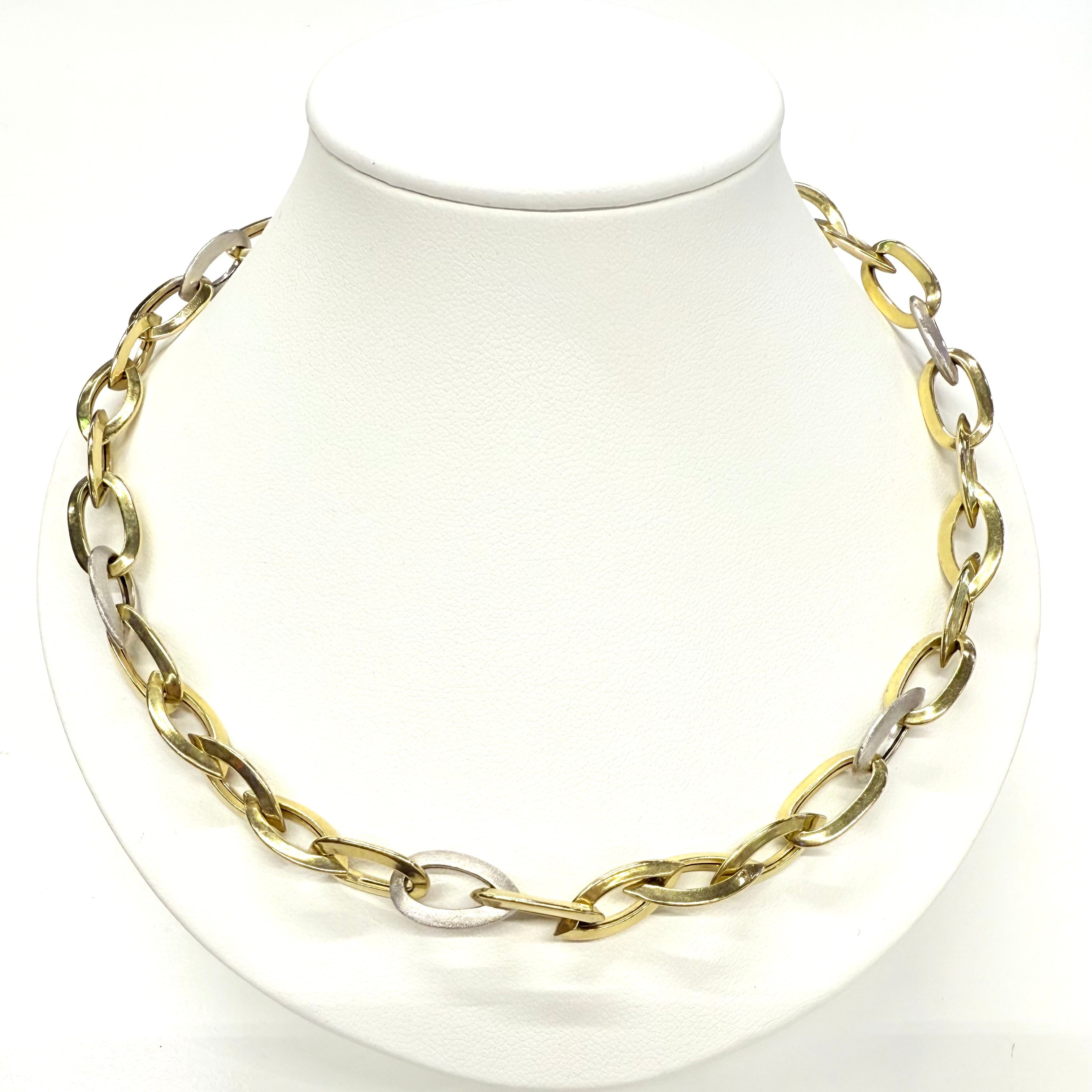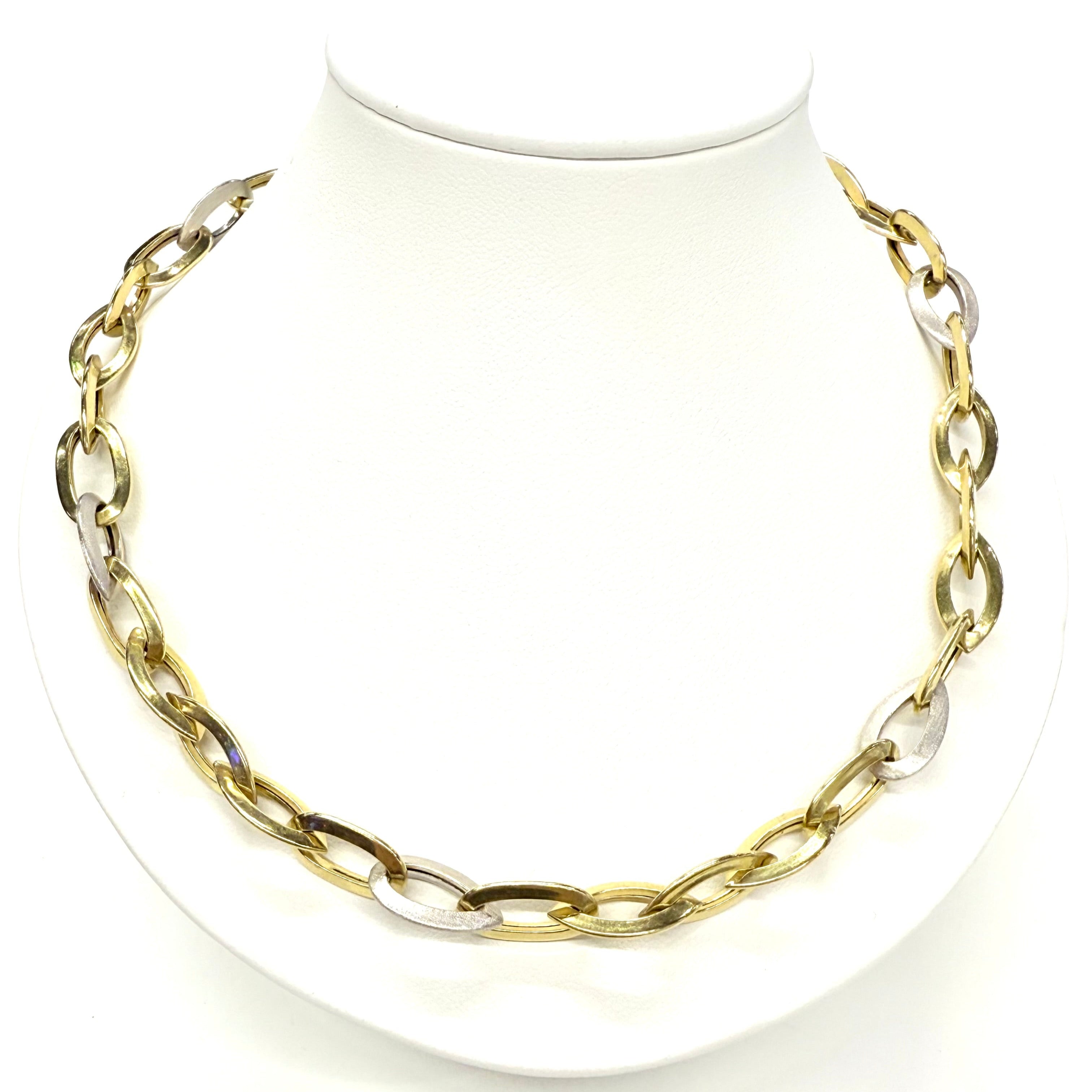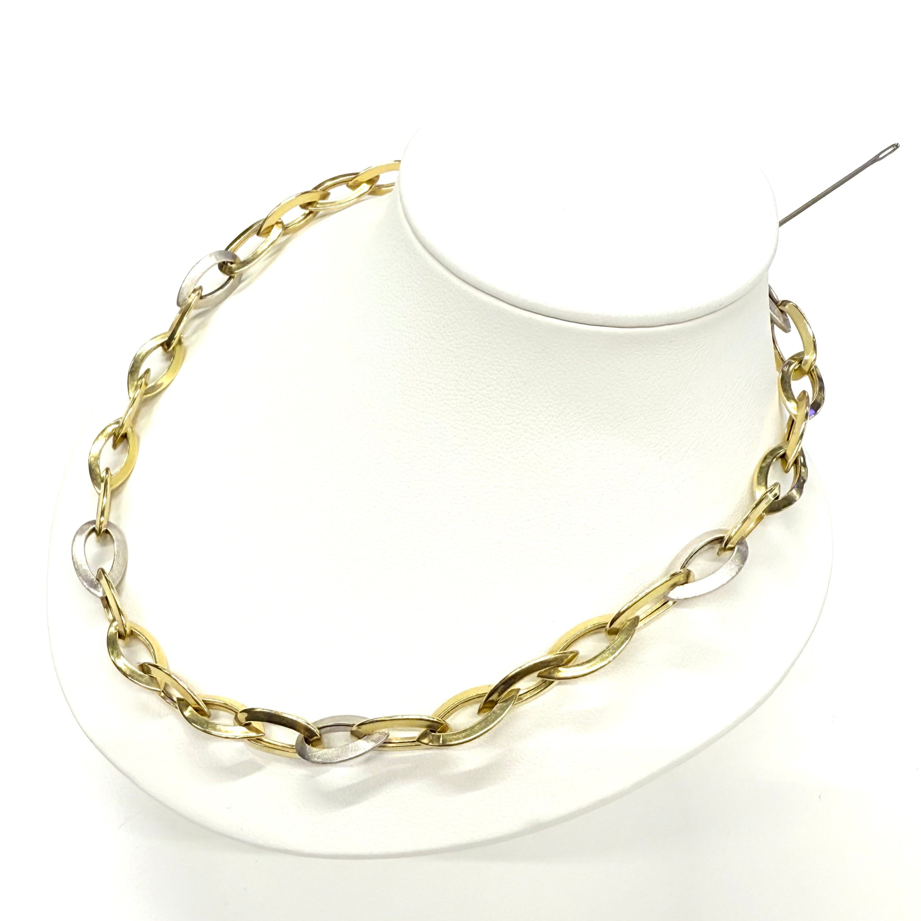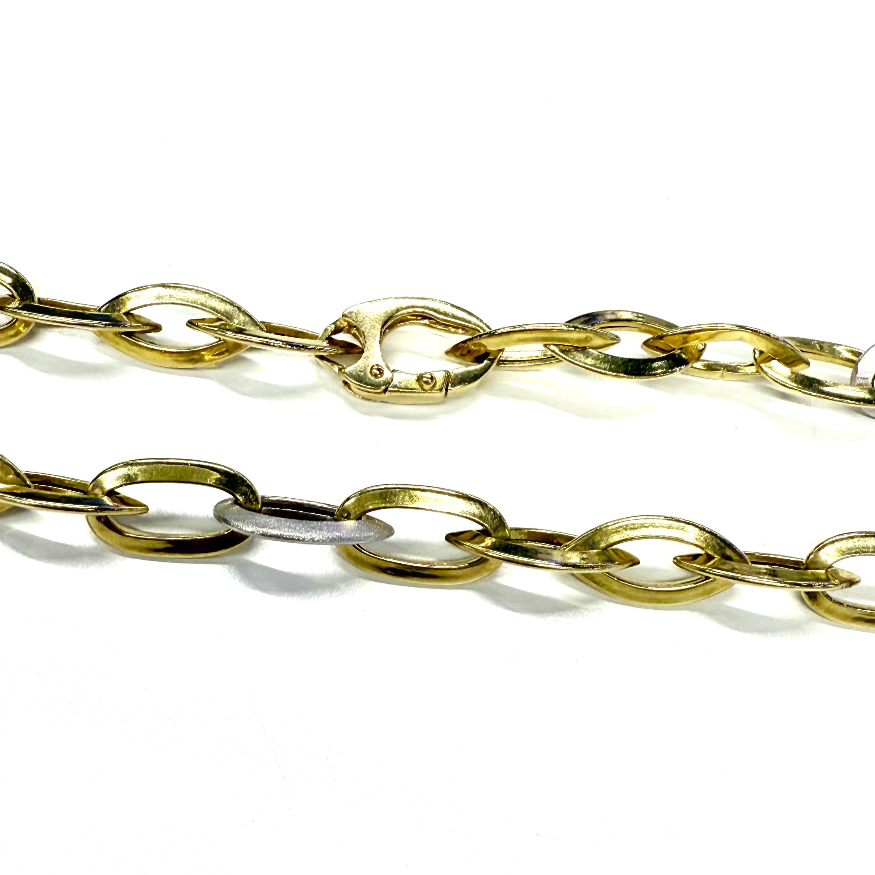 Collier ras du cou en or jaune et or blanc 18 carats (750/1000), avec une maille losange élégante. Il mesure 46 cm de long, 0,7 cm de large et 0,2 cm d’épaisseur. Fermoir mousqueton pratique et sécurisé. Sans pierre. En bon état, ce bijou bicolore offre un style raffiné et lumineux.
