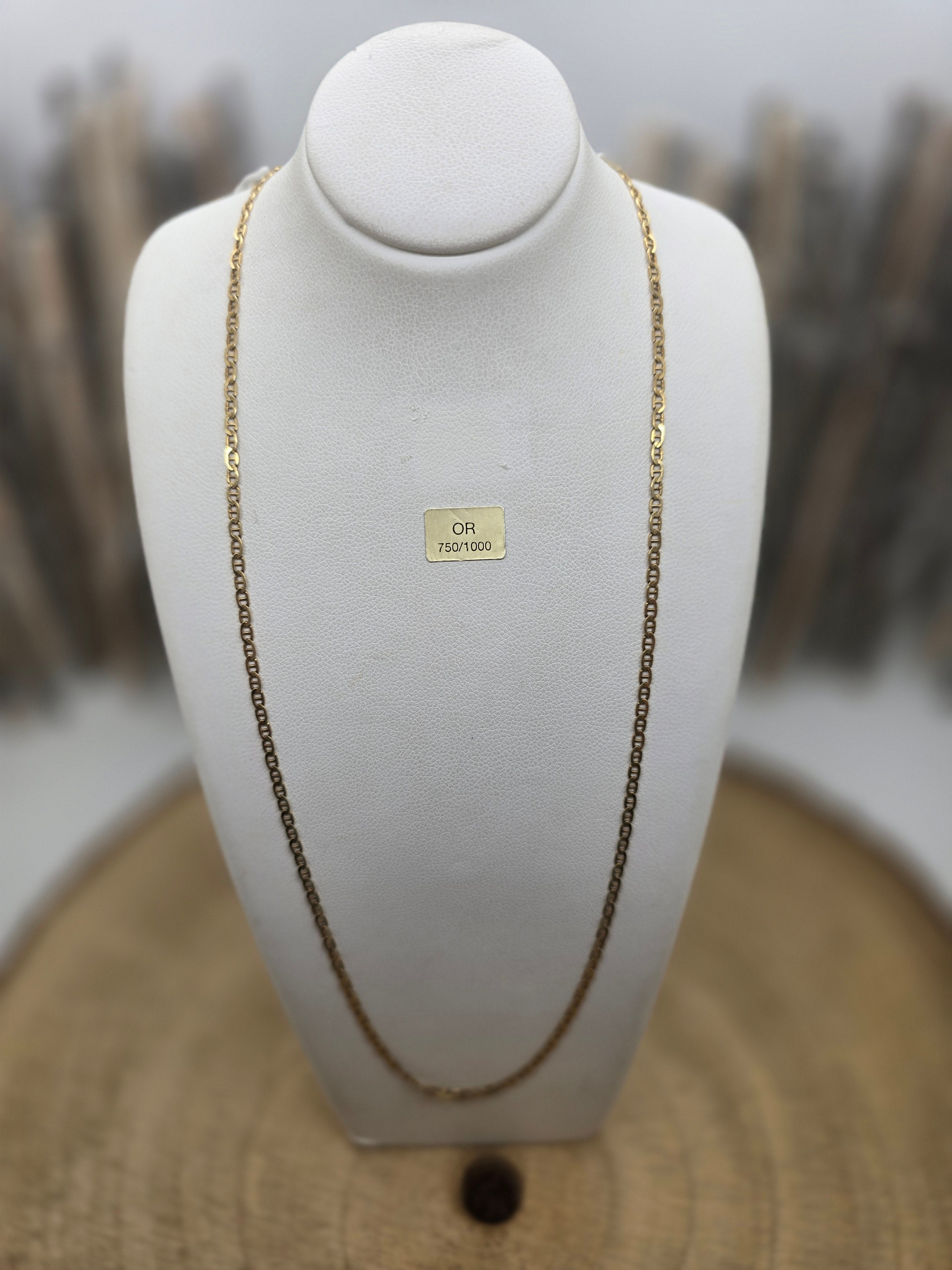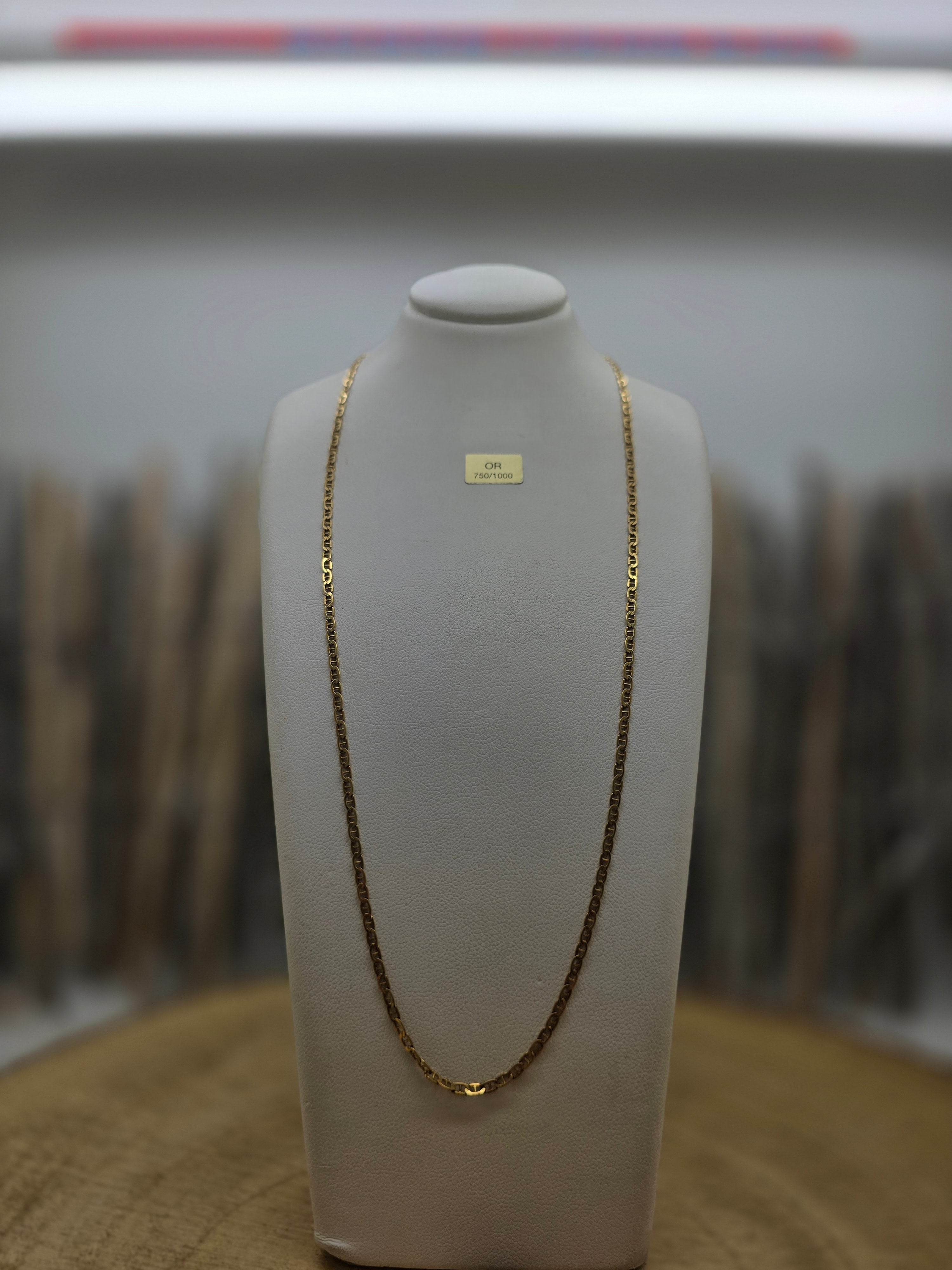 Collier sautoir en or jaune 18 carats (titrage 750/1000, poinçon 750) présente une maille cheval. Il mesure 24,5 cm de long, avec une largeur et une épaisseur fines de 0,02 mm, pour un poids de 3,99 grammes. Équipé d’un fermoir à anneau ressort, il est en très bon état.