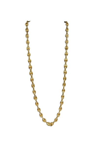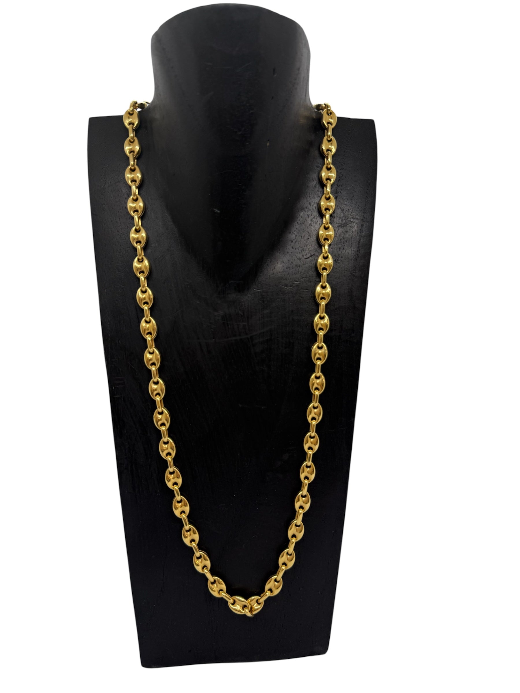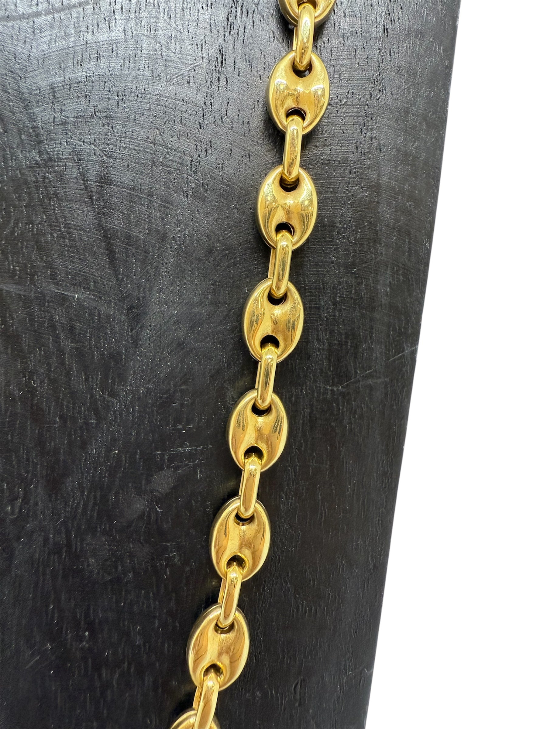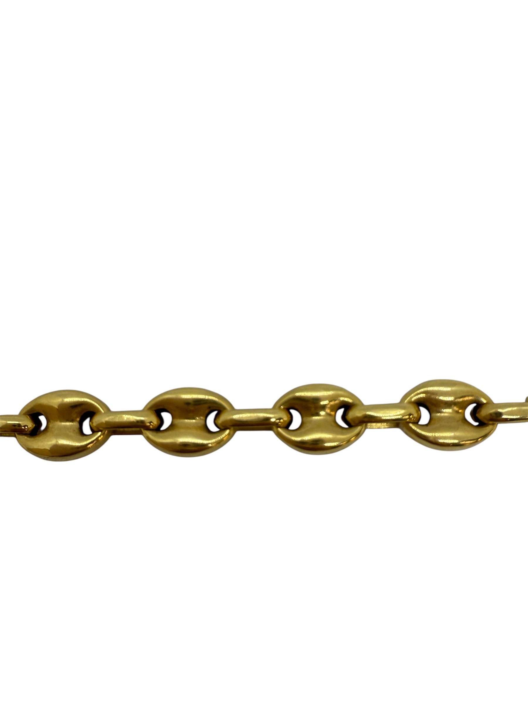 Collier sautoir en or jaune 18 carats (750/1000), poinçonné 750, est en très bon état. Il se compose d’une maille grain de café, large de 7 mm et épaisse de 3 mm, apportant du caractère et une belle présence visuelle. D’une longueur de 31 cm et d’un poids de 24,90 grammes, il est doté d’un fermoir mousqueton solide.