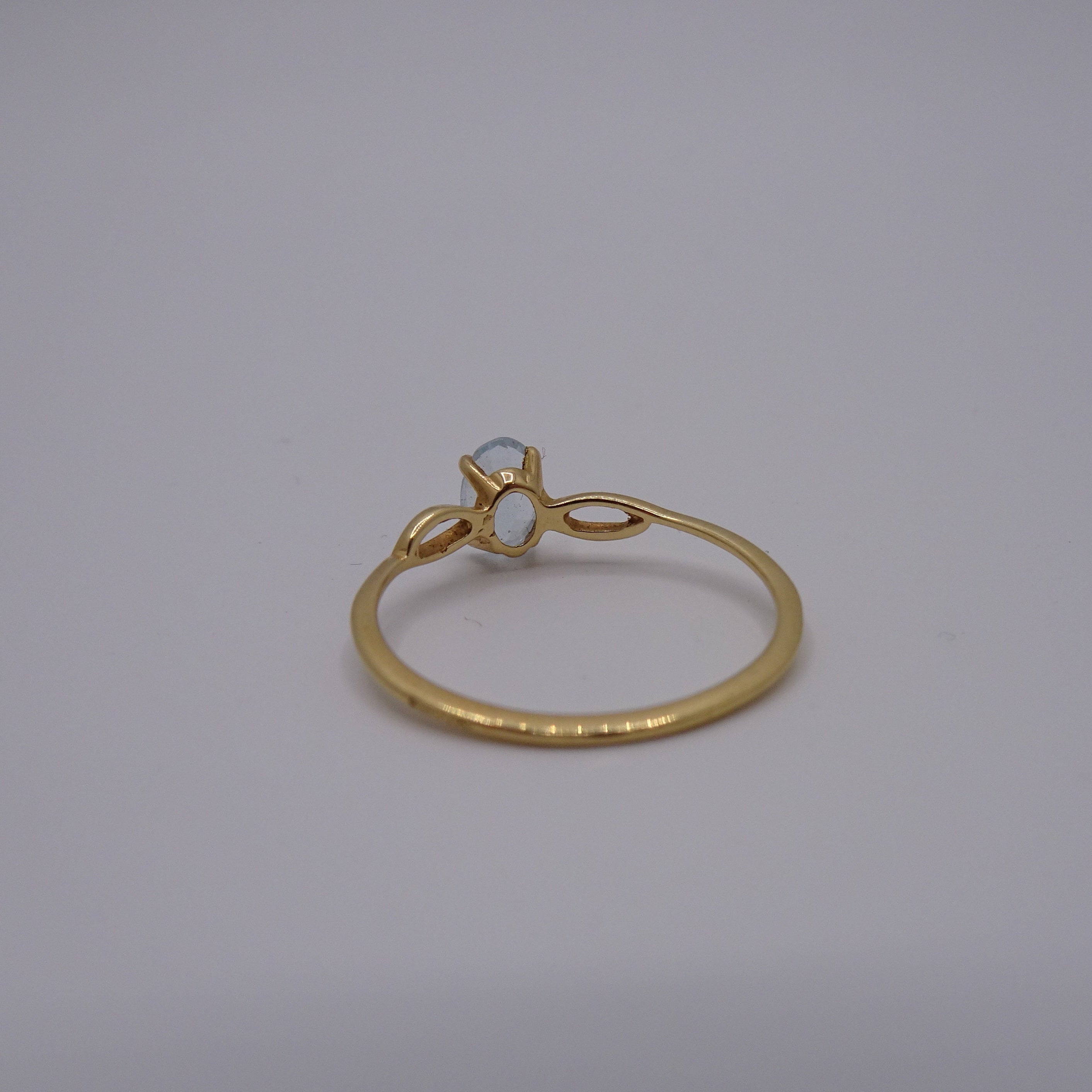 Bague en or jaune 750/1000 (18 carats) poinçonnée 750, ornée d’une aigue-marine. Elle pèse 0,84 gramme et est de taille 51. Ce bijou empierré est présenté en très bon état.