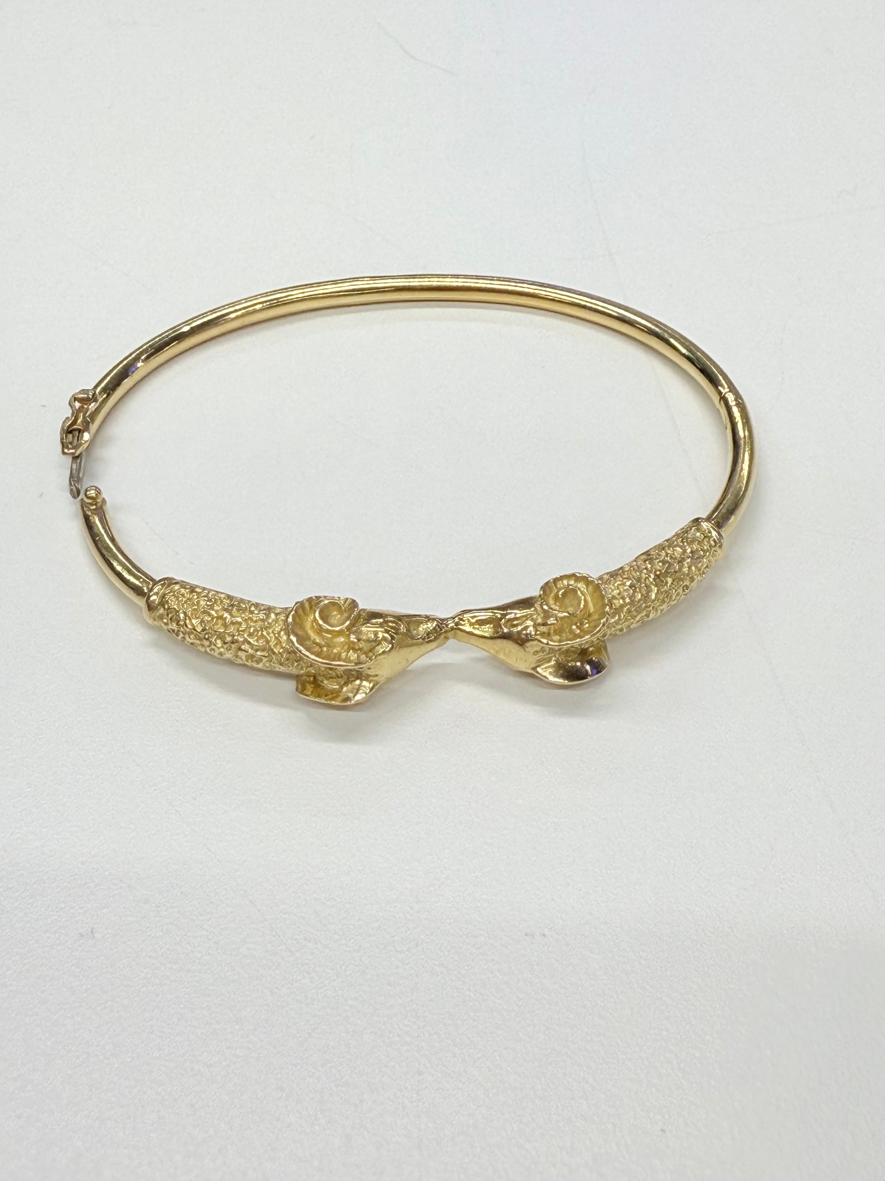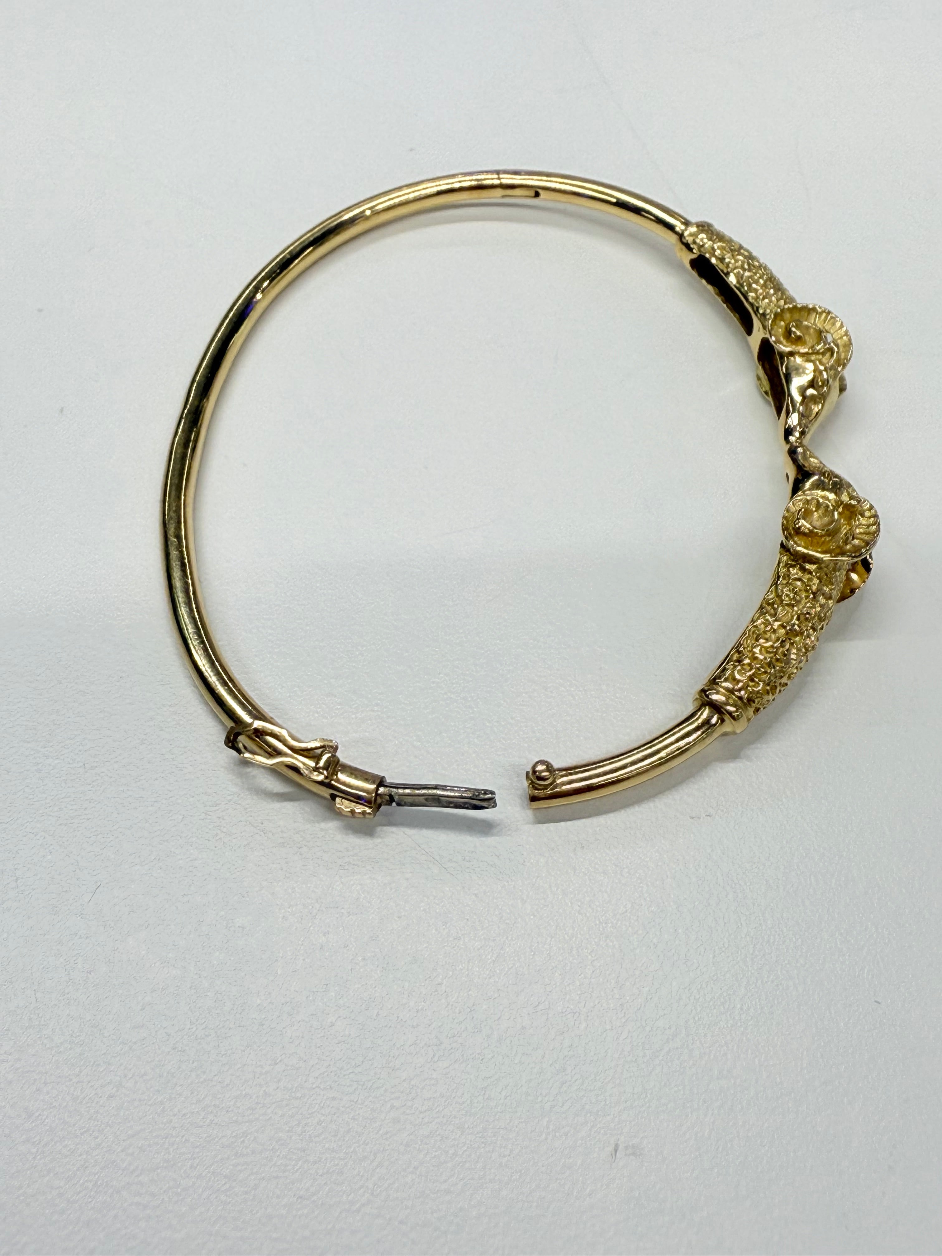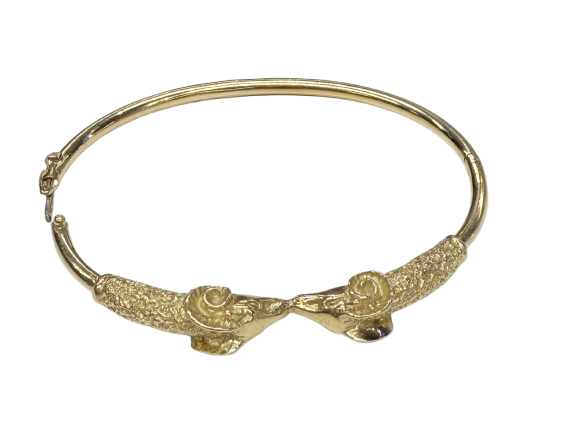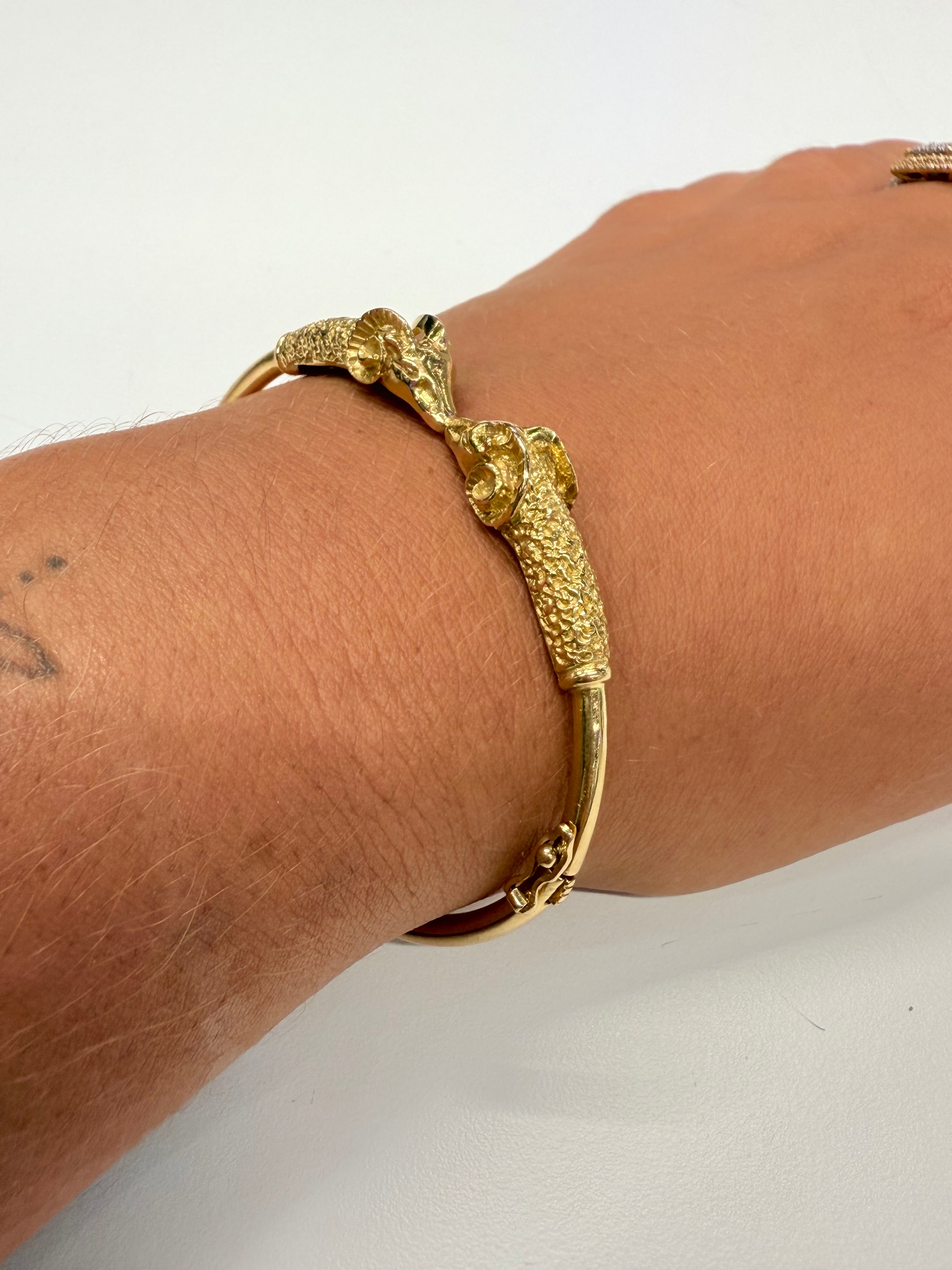 Magnifique jonc en or jaune 18 carats (750/1000), caractérisé par son design unique et ses deux têtes de bélier. Avec un diamètre de 6,5 cm, une largeur de 4,7 cm et une épaisseur de 0,2 cm, ce bracelet incarne l'élégance et le raffinement. Doté d’un fermoir à cliquet sécurisé et poinçonné Tête d’Aigle, il atteste de son authenticité et de sa qualité exceptionnelle. D’un poids de 15,81 grammes, ce bijou en très bon état est idéal pour compléter vos tenues avec une touche d'originalité et de sophistication.