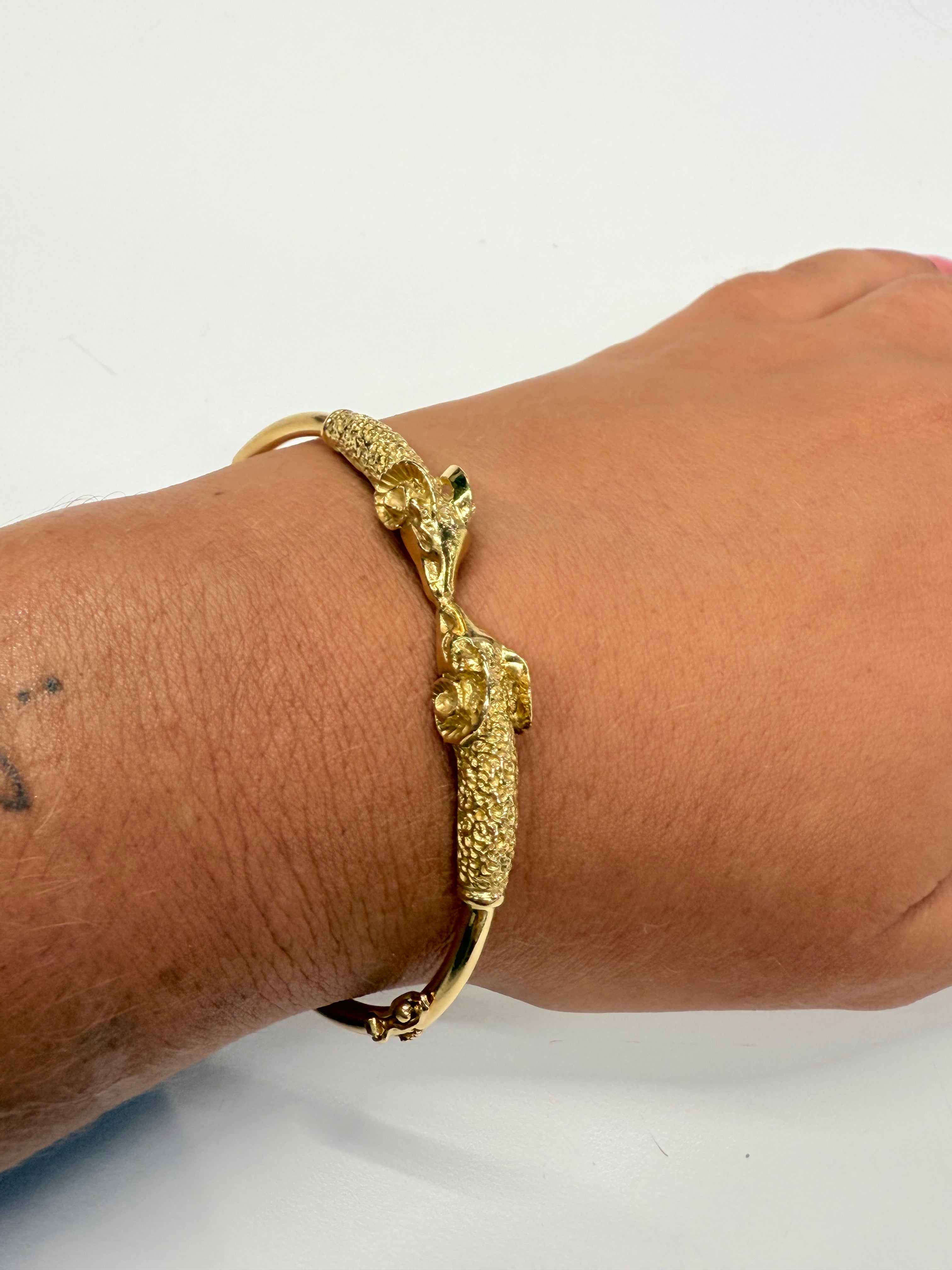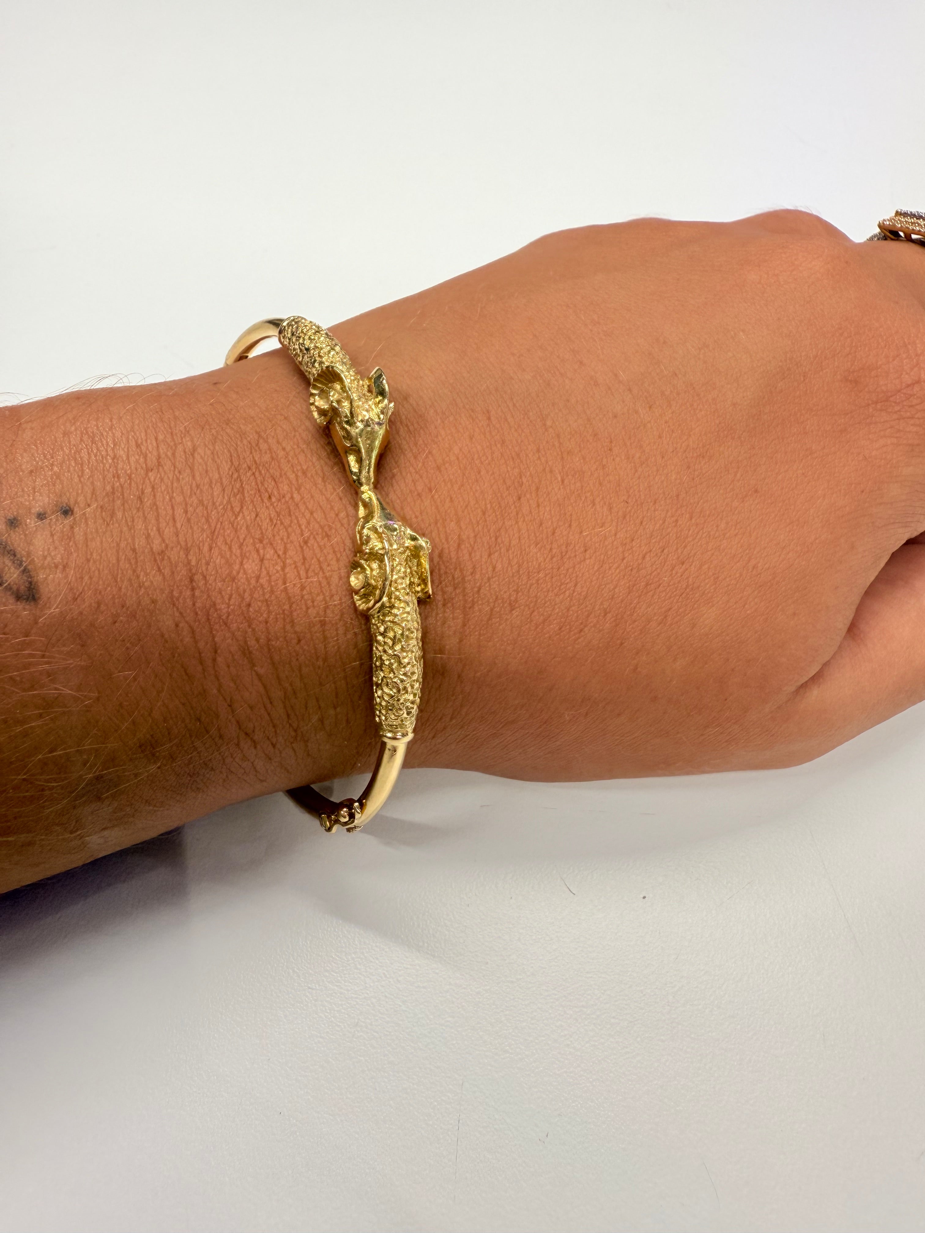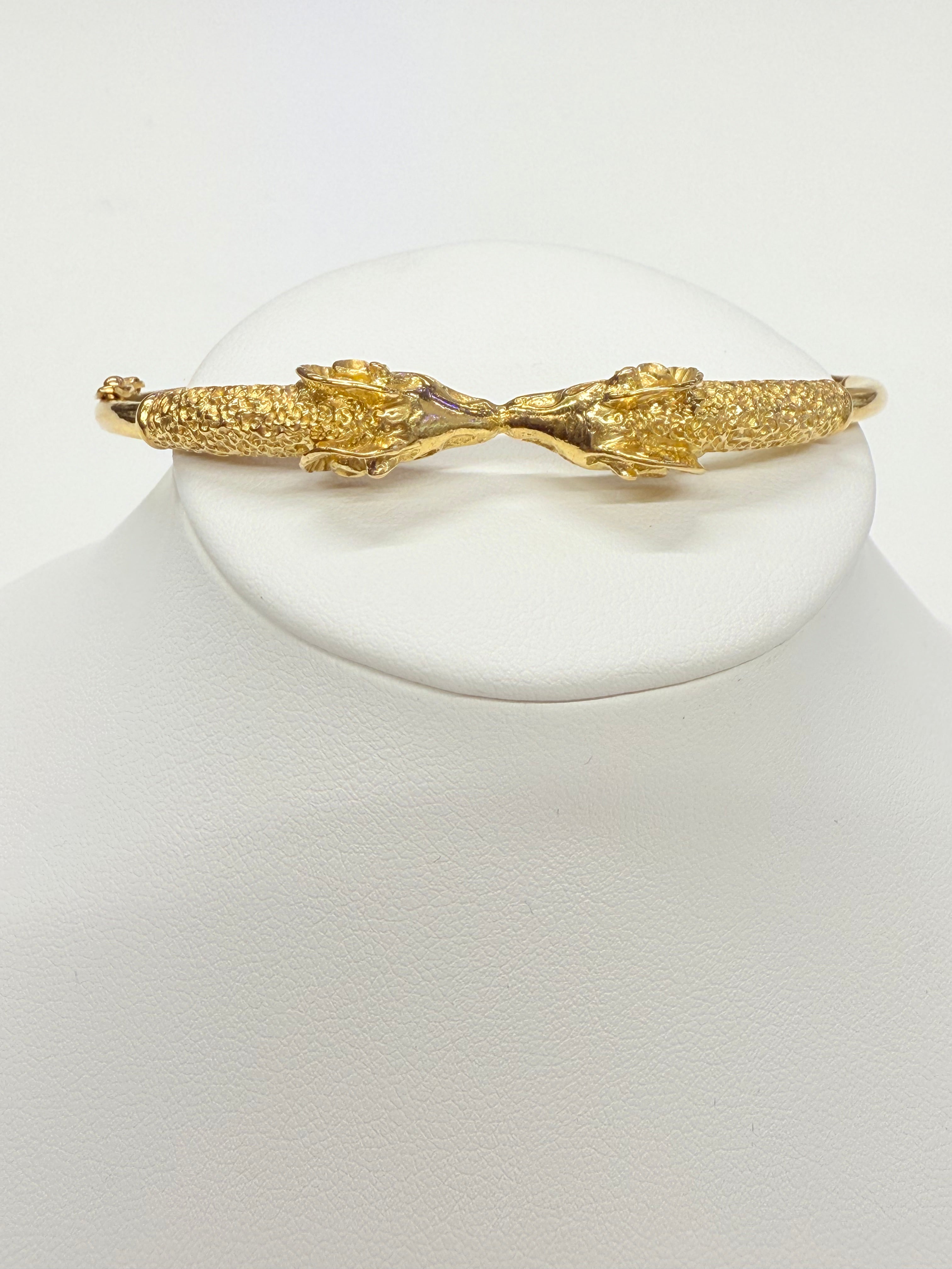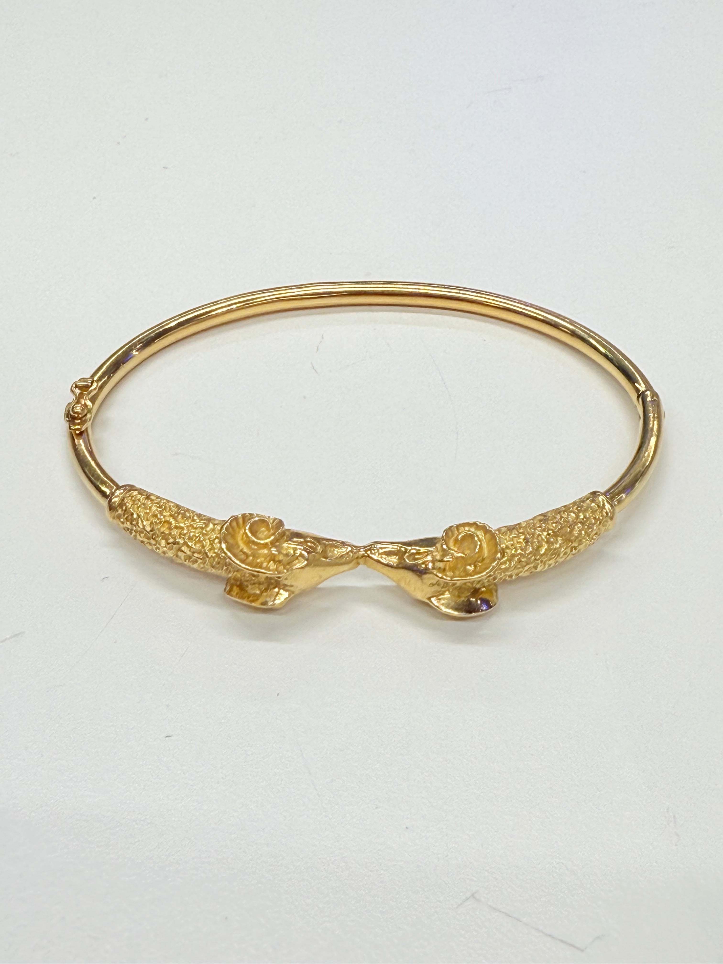Magnifique jonc en or jaune 18 carats (750/1000), caractérisé par son design unique et ses deux têtes de bélier. Avec un diamètre de 6,5 cm, une largeur de 4,7 cm et une épaisseur de 0,2 cm, ce bracelet incarne l'élégance et le raffinement. Doté d’un fermoir à cliquet sécurisé et poinçonné Tête d’Aigle, il atteste de son authenticité et de sa qualité exceptionnelle. D’un poids de 15,81 grammes, ce bijou en très bon état est idéal pour compléter vos tenues avec une touche d'originalité et de sophistication.