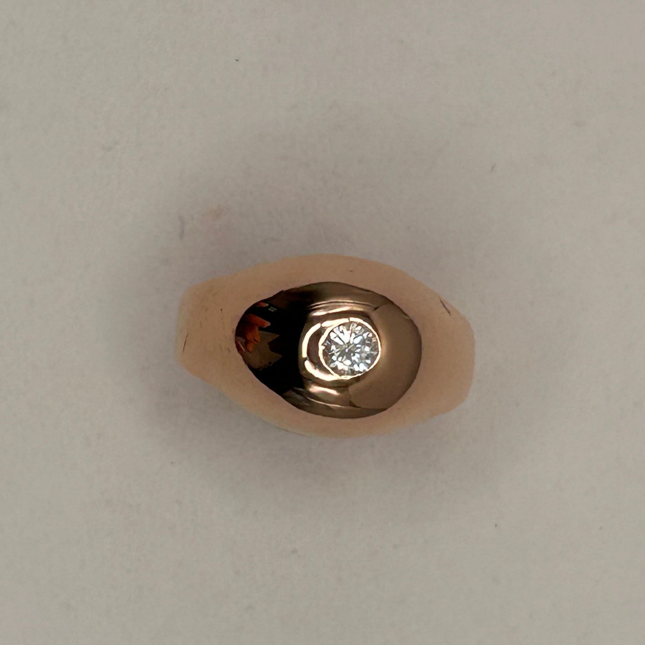 Bague de type jonc en or jaune 18 carats (750/1000), poinçonnée tête d’aigle, en bon état. Elle est sertie d’un diamant brillant de 0,20 carat. D’un poids de 4,86 grammes et d’une taille comprise entre 51 et 52.
