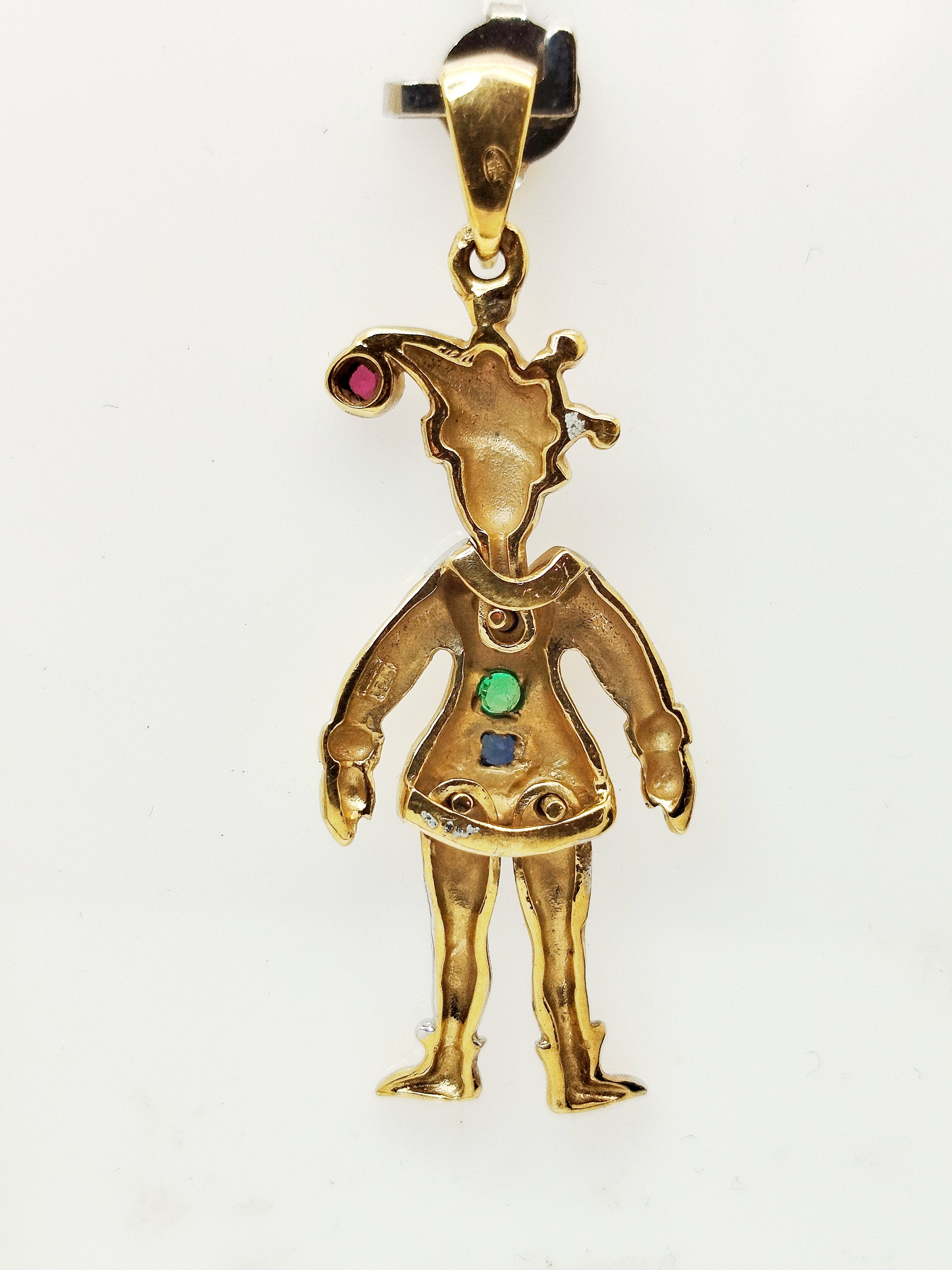 Magnifique pendentif Arlequin en or jaune 18 carats (750/1000) . Pesant 4, 10 grammes . Avec éclats de diamant, ornée d'un rubis , un saphir et d'une émeraude. Il mesure 3 cm de hauteur , 1 cm de largeur et 0.2 cm d'épaisseur.