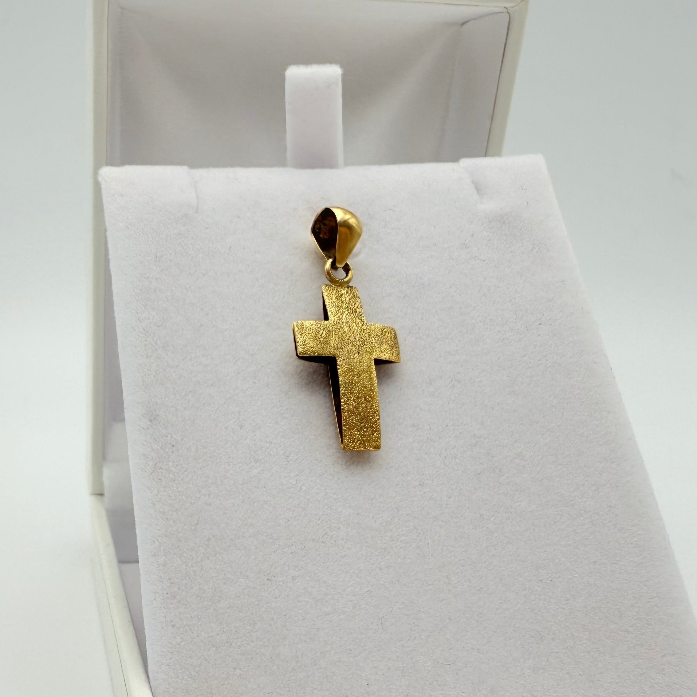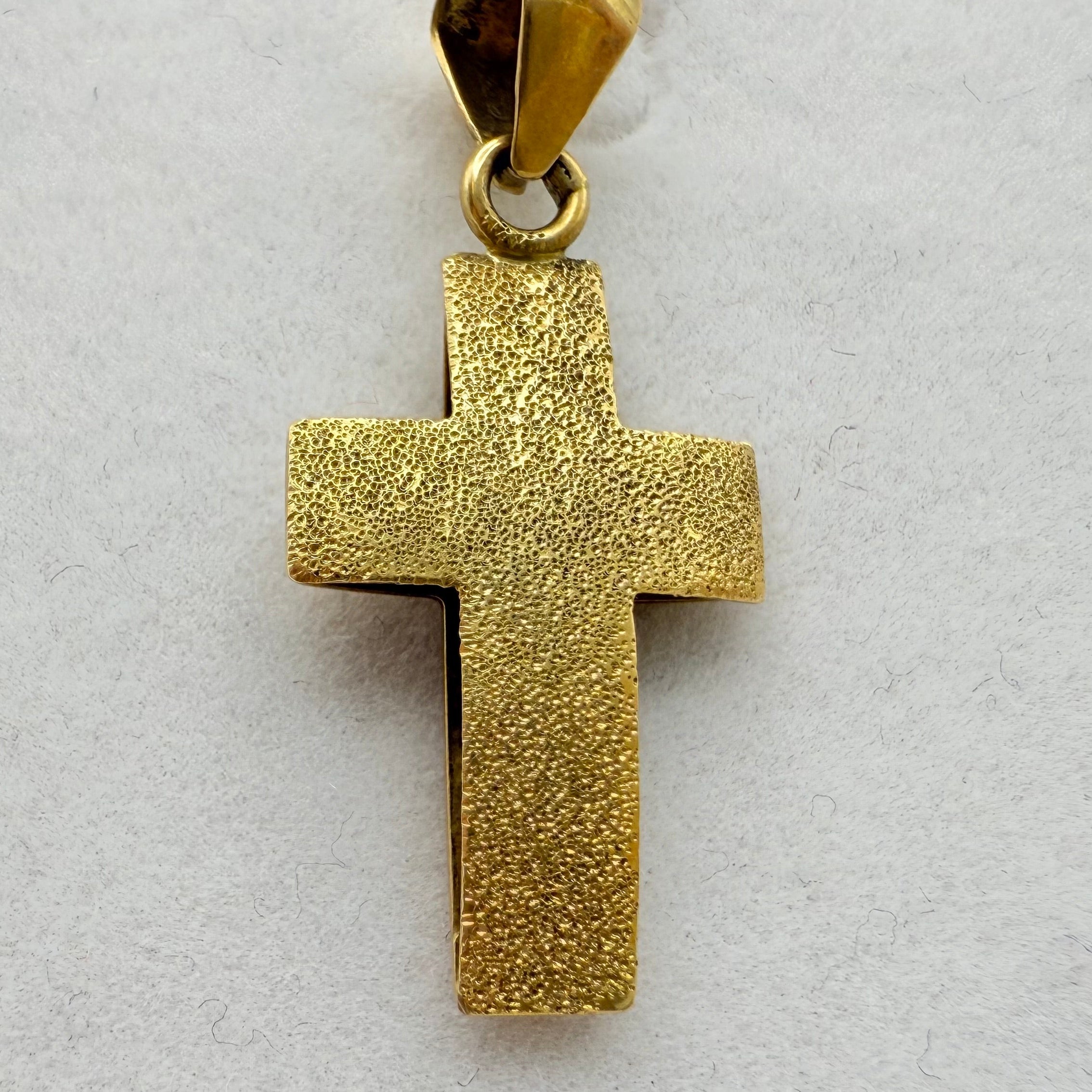 Pendentif en forme de croix en or jaune 18 carats (750/1000), poinçonné Tête d’Aigle. Il mesure 3 cm de hauteur, 1,5 cm de largeur et 0,5 cm d’épaisseur, pour un poids de 1,97 gramme. Sans pierres, ce bijou sobre et symbolique est en bon état.