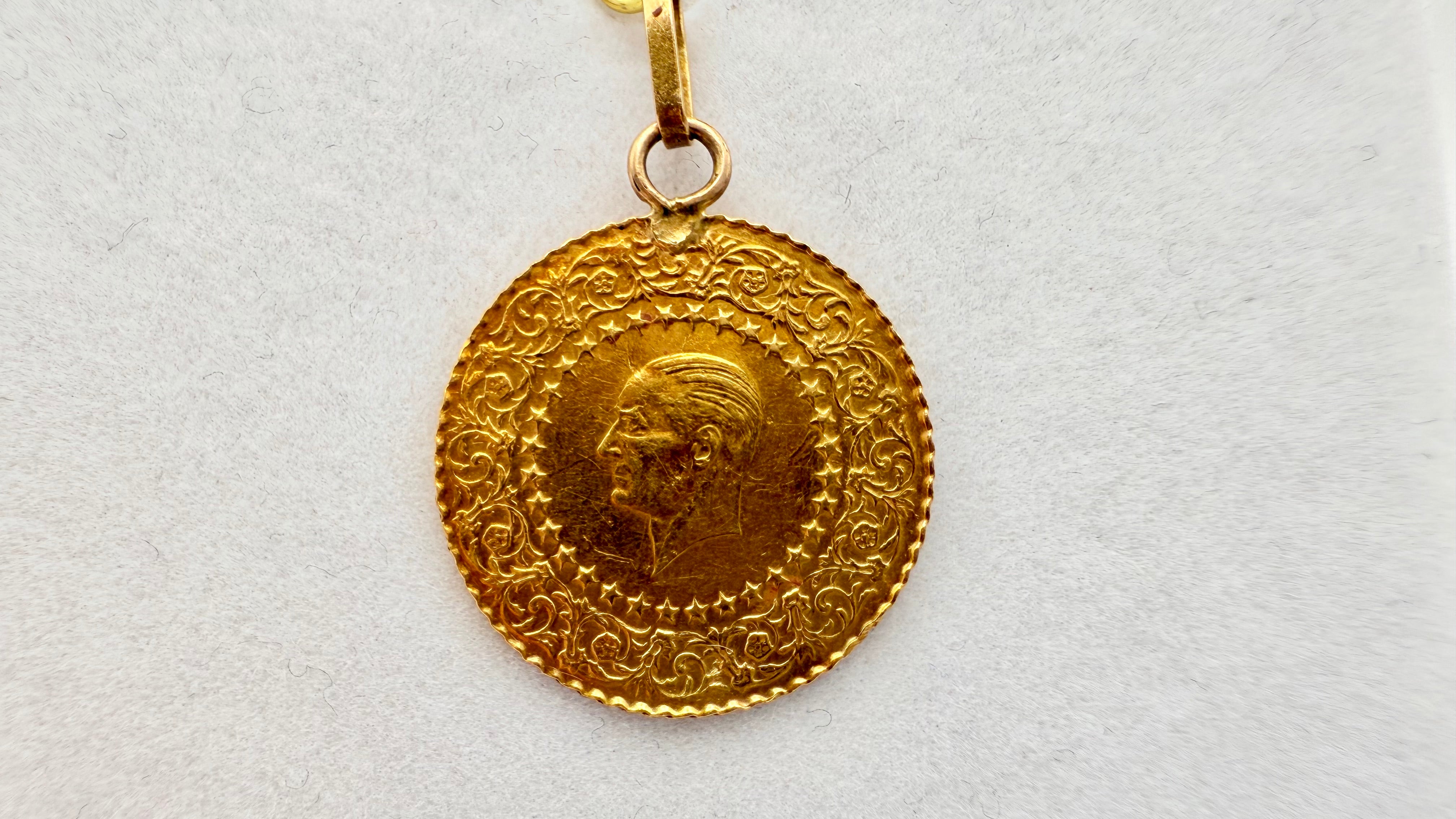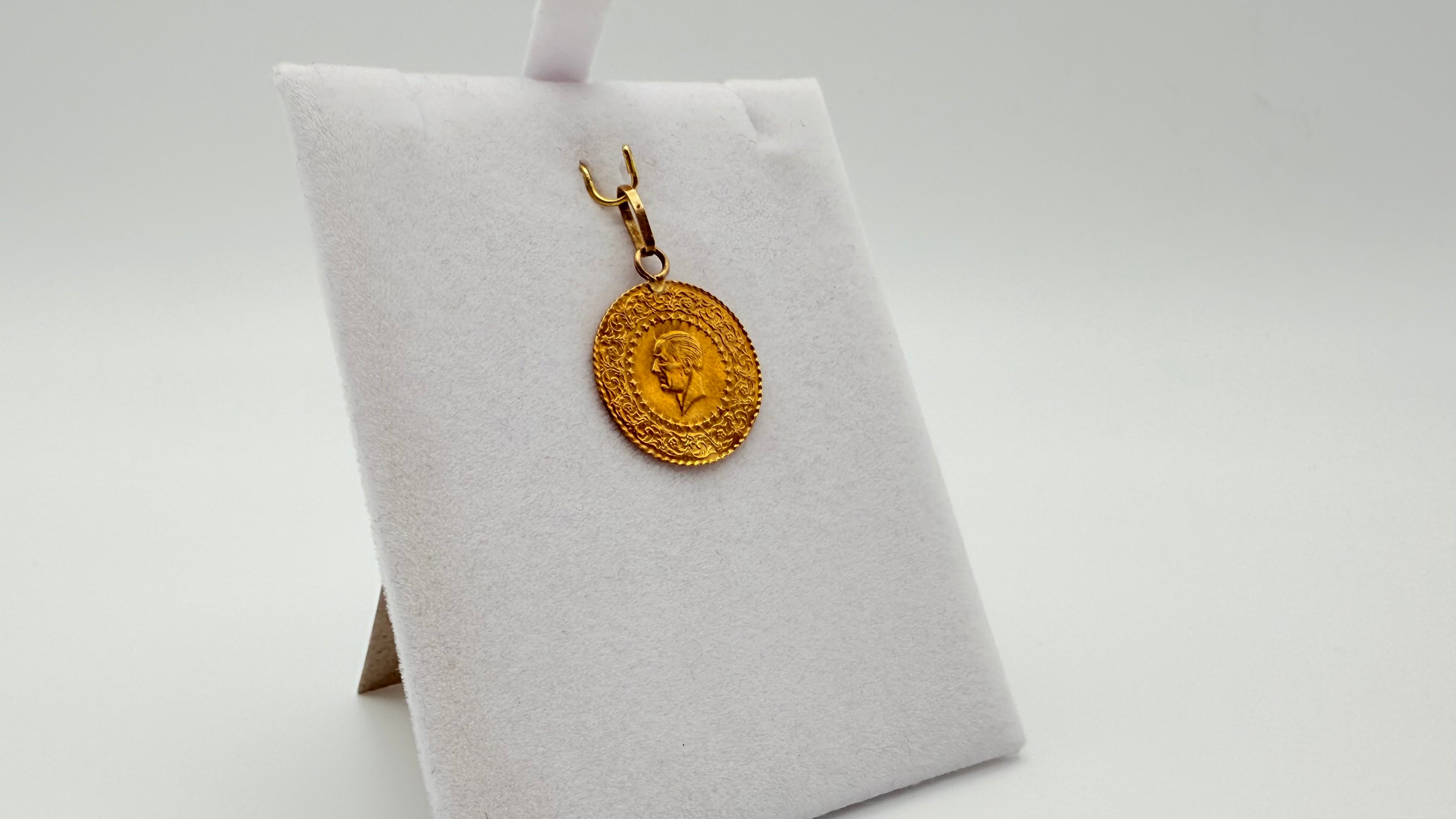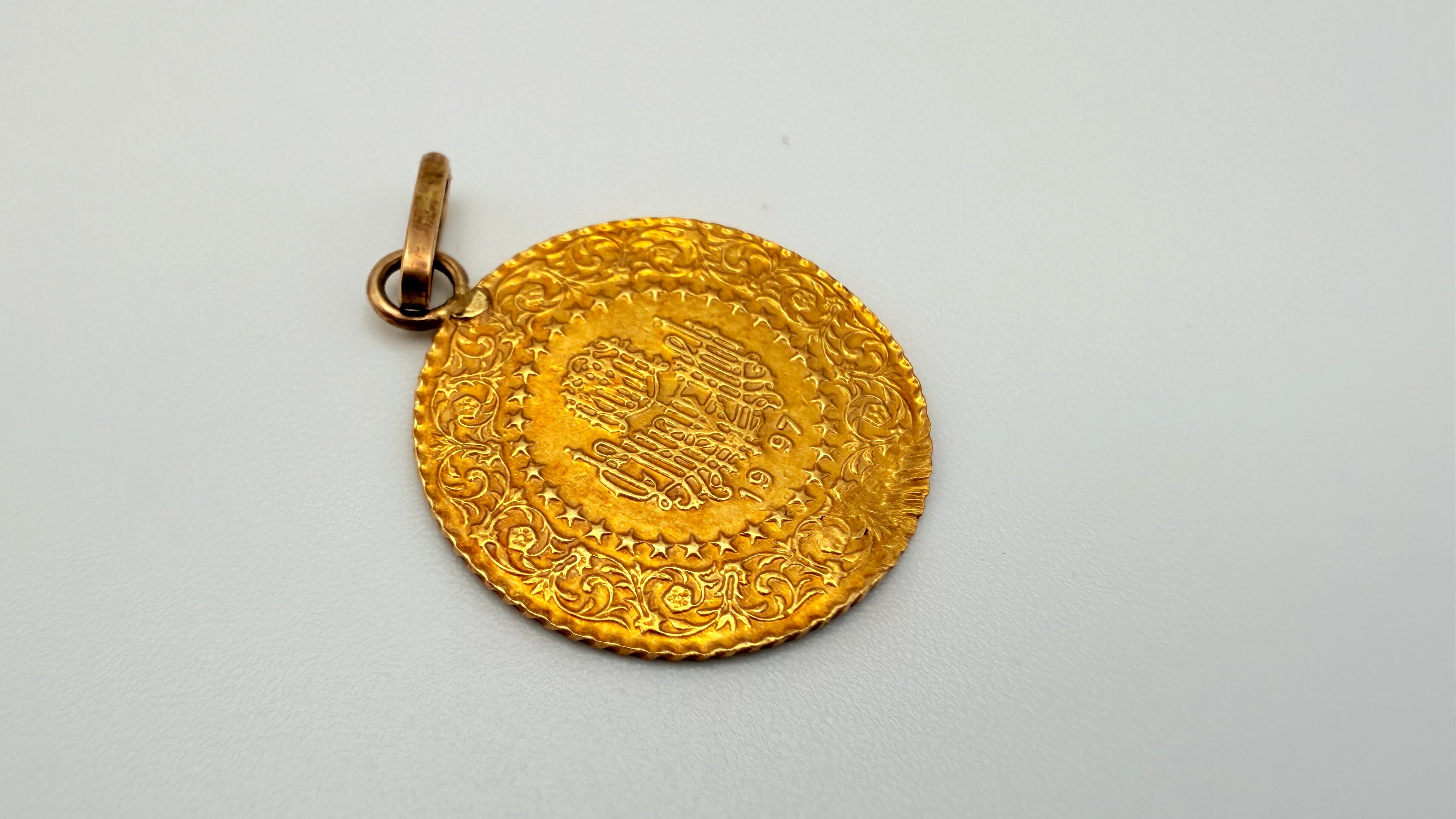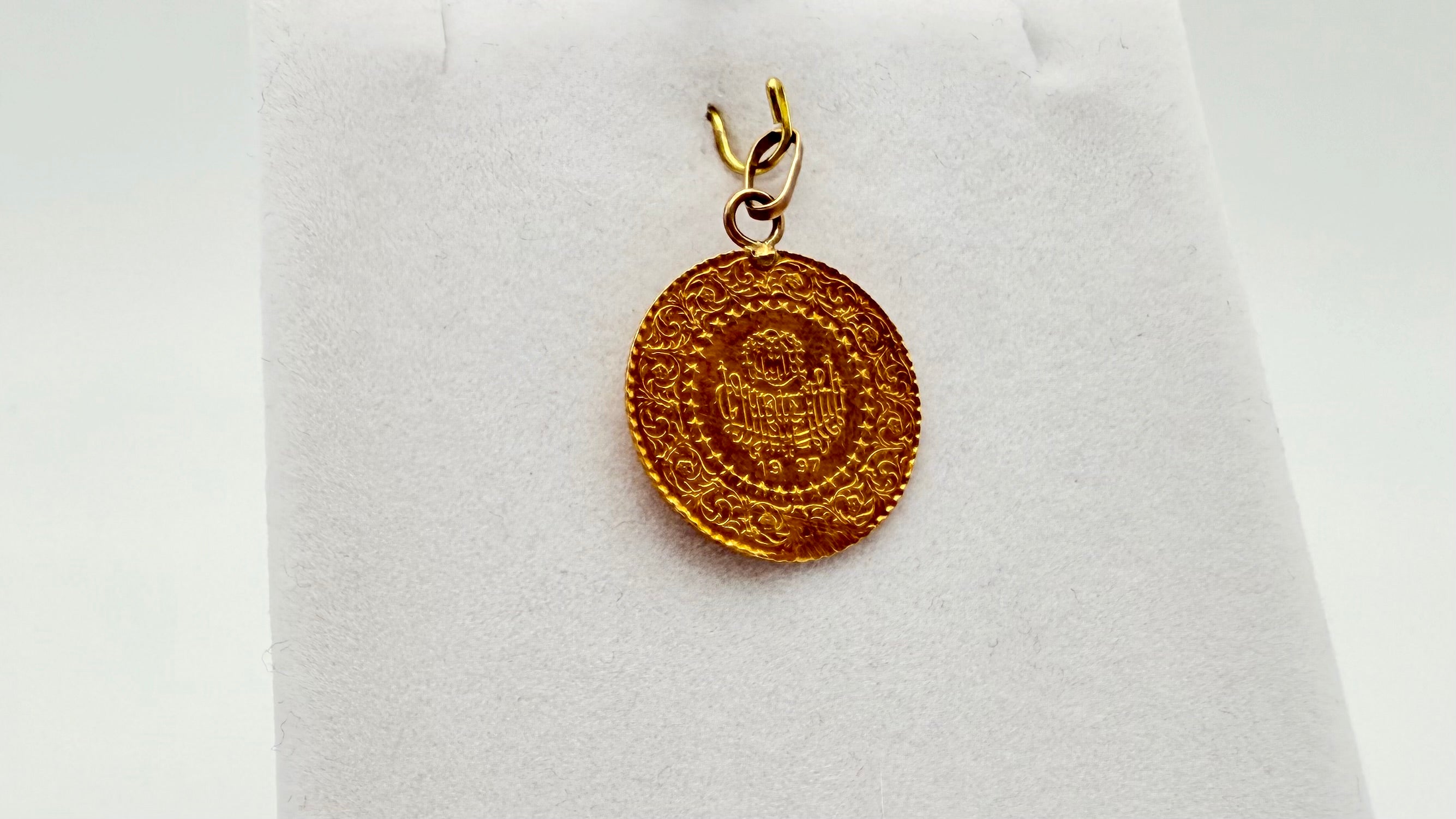 Pendentif de type médaille est en or jaune 18 carats (titrage 750/1000, poinçon 750). De forme ronde, il mesure 1,8 cm de hauteur et de largeur, avec une épaisseur de 0,1 cm, pour un poids de 1,88 gramme. Il se trouve en bon état.