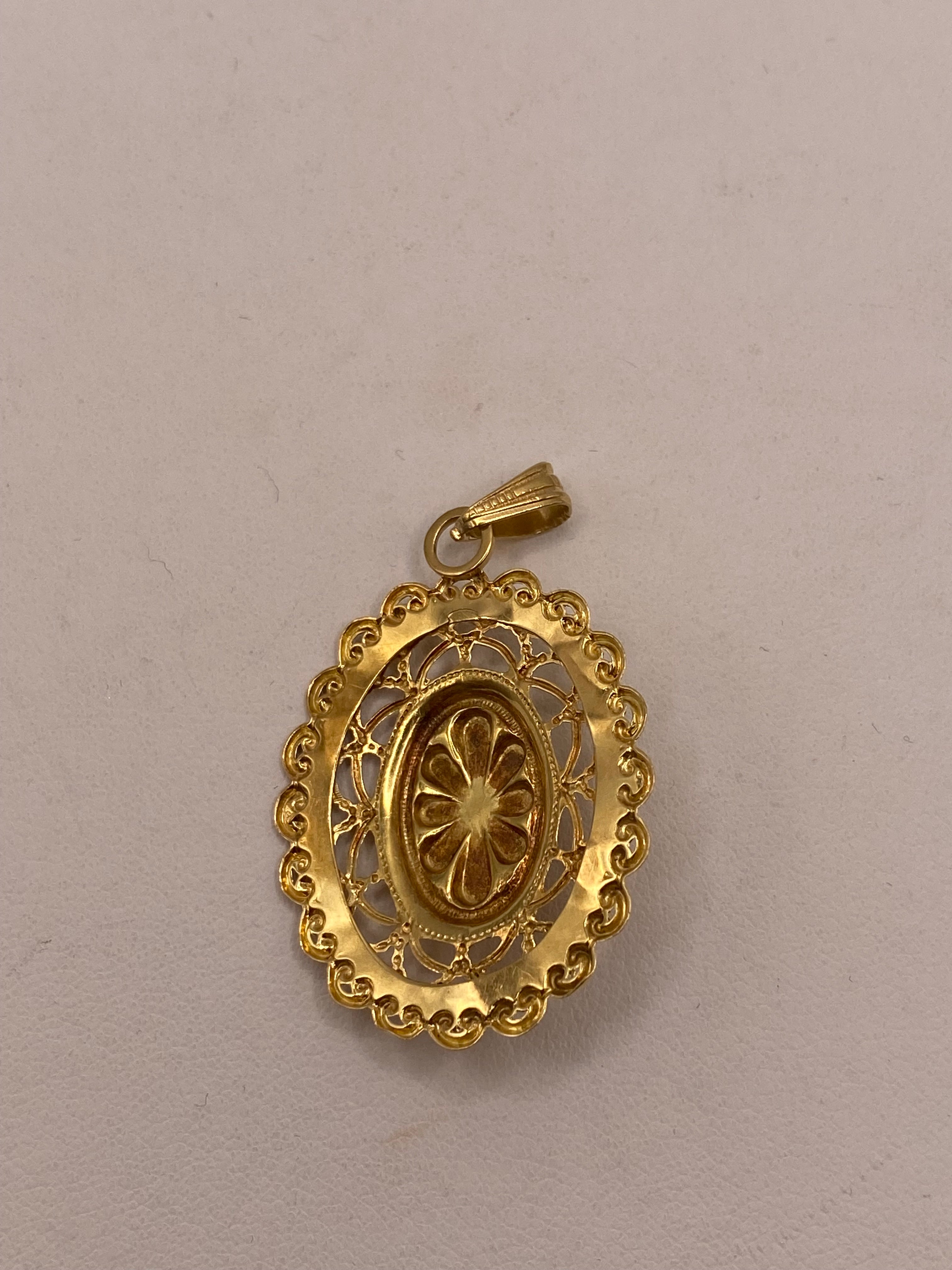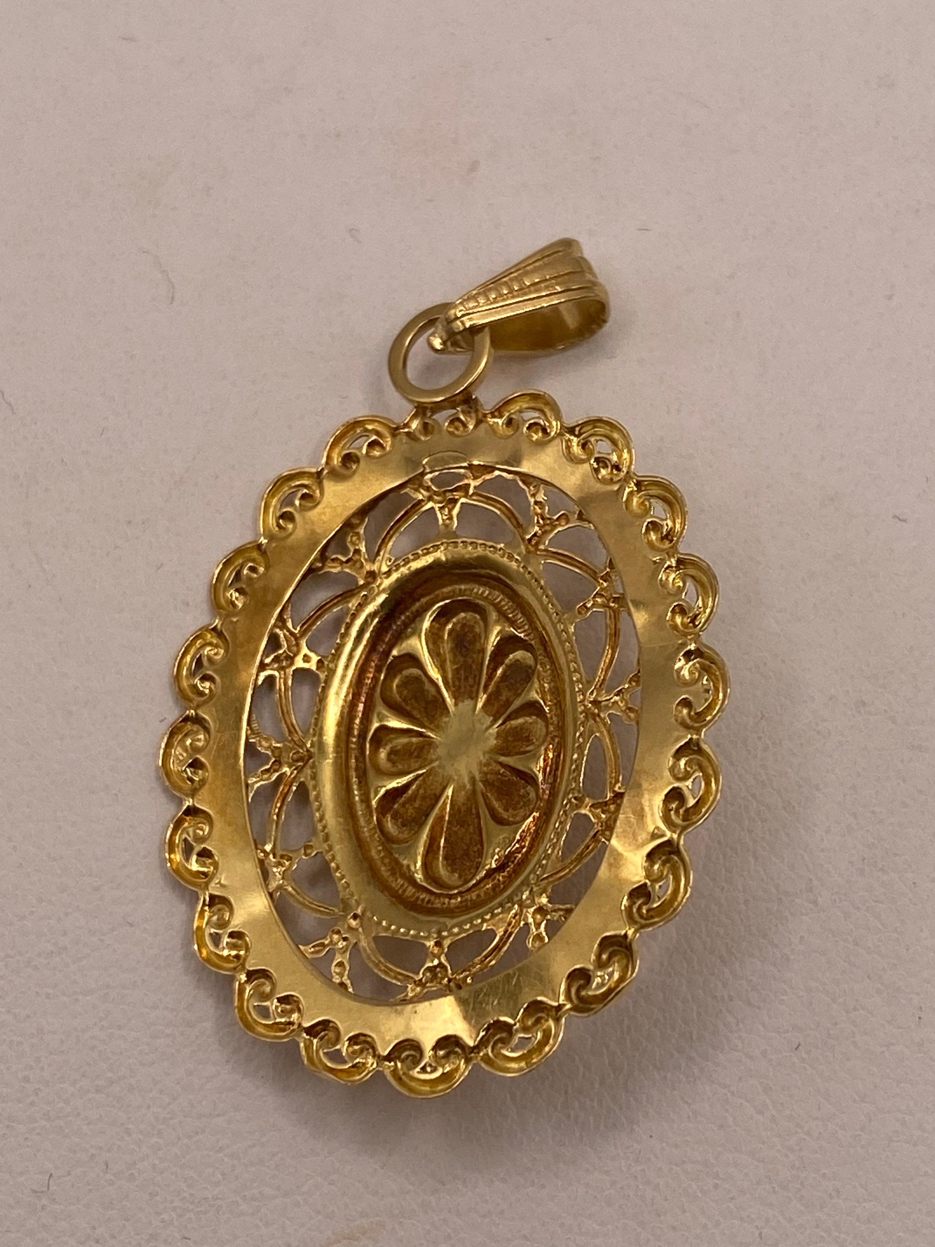 Pendentif de type médaillon est réalisé en or jaune 18 carats (750/1000) et porte le poinçon en forme de tête d’aigle, gage de son authenticité. Il affiche des dimensions généreuses avec une hauteur de 4,2 cm, une largeur de 2,7 cm et une épaisseur de 6 mm, pour un poids total de 3,13 grammes. . Ce pendentif est proposé en très bon état.