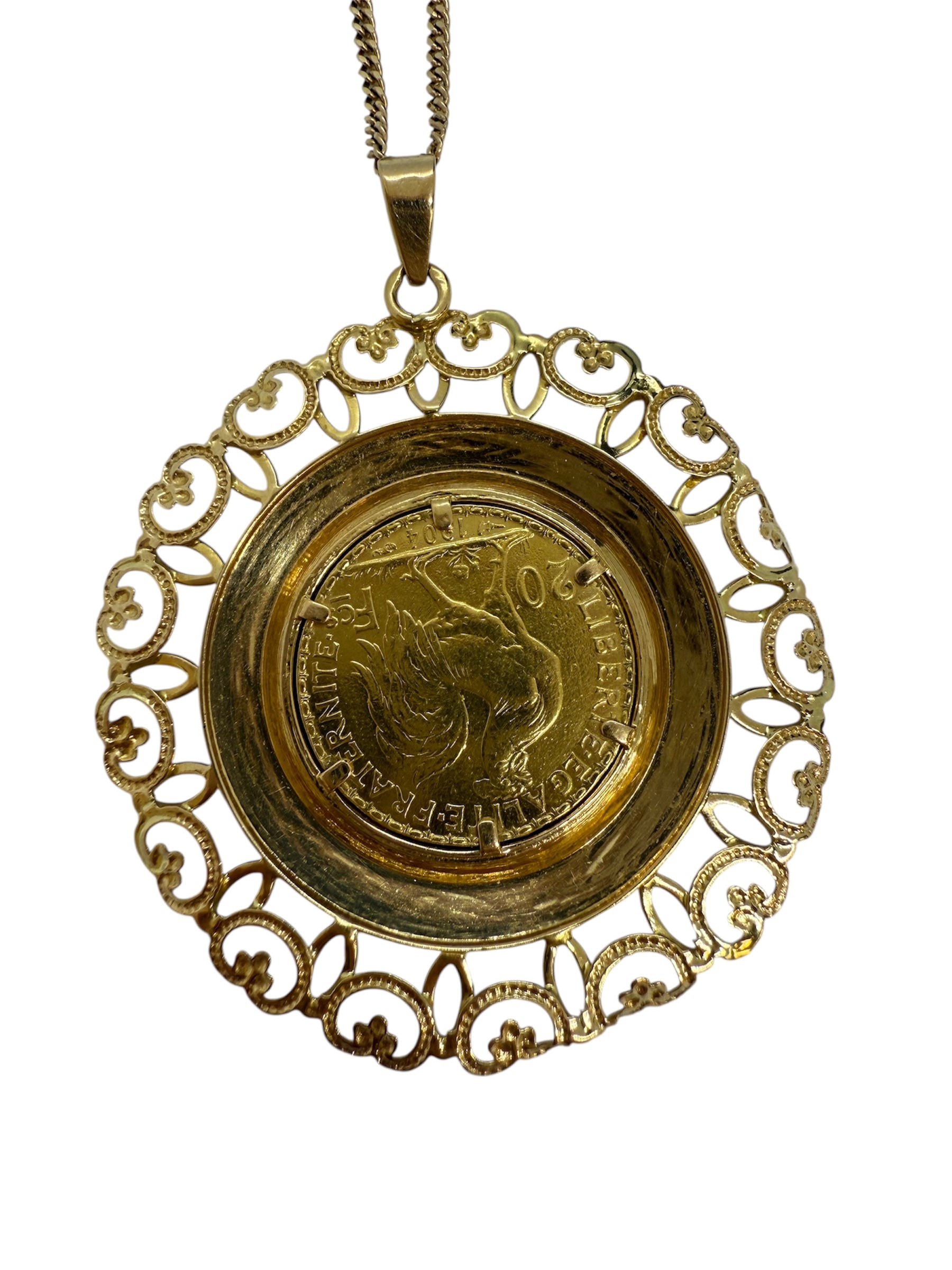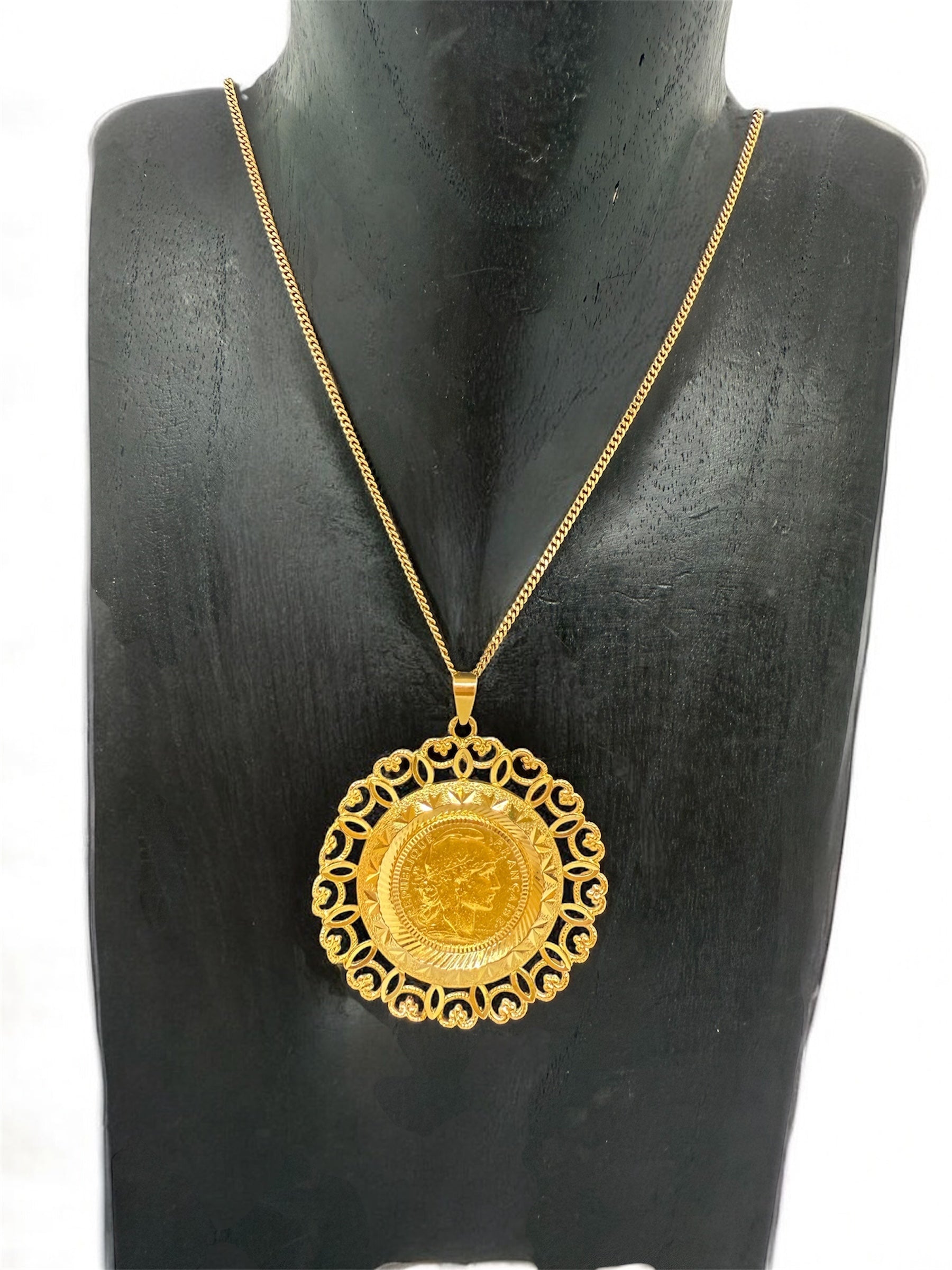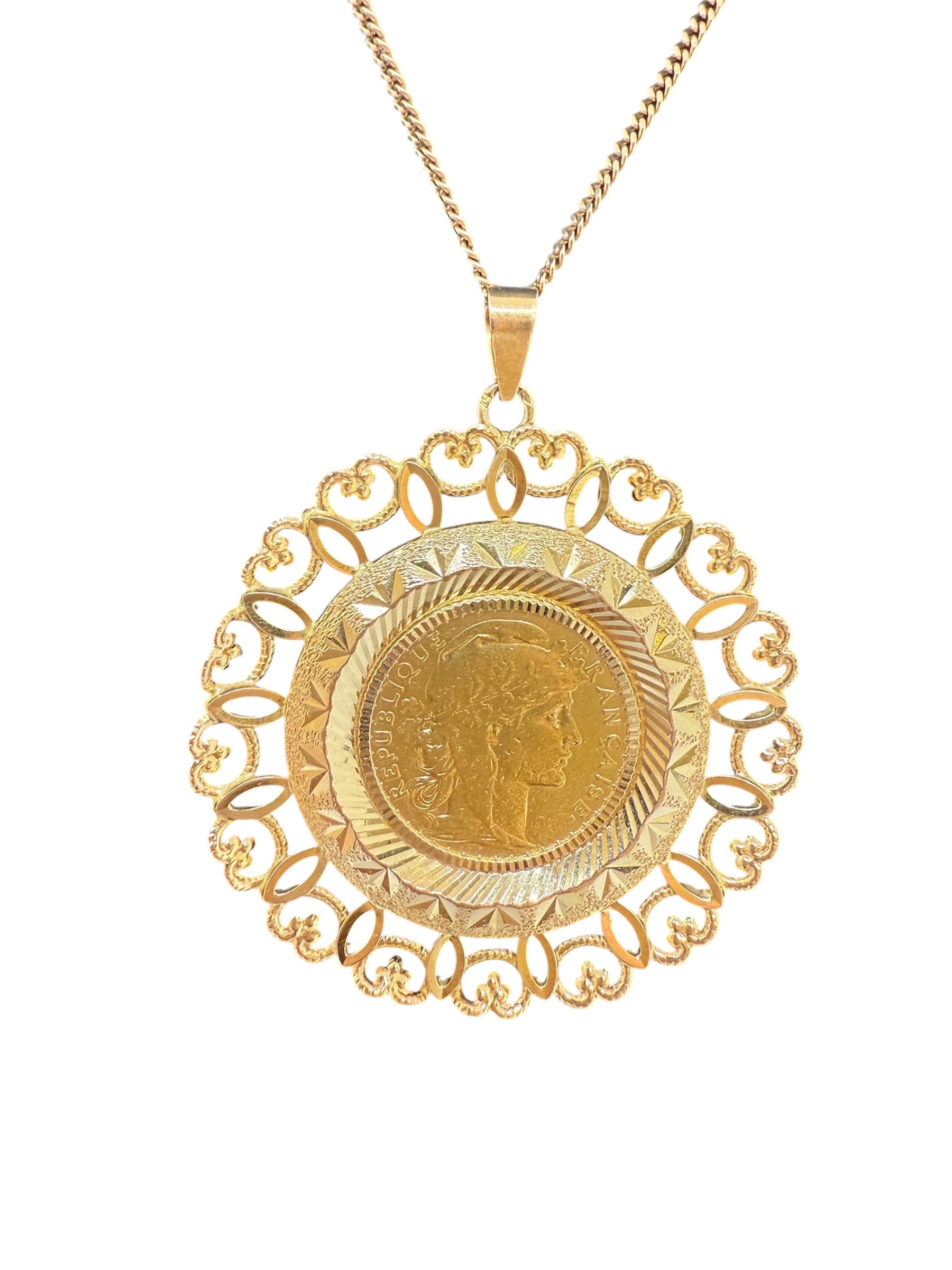 Pendentif de type porte-pièce en or jaune 18 carats (750/1000), sans poinçon, d’un poids de 13,58 grammes. Il mesure 44 mm de hauteur et de largeur, avec une épaisseur de 1 mm. Sans pierres, ce modèle au design épuré et intemporel est en très bon état.