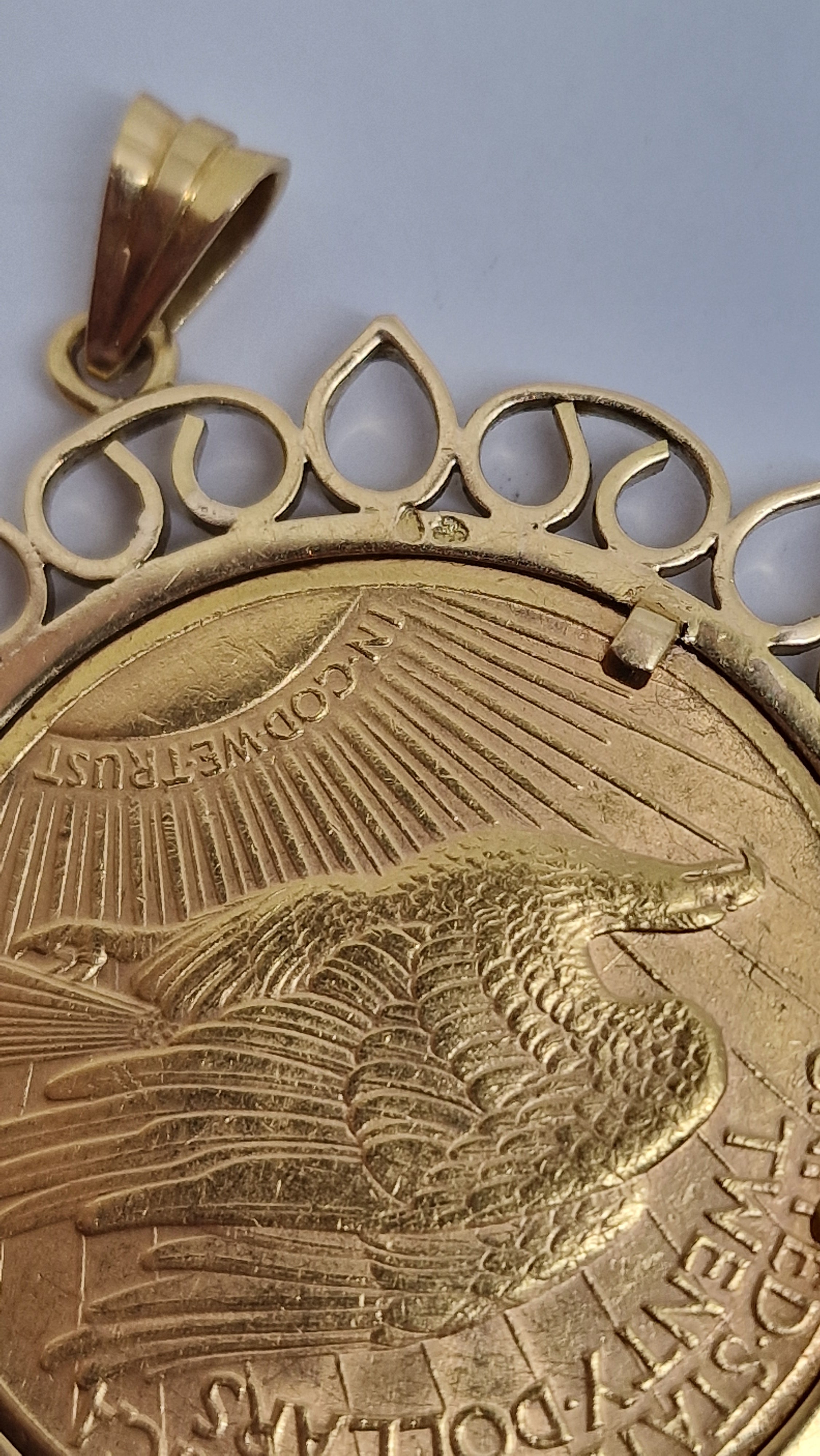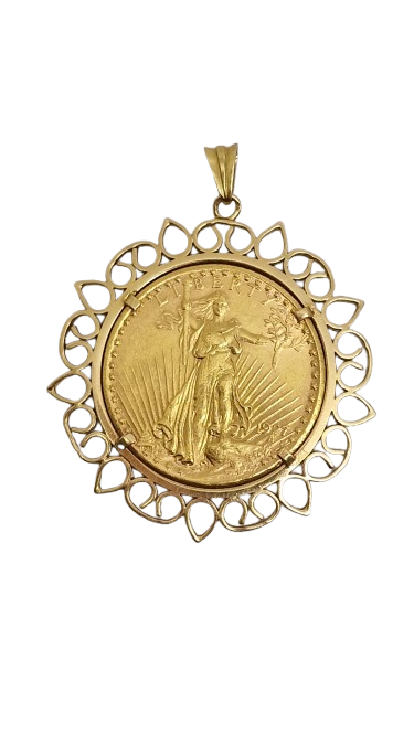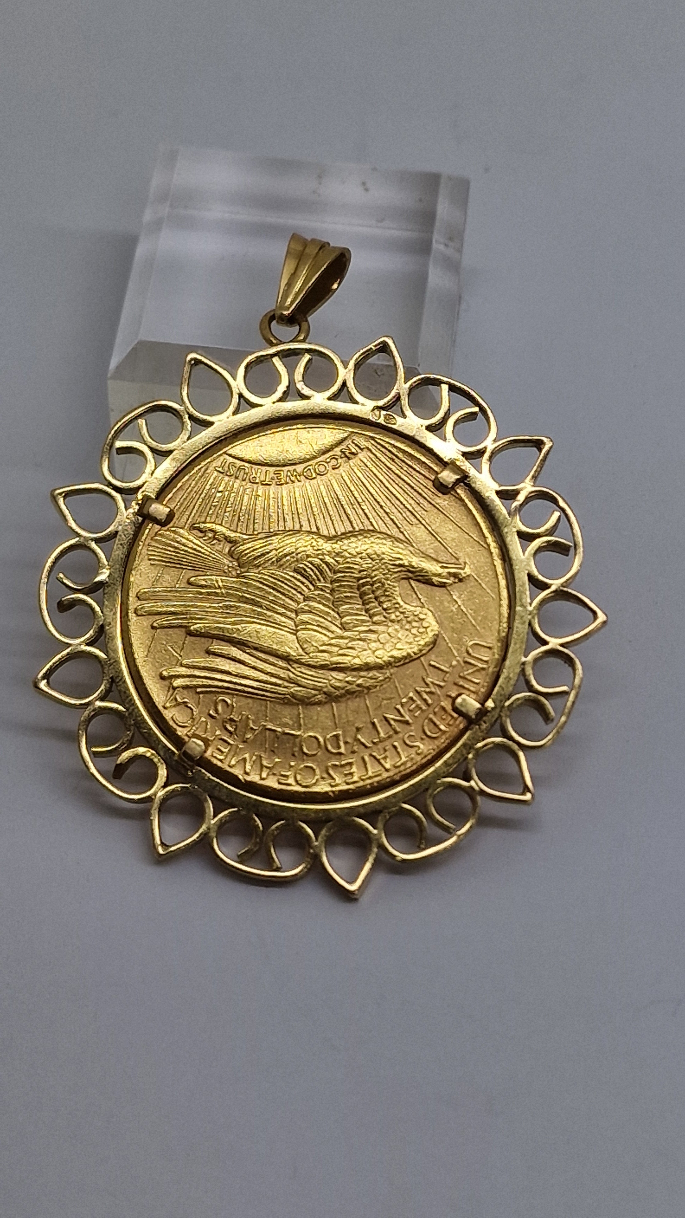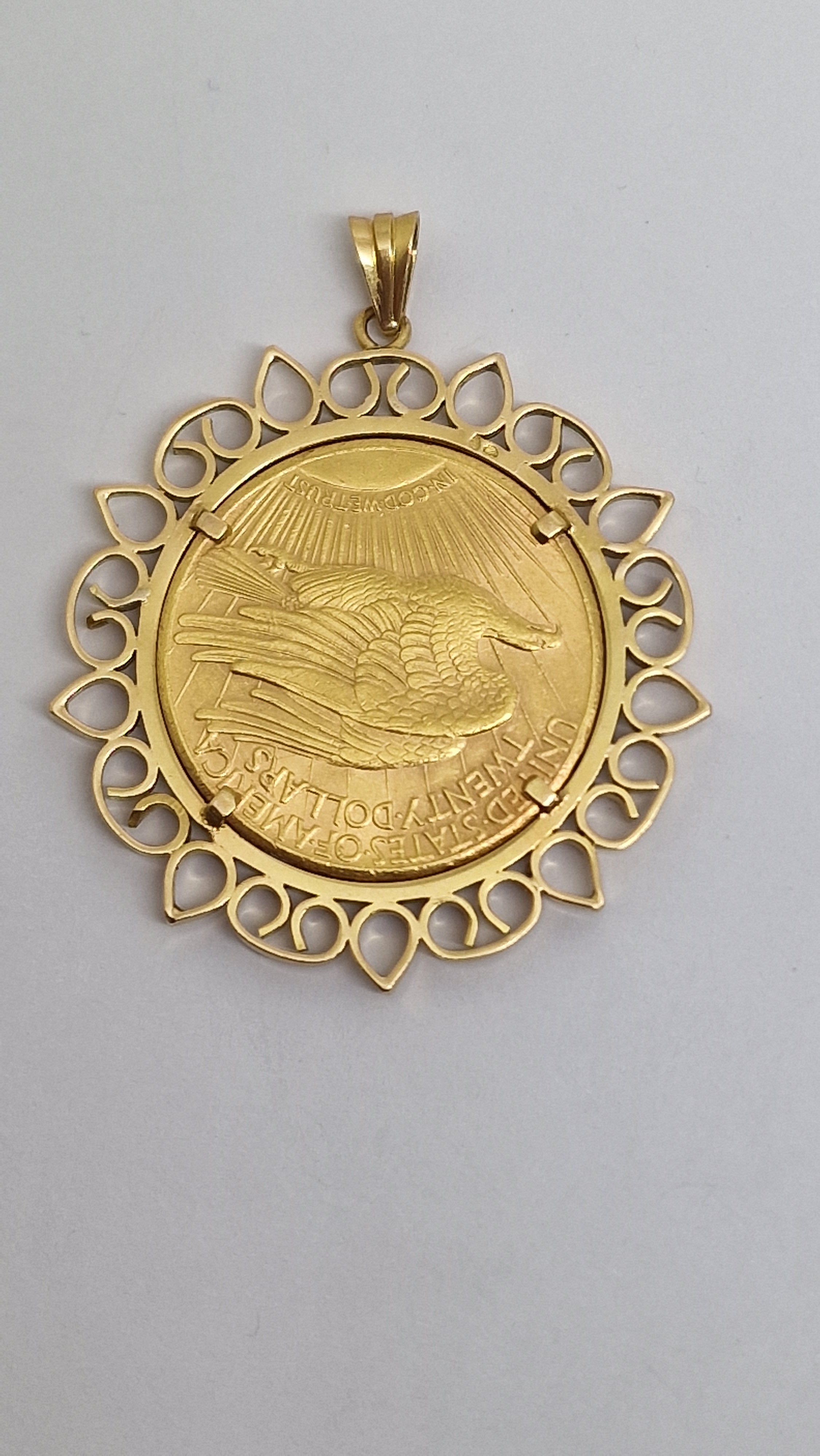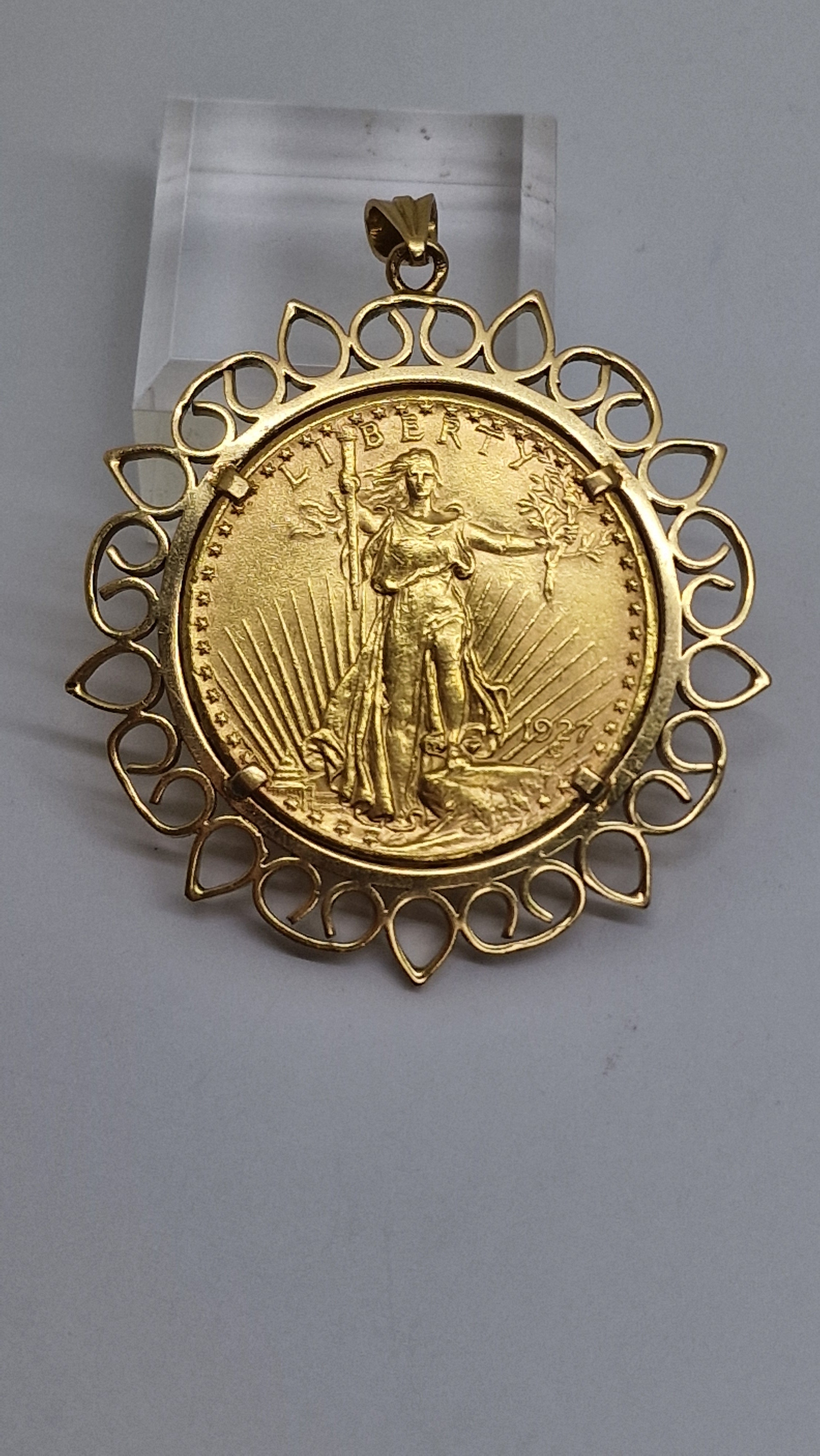 Laissez vous succomber par ce Ravissant Pendentif Porte Pièce OR 18 carats (750/1000) avec sa pièce 20 dollars de 1927 OR 22 carats (916/1000).