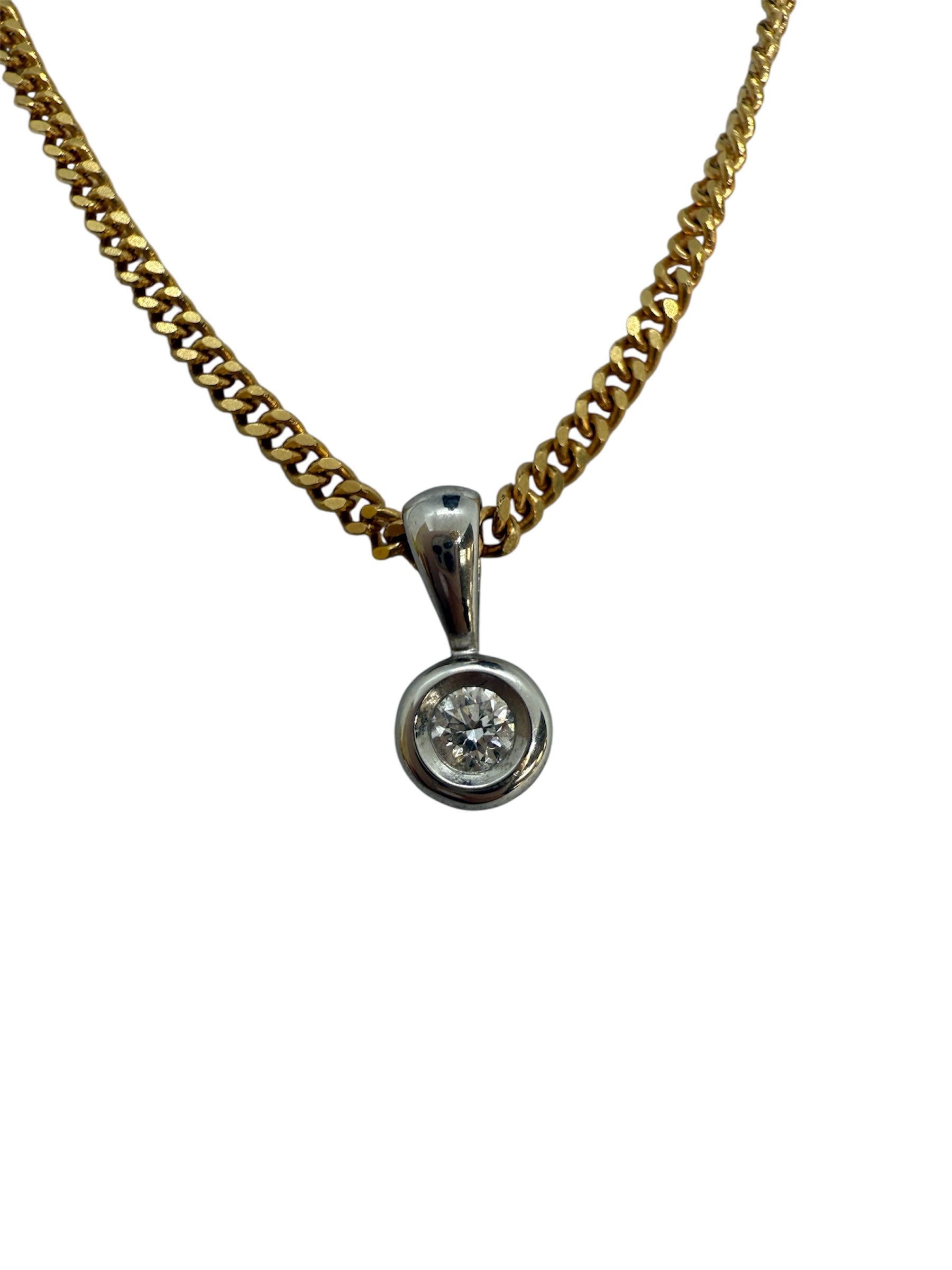 Pendentif solitaire en or blanc 18 carats (750/1000), bien qu’il ne porte pas de poinçon, est en très bon état. Discret et élégant, il est orné d’un diamant unique de 0,17 carat, qui lui confère éclat et raffinement. Avec un poids de 0,98 gramme, il mesure 12 mm de hauteur, 6 mm de largeur et 2 mm d’épaisseur.