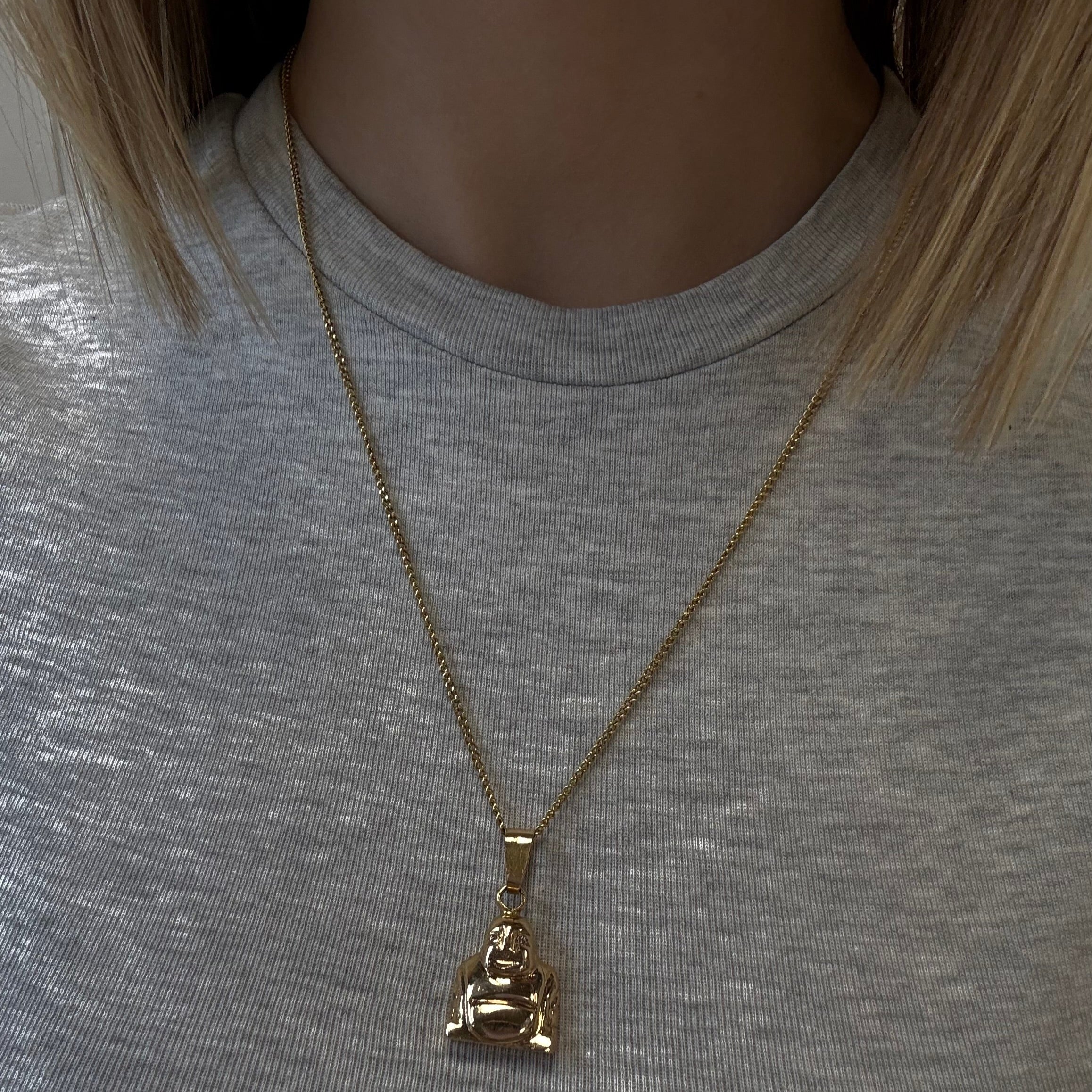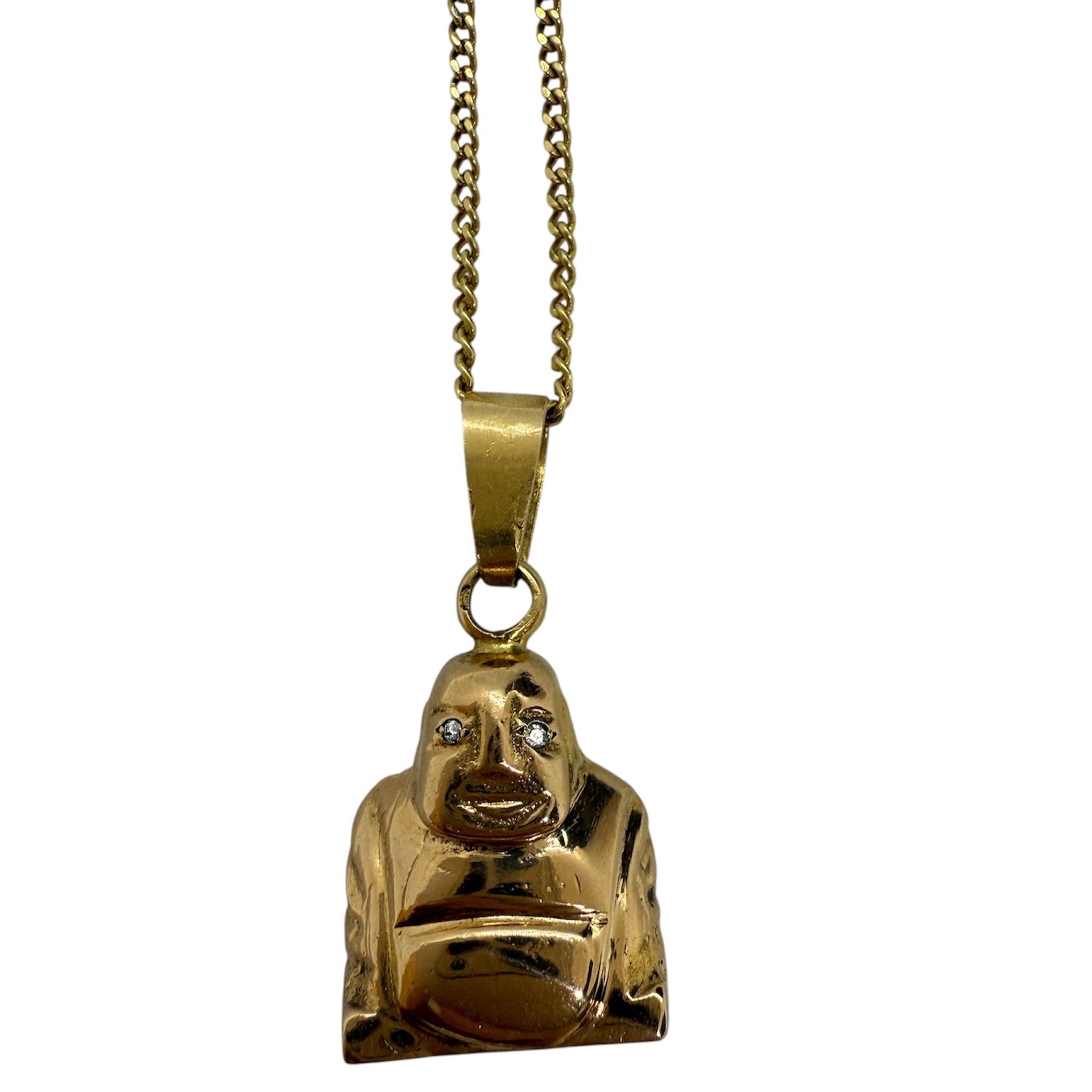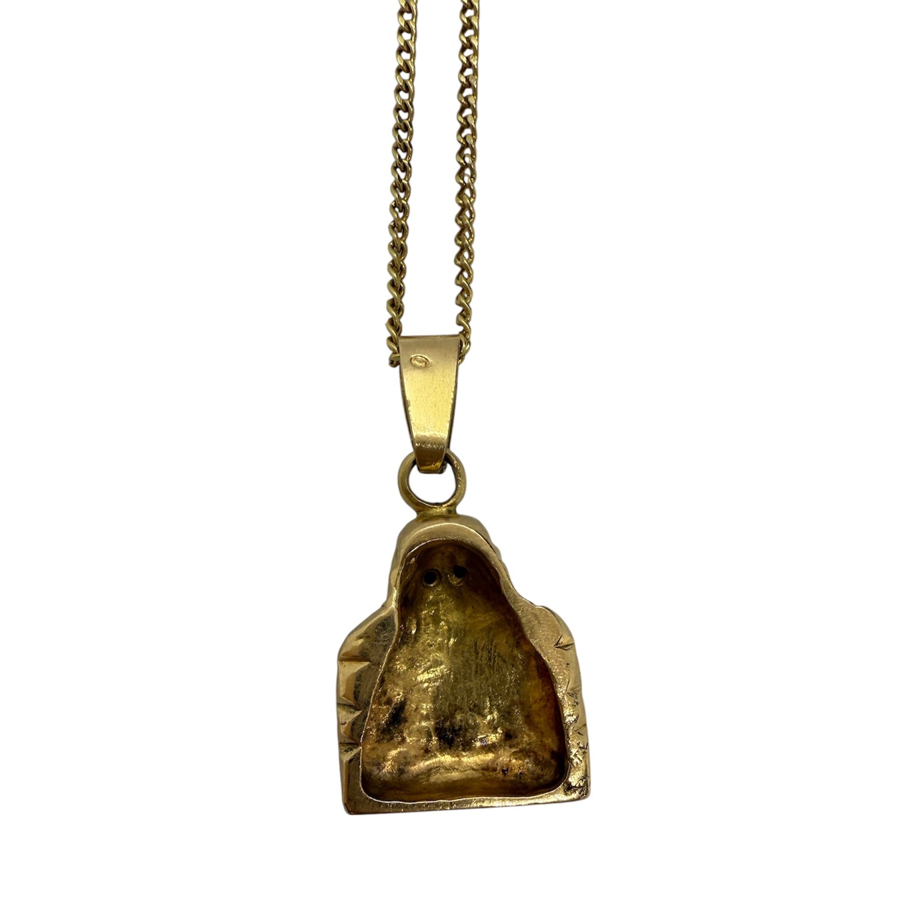 Pendentif solitaire en or jaune 18 carats (750/1000), sans poinçon, avec un poids de 14,94 grammes. Il mesure 34 mm de hauteur, 17 mm de largeur et 5 mm d’épaisseur. Ce bijou est orné de deux éclats de diamants totalisant 0,01 carat. Il est en très bon état.