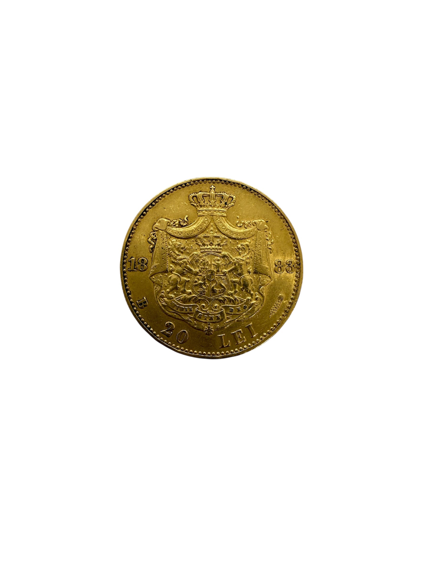 Pièce de 20 lei roumains frappée entre 1883 et 1890, représentant Carol I, dans le cadre de l’Union Latine. Réalisée en or jaune 900/1000 (20 carats), elle pèse 6,42 grammes et mesure 20 mm de diamètre pour 0,5 mm d’épaisseur. Cette pièce est en très bon état.