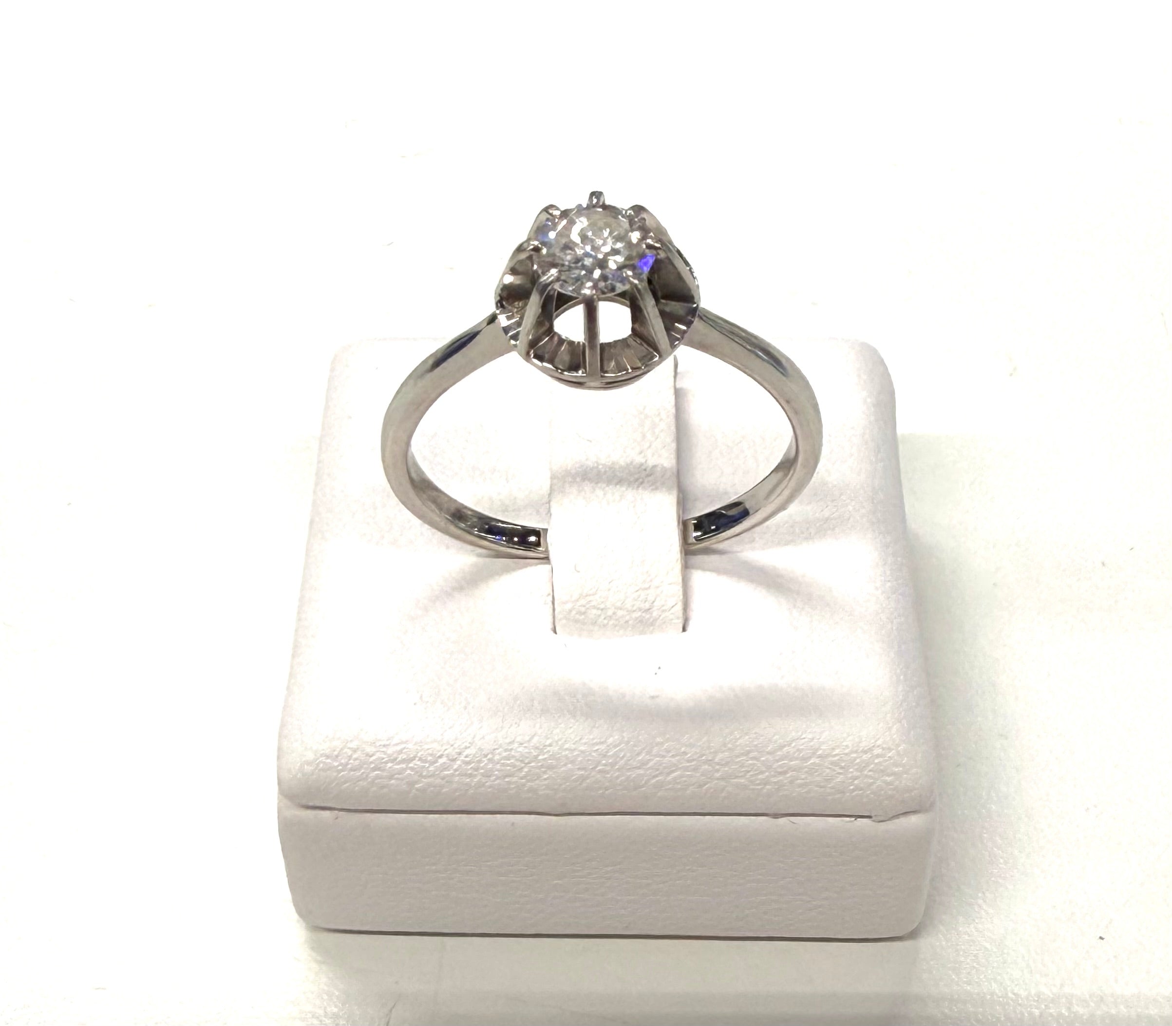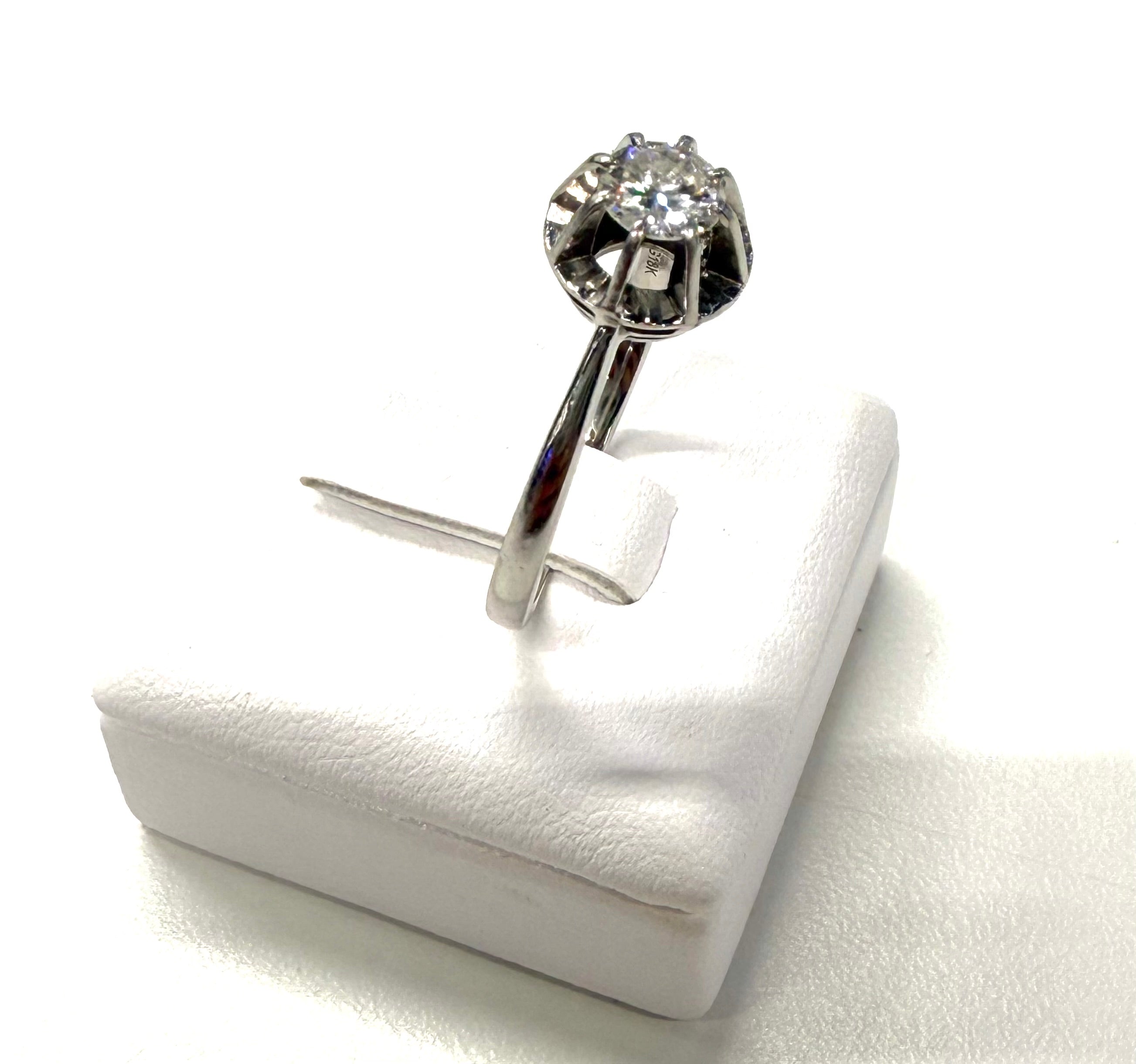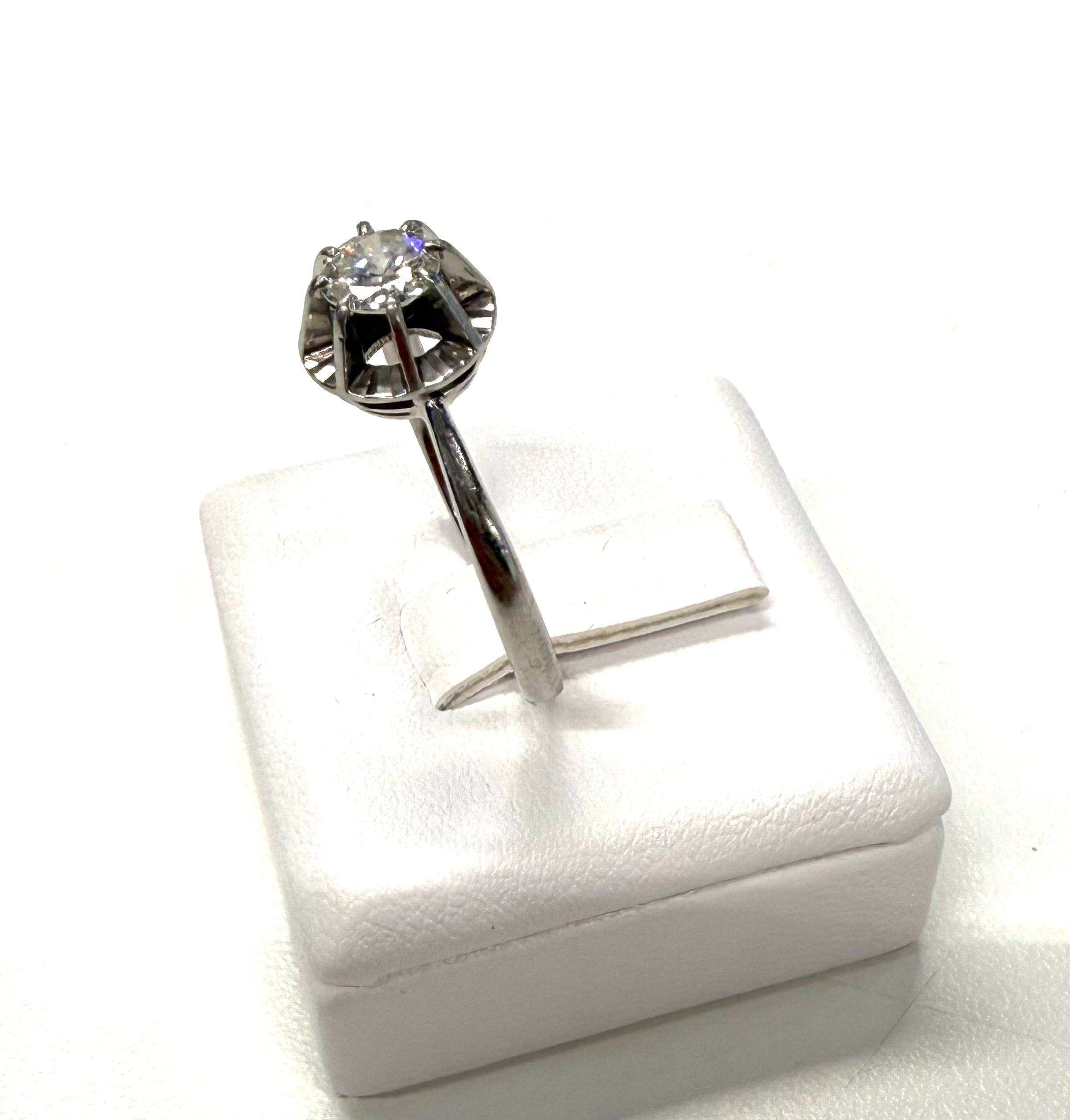 Cette magnifique bague solitaire en or blanc 18 carats (750/1000), poinçonnée 18K, incarne la pureté et l’élégance intemporelle. Avec un poids de 2,79 grammes et une taille 55, elle offre un port délicat et raffiné. Son diamant central de 0,50 carat capte la lumière avec une brillance exquise, sublimant chaque mouvement de la main.