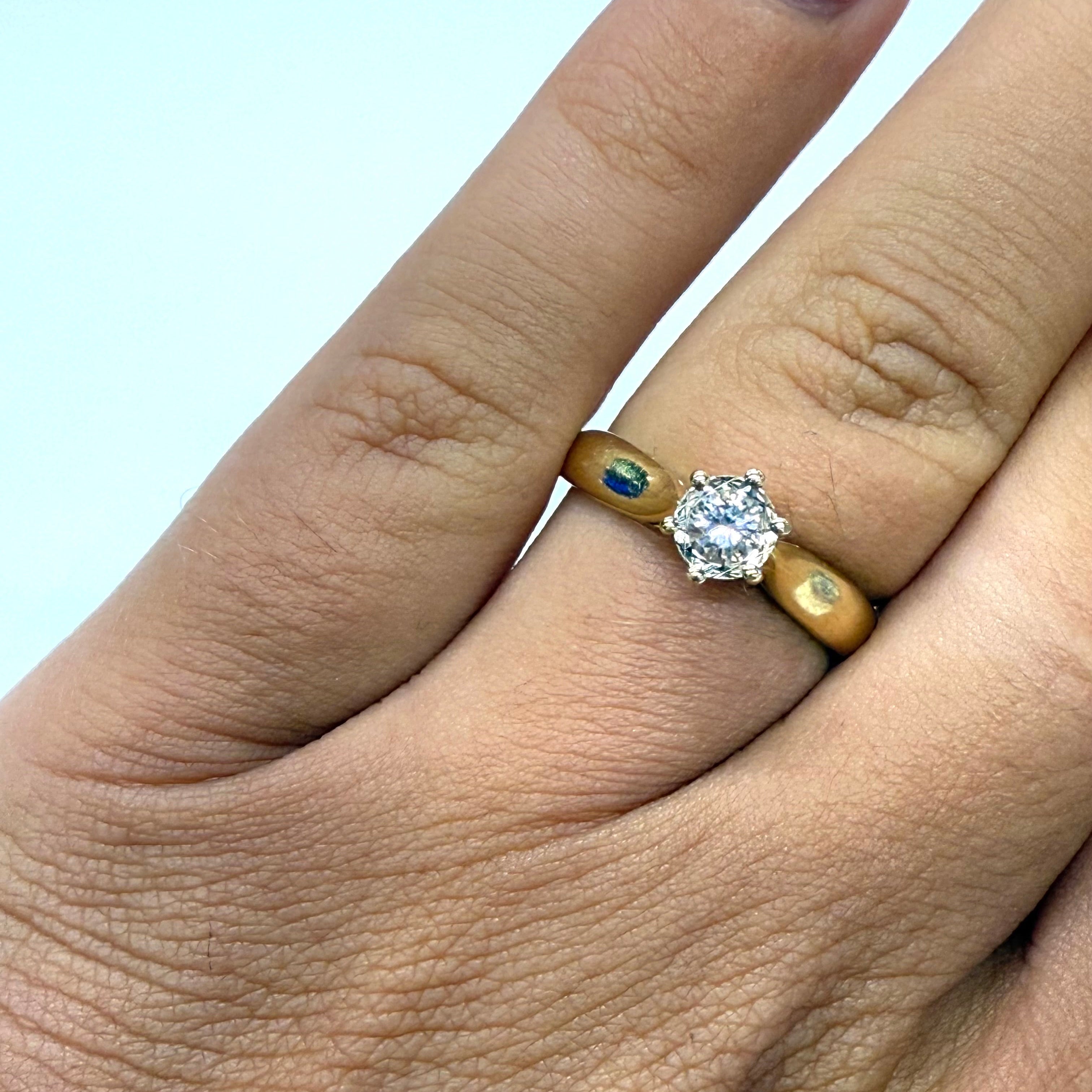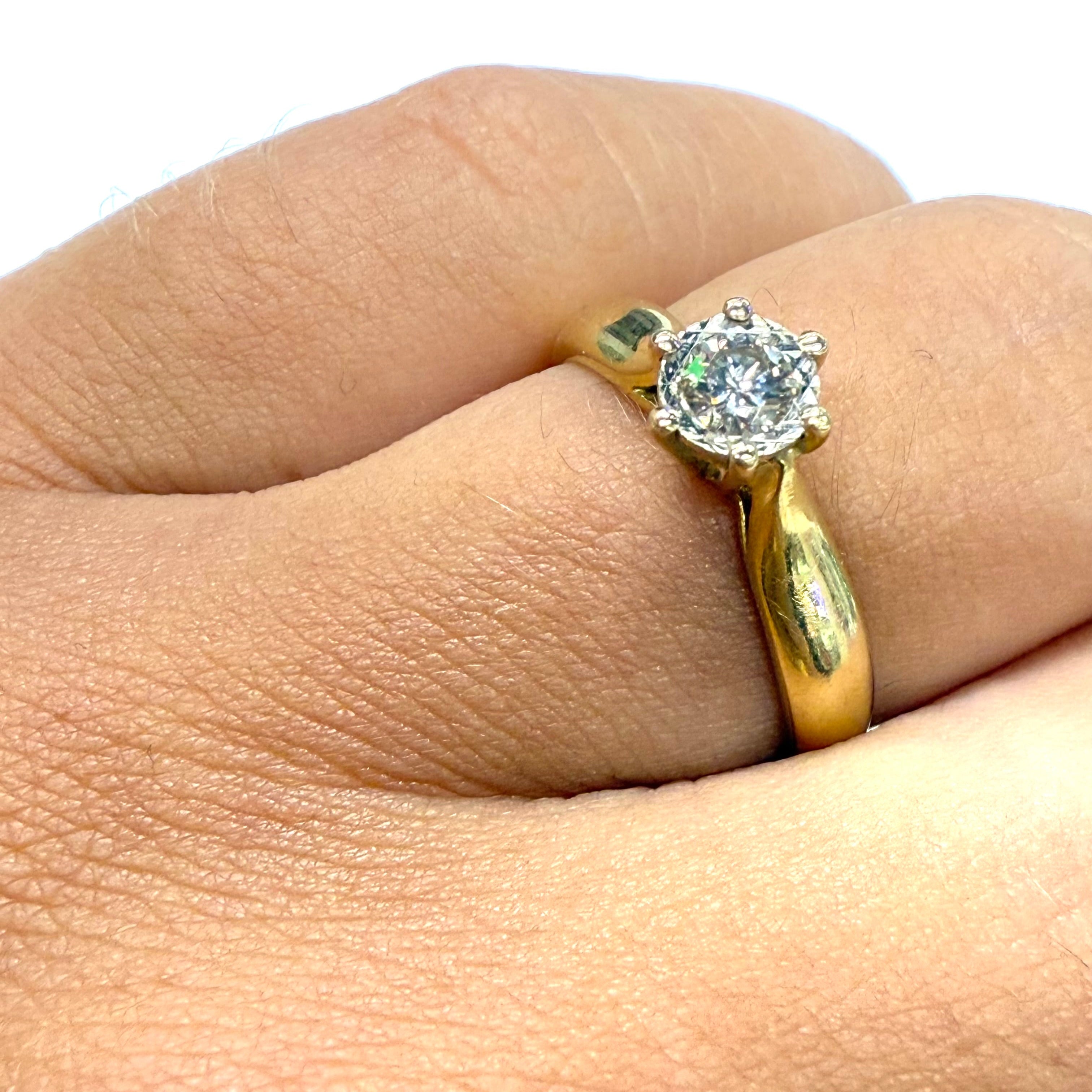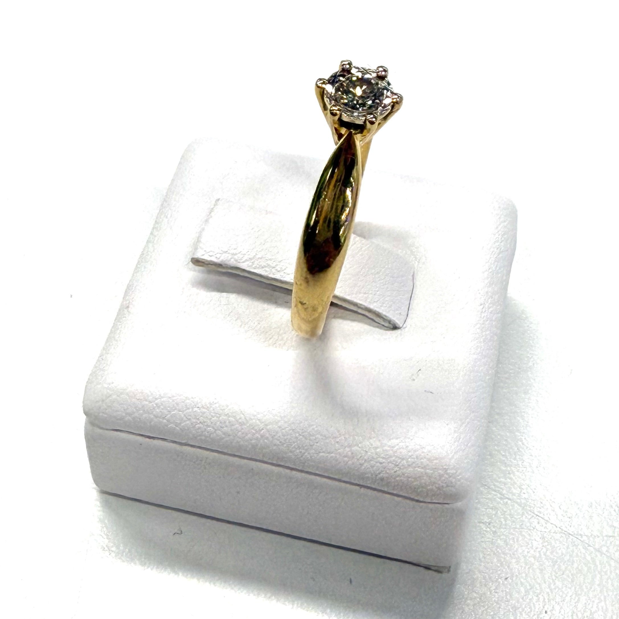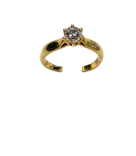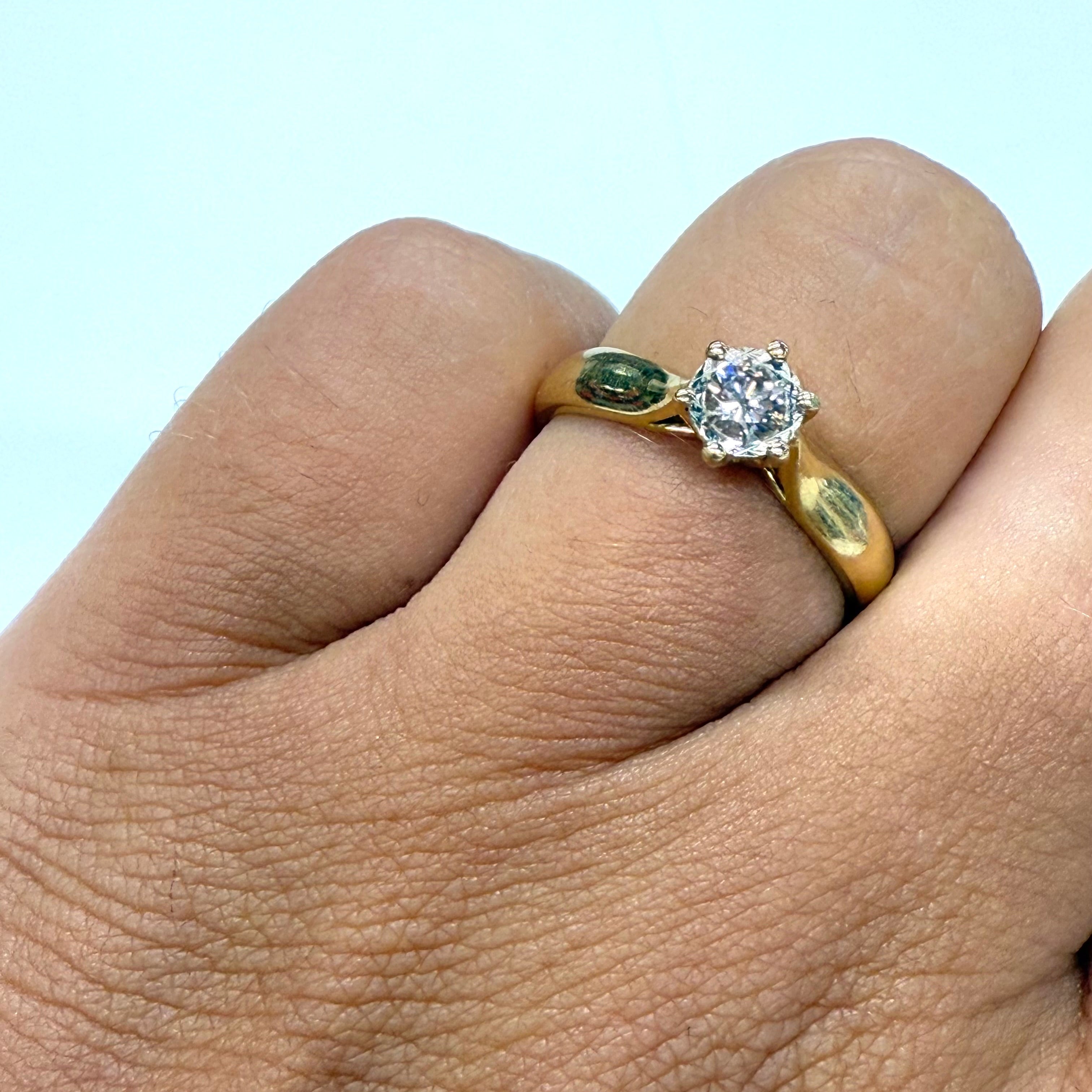 Bague solitaire en or jaune 18 carats (750/1000), poinçonnée Tête d’Aigle, témoignant de son authenticité. Elle pèse 3,49 grammes et est proposée en taille 53. Ce bijou est orné d’un diamant unique d’environ 0,4 cm, apportant une touche d’élégance discrète. L’ensemble est en très bon état.