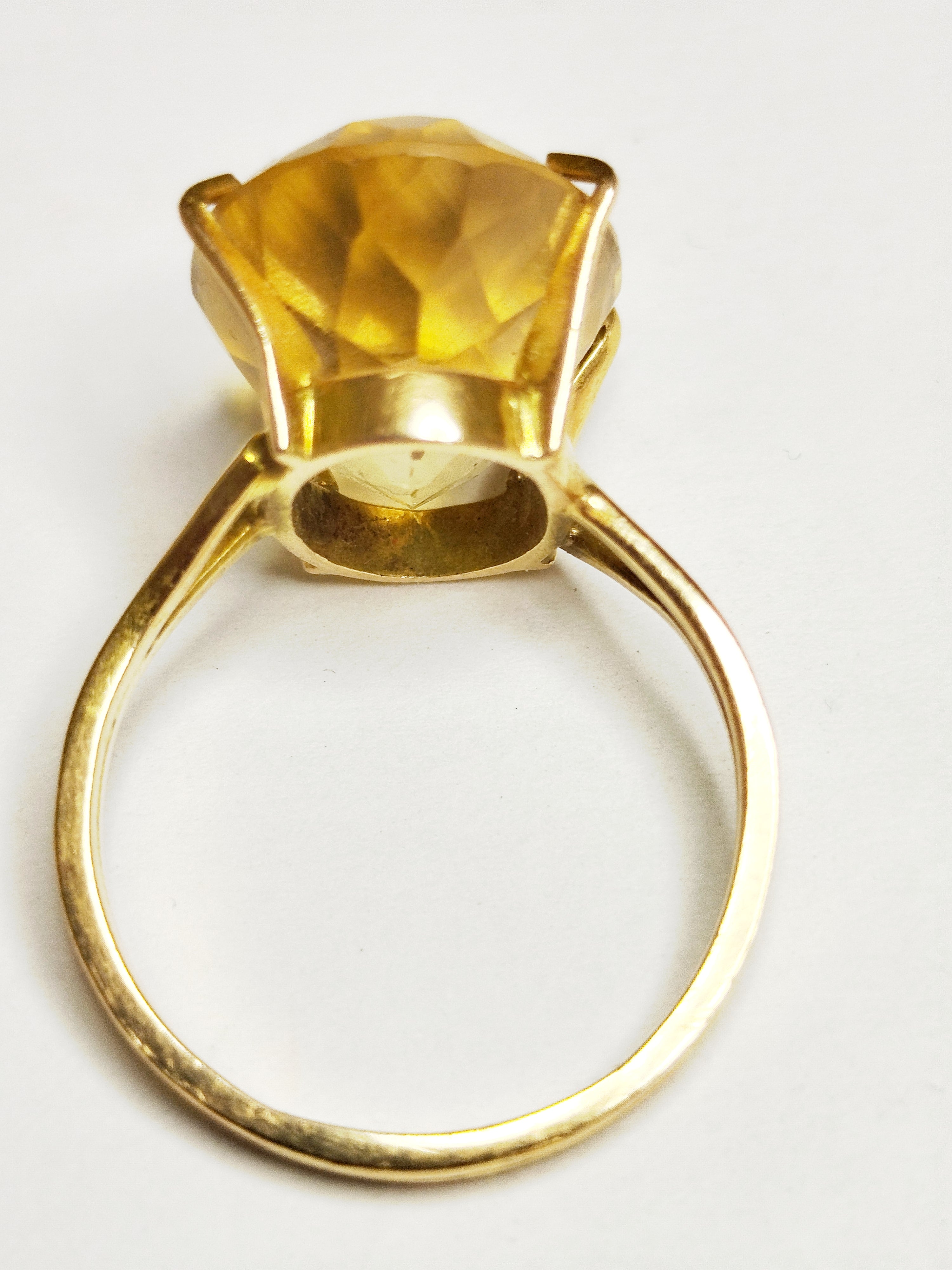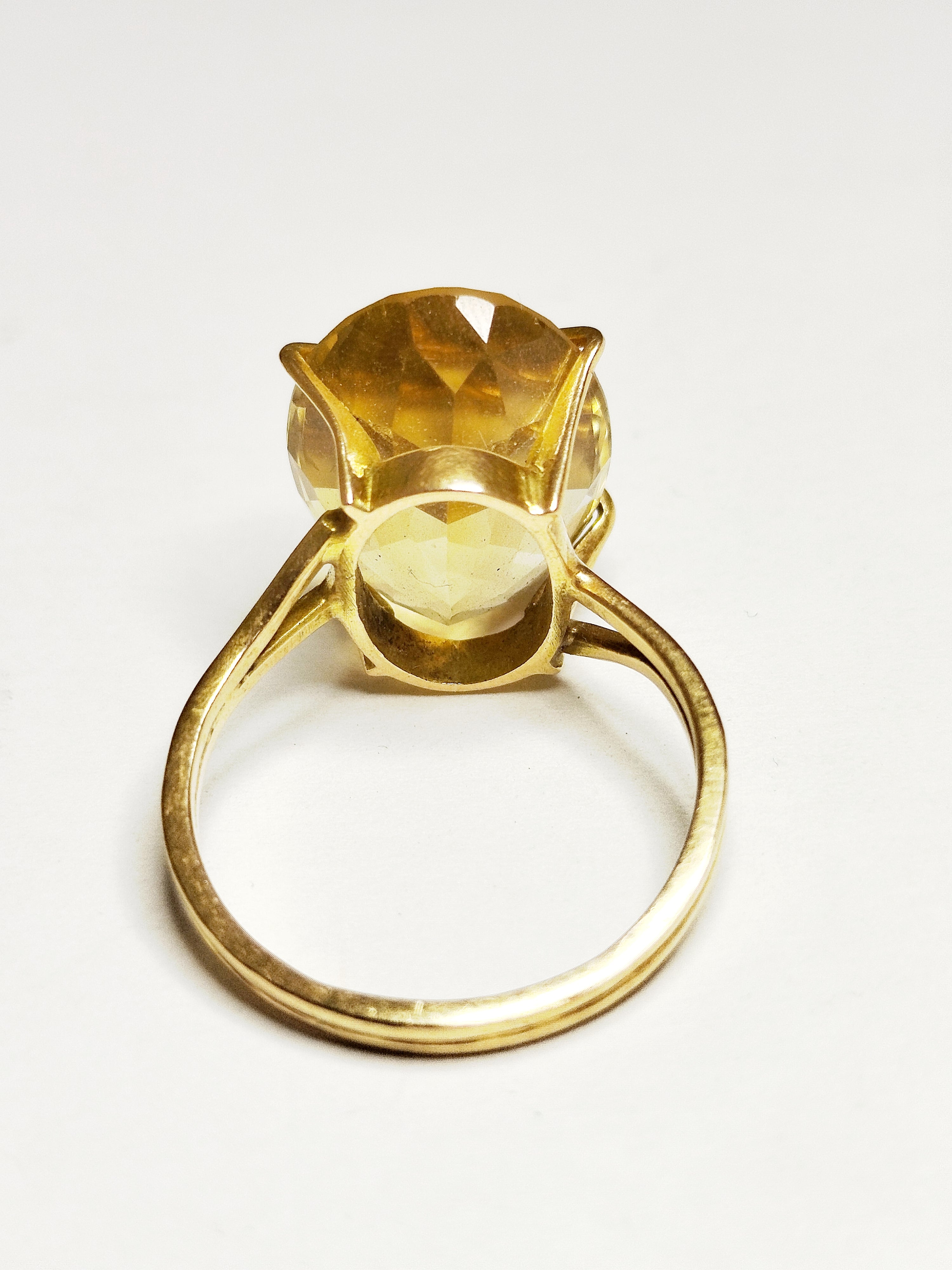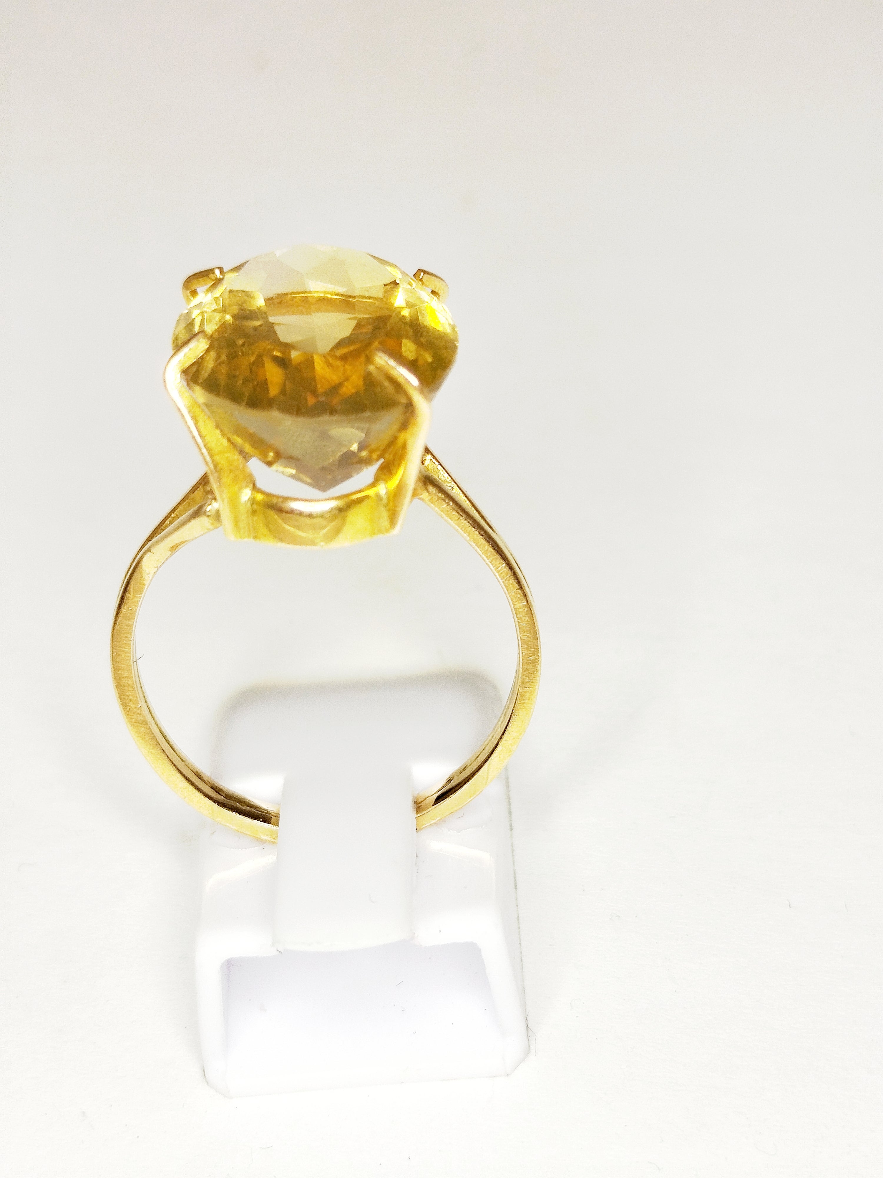 Bague empierrée en or jaune 18 carats (750/1000), de taille 59, ornée d’une citrine. Elle pèse 5,87 grammes et ne comporte pas de poinçon. L’ensemble est en très bon état.