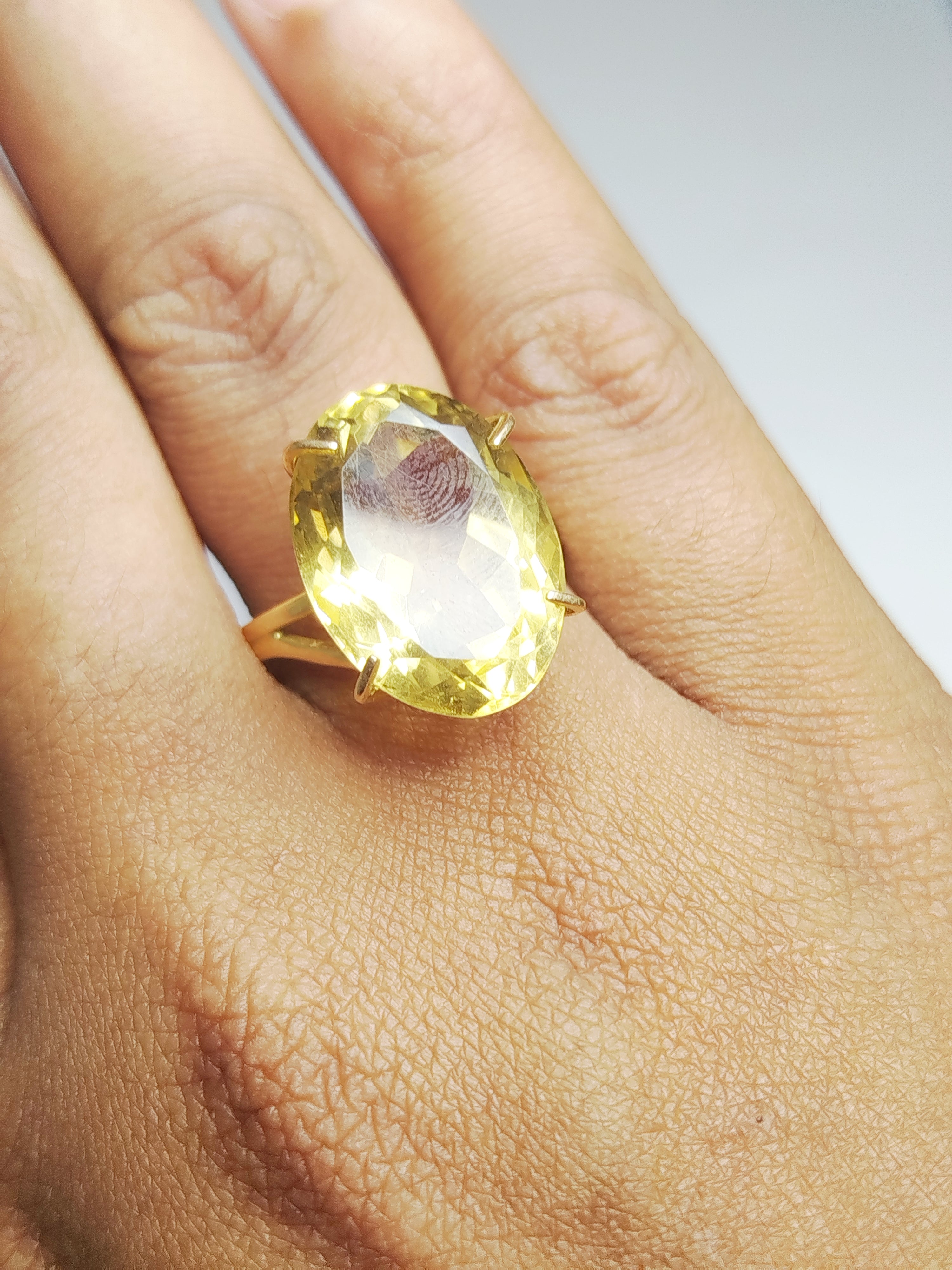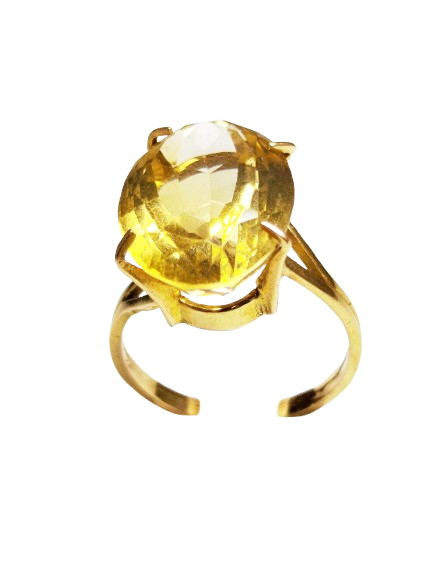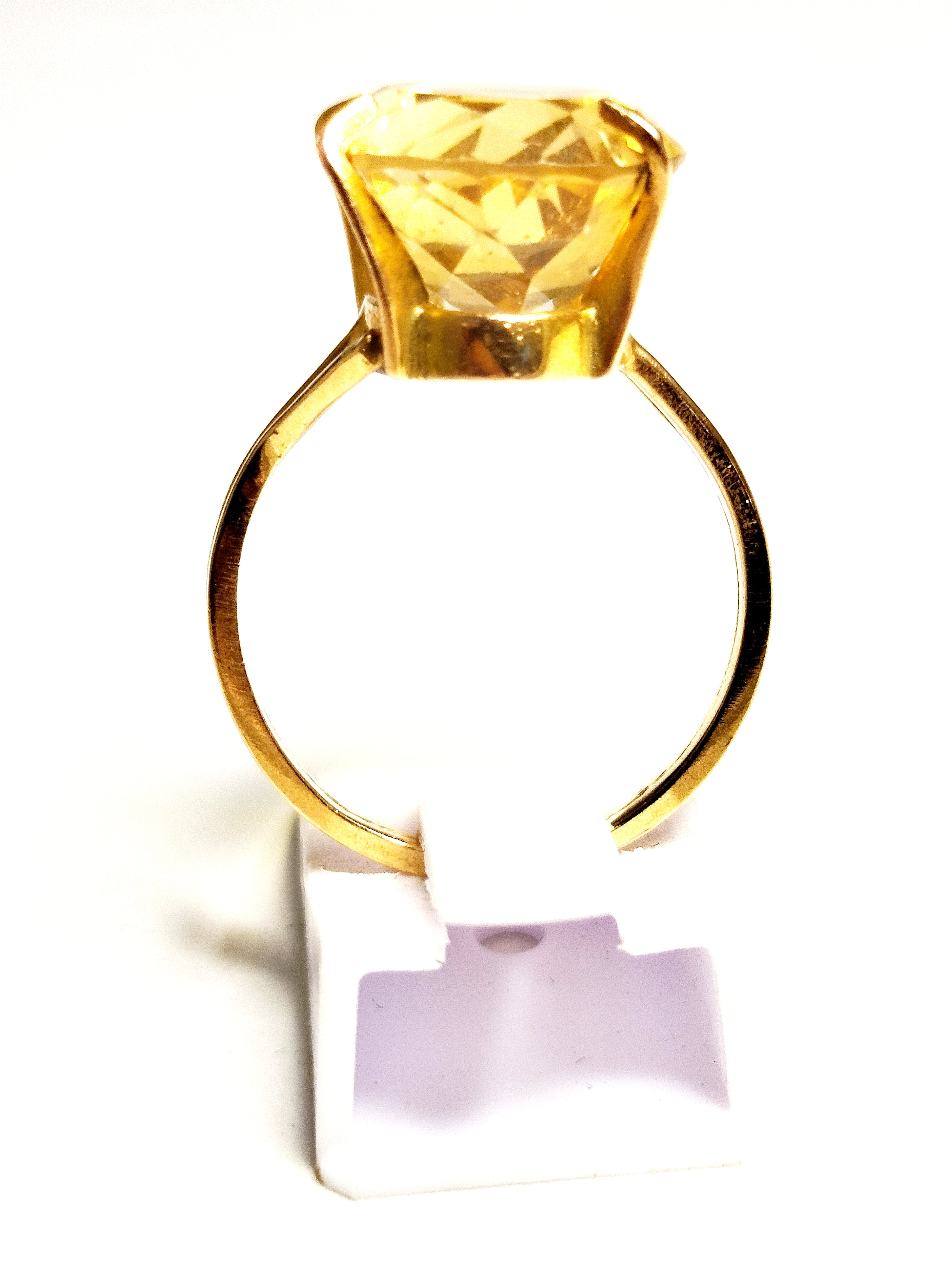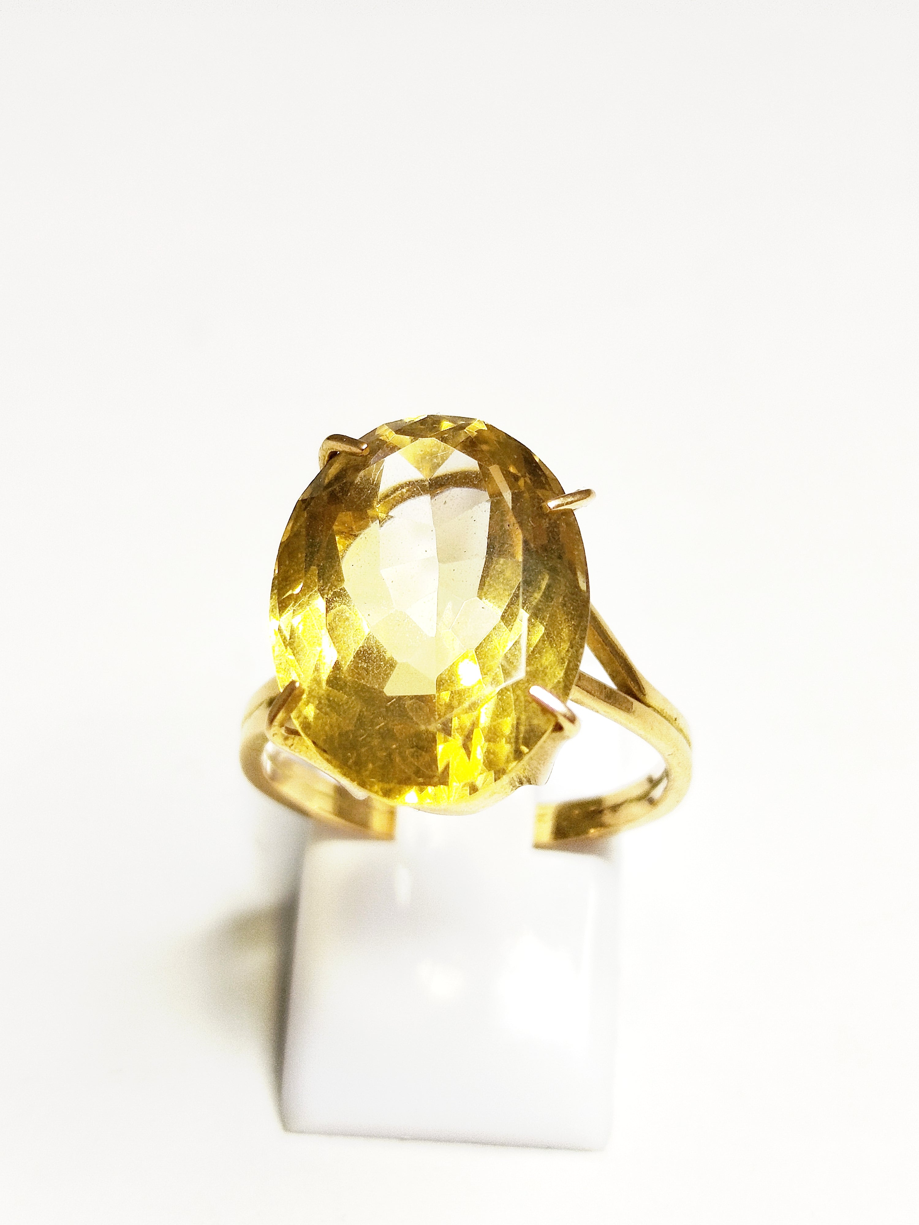 Bague empierrée en or jaune 18 carats (750/1000), de taille 59, ornée d’une citrine. Elle pèse 5,87 grammes et ne comporte pas de poinçon. L’ensemble est en très bon état.