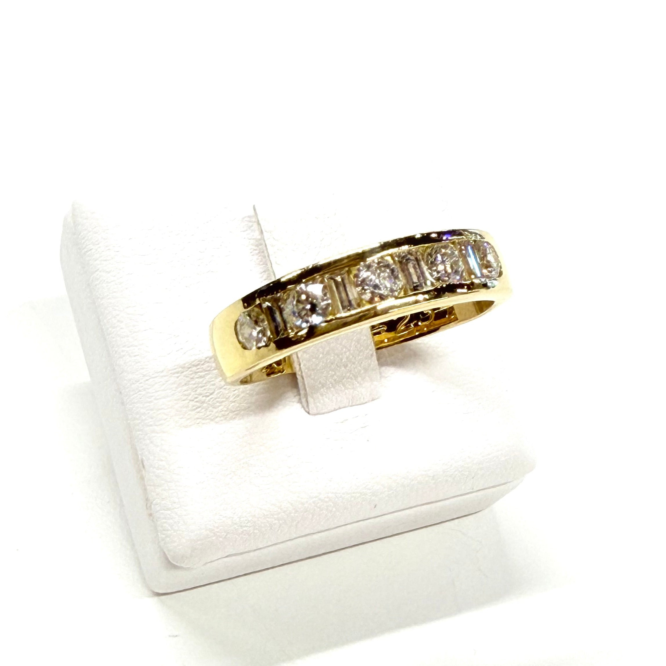 Bague empierrée en or jaune 18 carats (750/1000), poinçonnée tête d’aigle. Sertie de 5 diamants ronds d’environ 0,10 carat chacun, rehaussés de diamants baguette entre chaque pierre. Taille 56, poids 4,97 g. Brillante et raffinée, en très bon état.