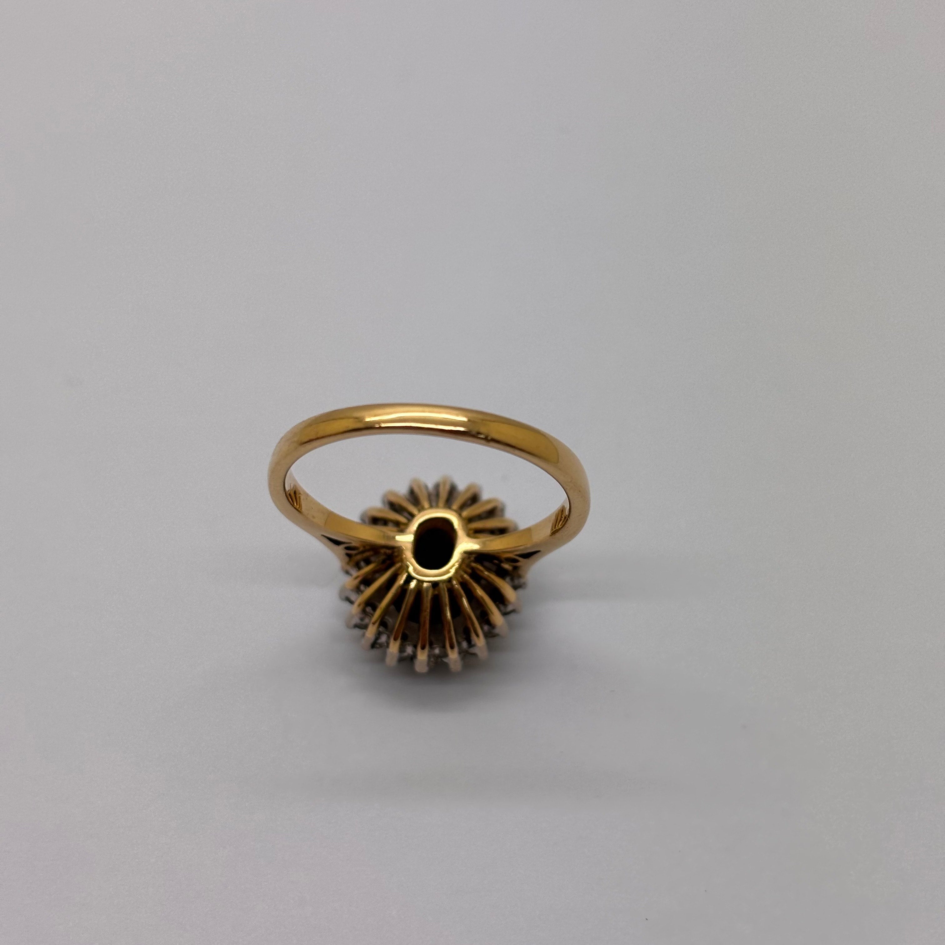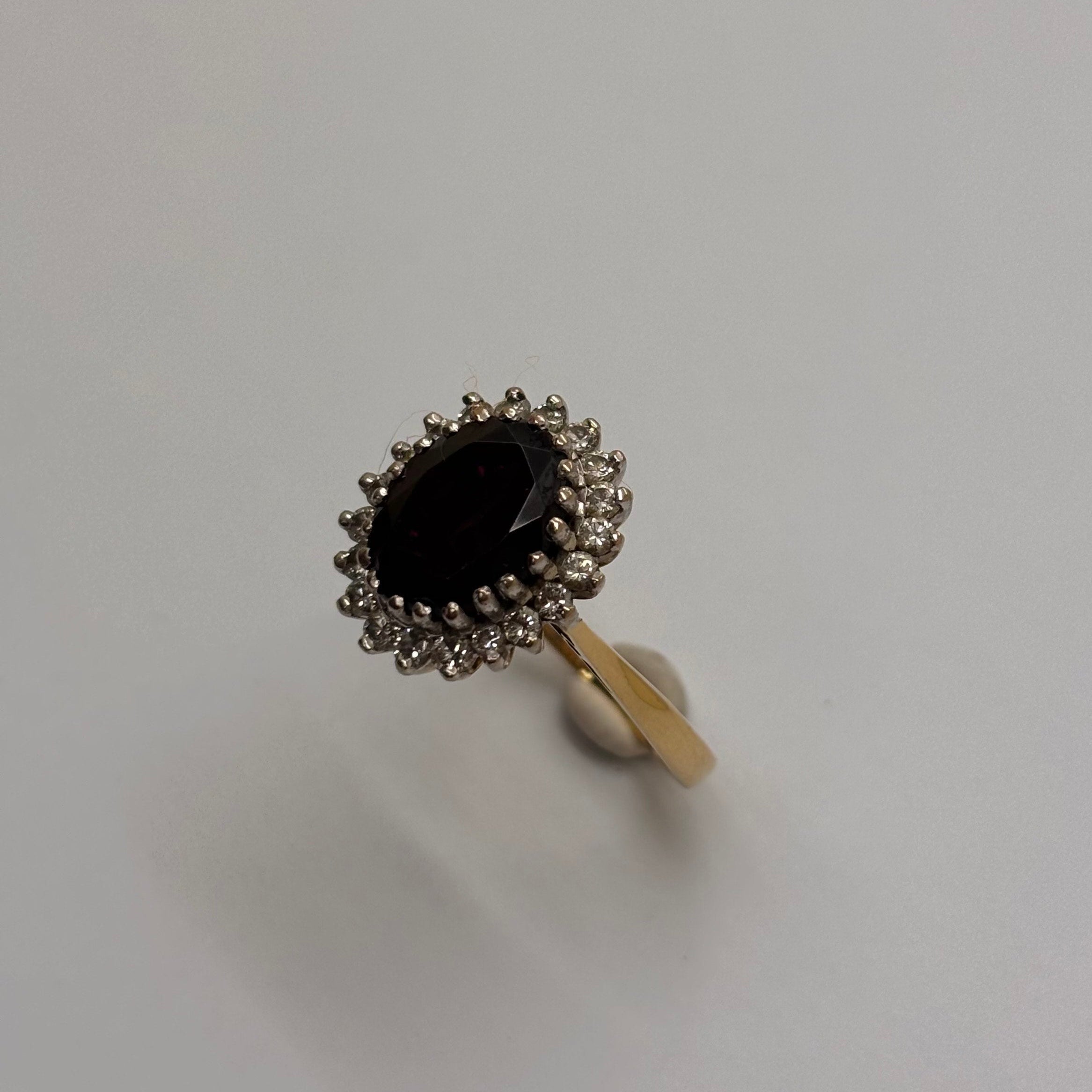 Bague de type empierrée, au style marguerite, est réalisée en or jaune et or blanc 18 carats (titrage 750/1000), sans poinçon. Elle pèse 4,77 grammes et est de taille 52. Elle est ornée d’un grenat central entouré de 20 diamants, et se présente en bon état.