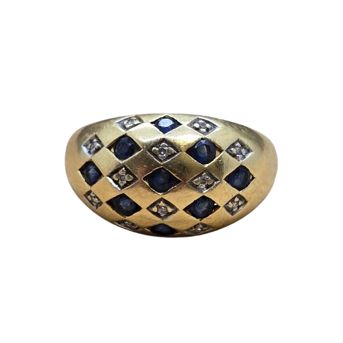 Élégante et intemporelle, cette magnifique bague en or jaune 18 carats est le bijou parfait pour offrir ou se faire plaisir. Elle est ornée de 12 petits diamants étincelants qui captent magnifiquement la lumière, ainsi que de 9 pierres bleues qui ajoutent une touche de couleur raffinée.
