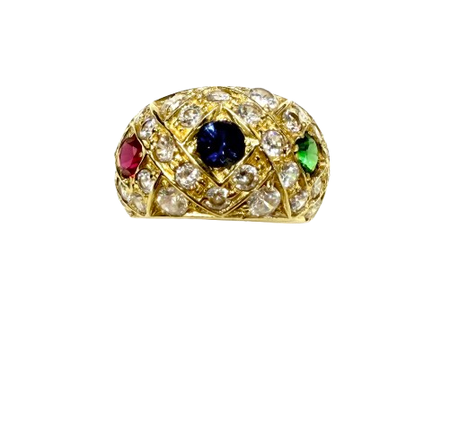 Bague empierrée en or jaune 18 carats (750/1000), poinçonnée 750, affiche un poids de 9,20 grammes et une taille 57,5 ; elle est sertie de 35 zirconiums de 0,2 cm ainsi que d’un rubis, d’un saphir et d’une émeraude de 0,4 cm chacun, et se présente dans un très bon état.