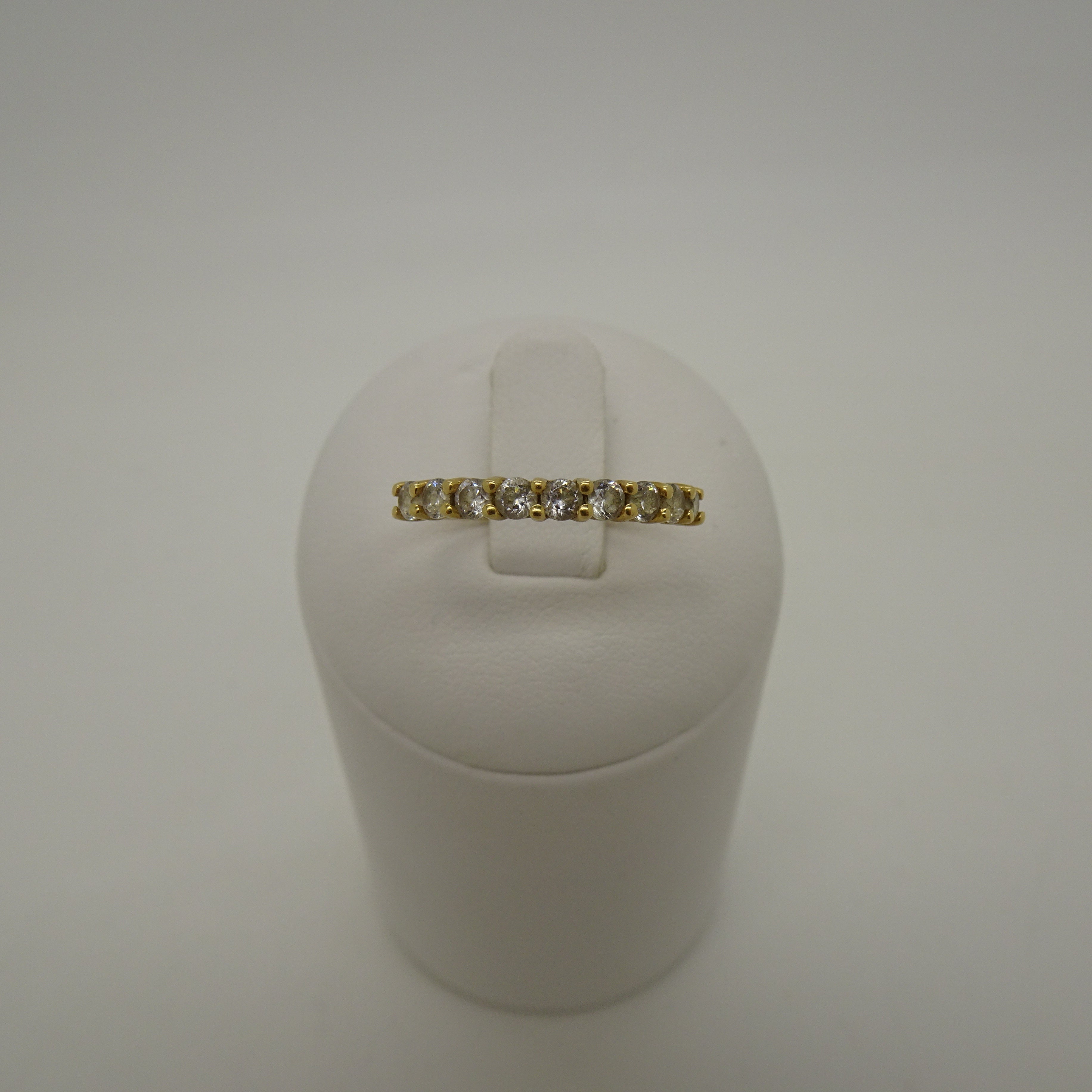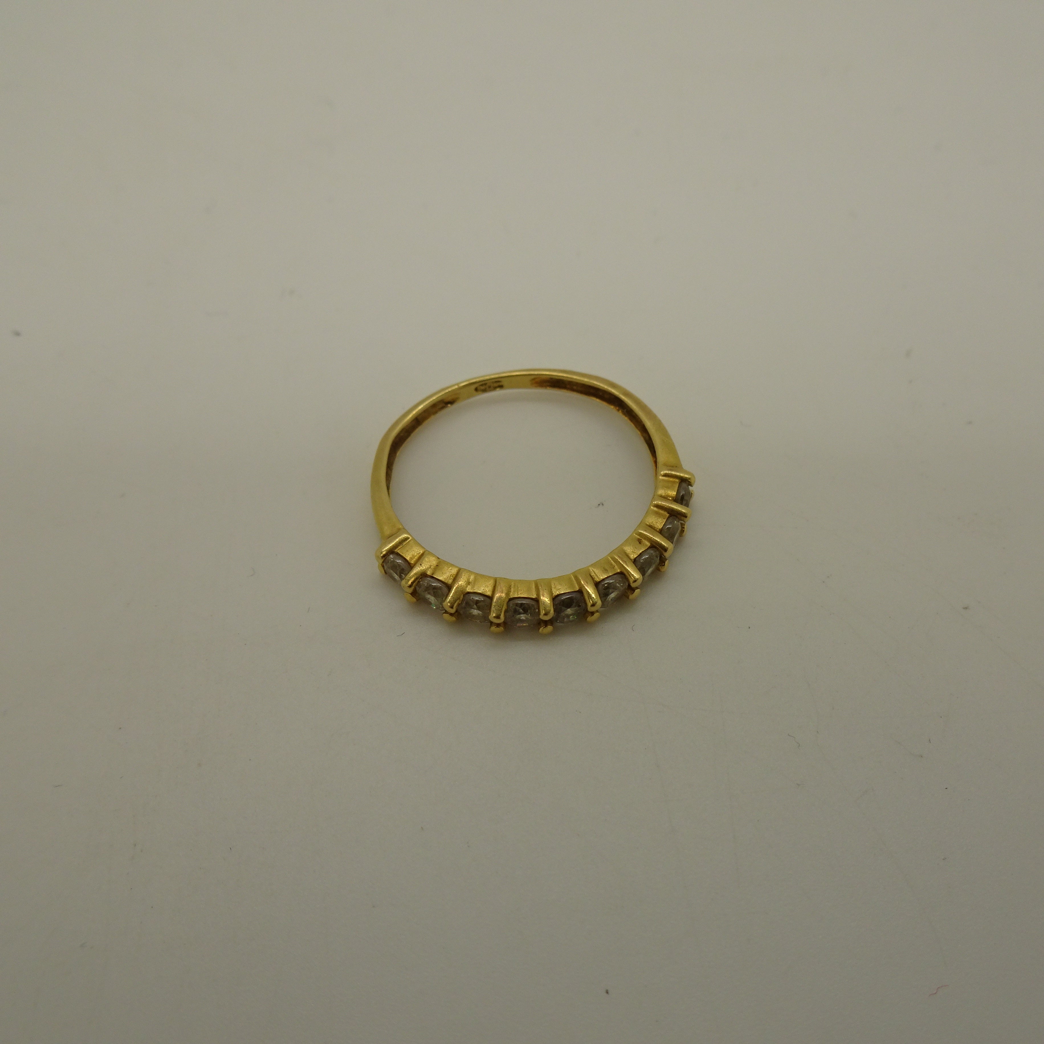 Bague demi-tour en or jaune 18 carats, sertie de 9 oxydes de zirconium taille brillant pour un éclat tout en finesse. Légère et lumineuse, elle apporte une touche élégante à votre main. En très bon état, c’est un bijou délicat à porter au quotidien.