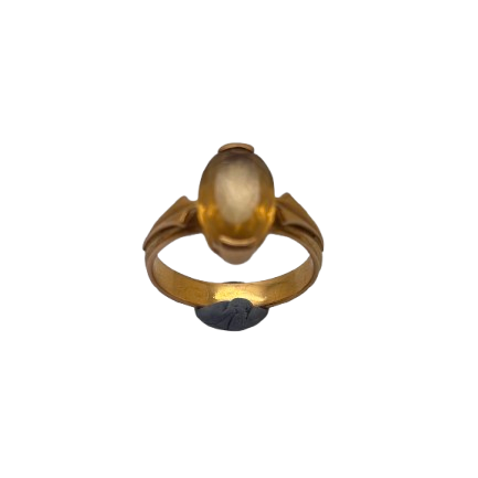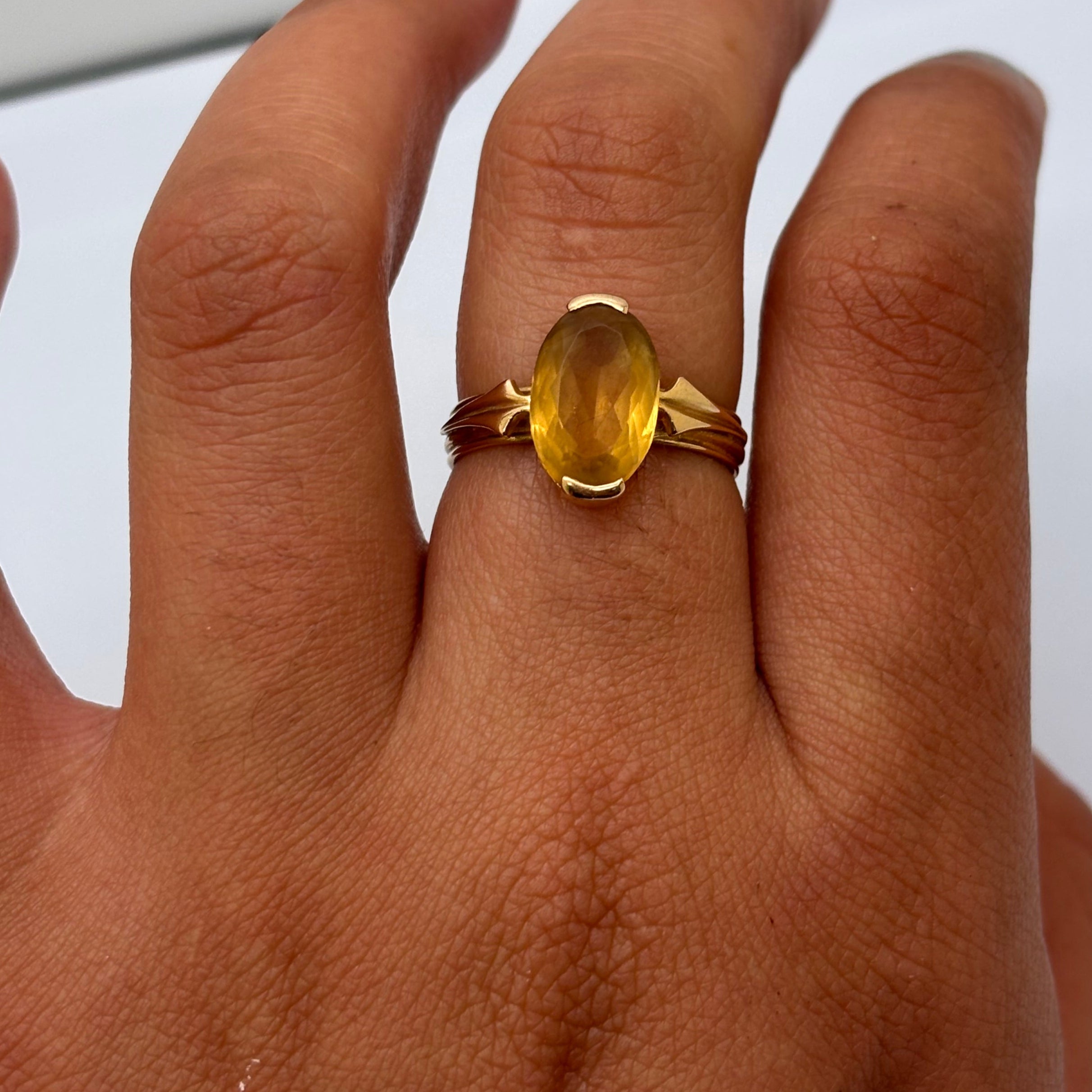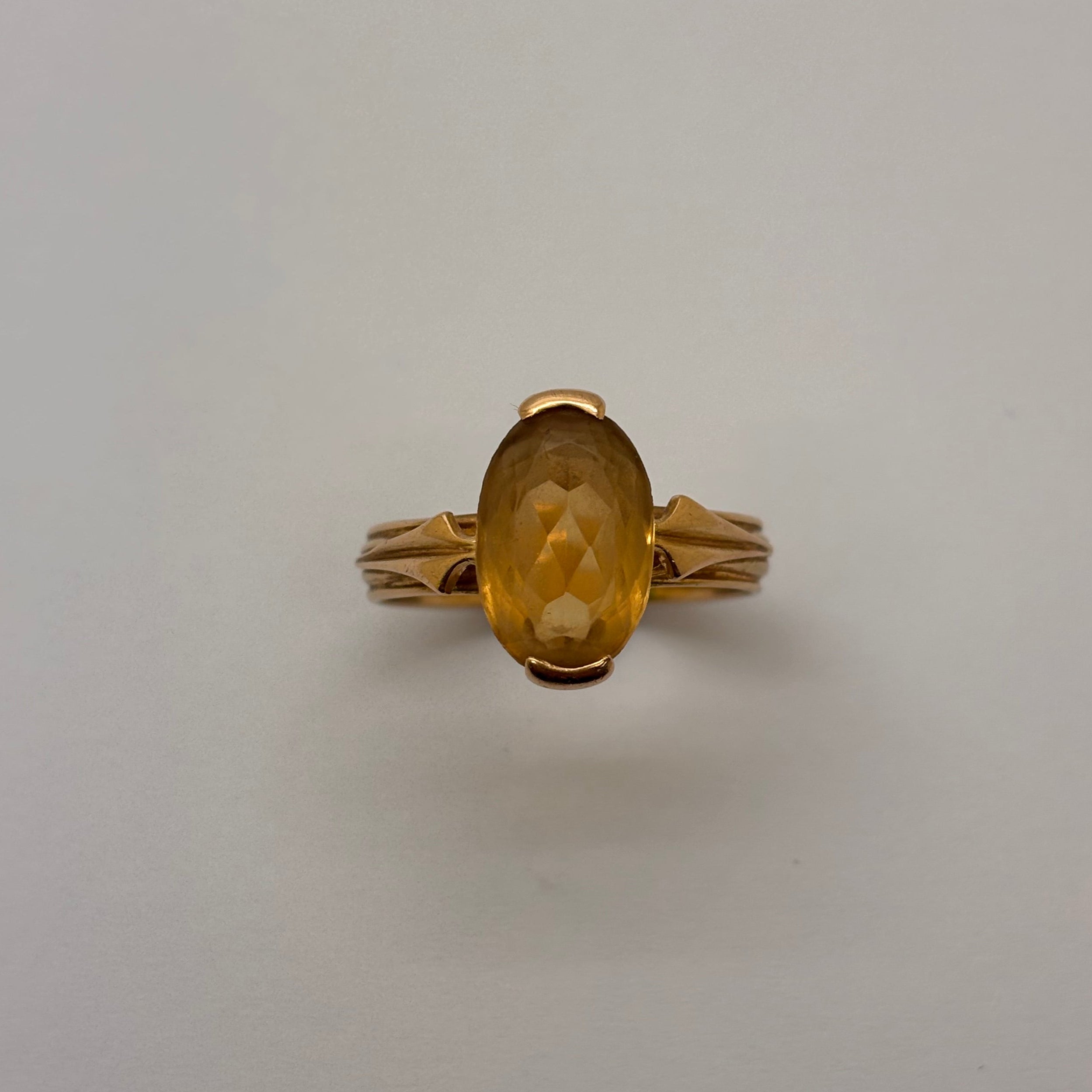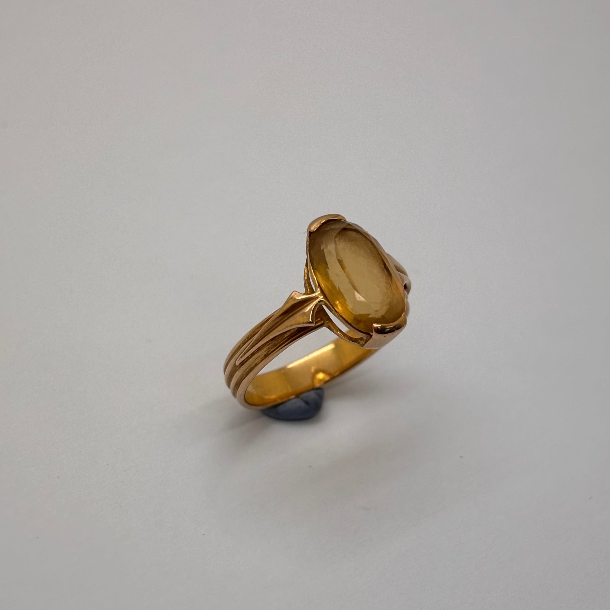 Bague empierrée en or jaune 18 carats (750/1000), poinçonnée Tête d’Aigle, sertie d’un spinelle central. D’un poids de 4,15 grammes et de taille 56, elle est en bon état général.