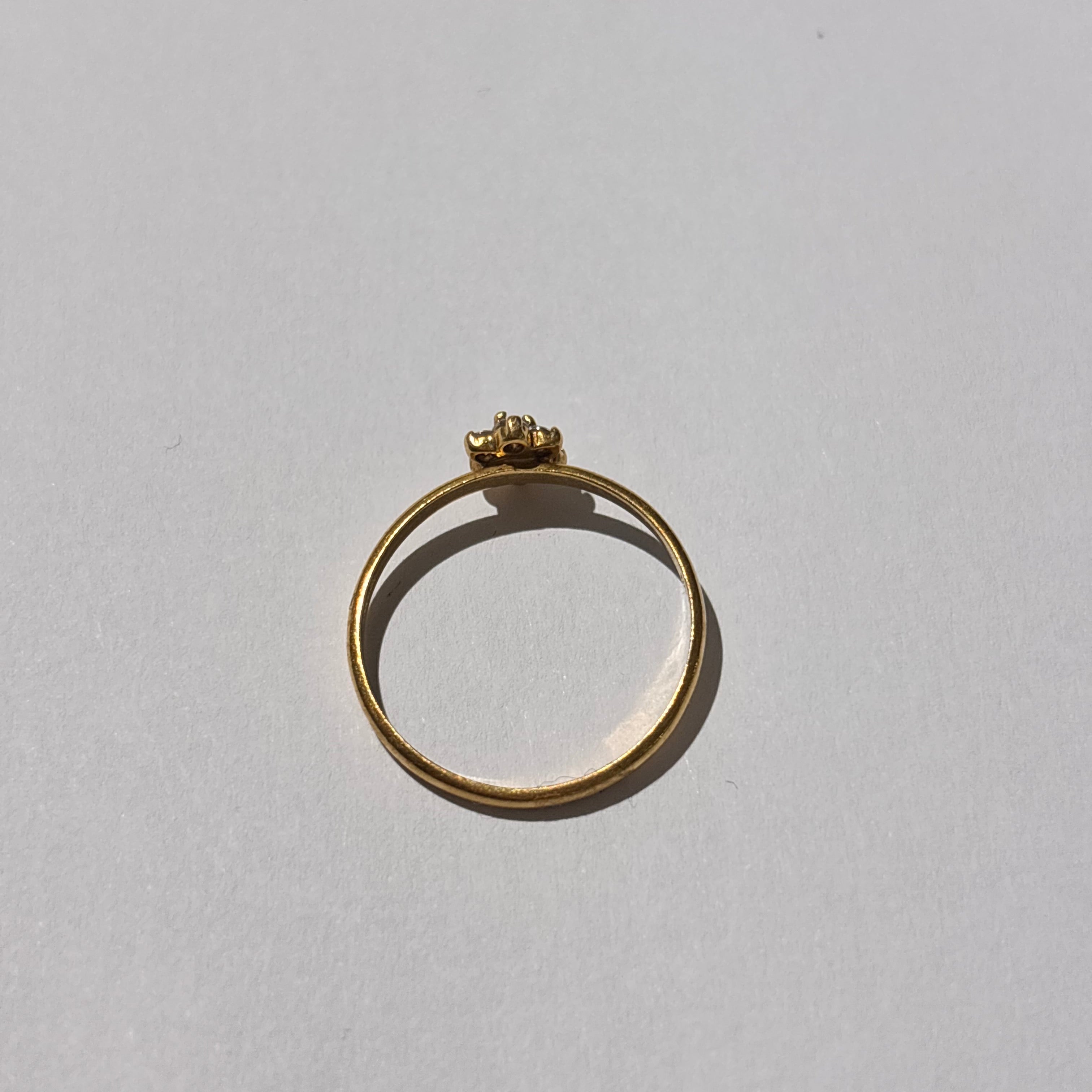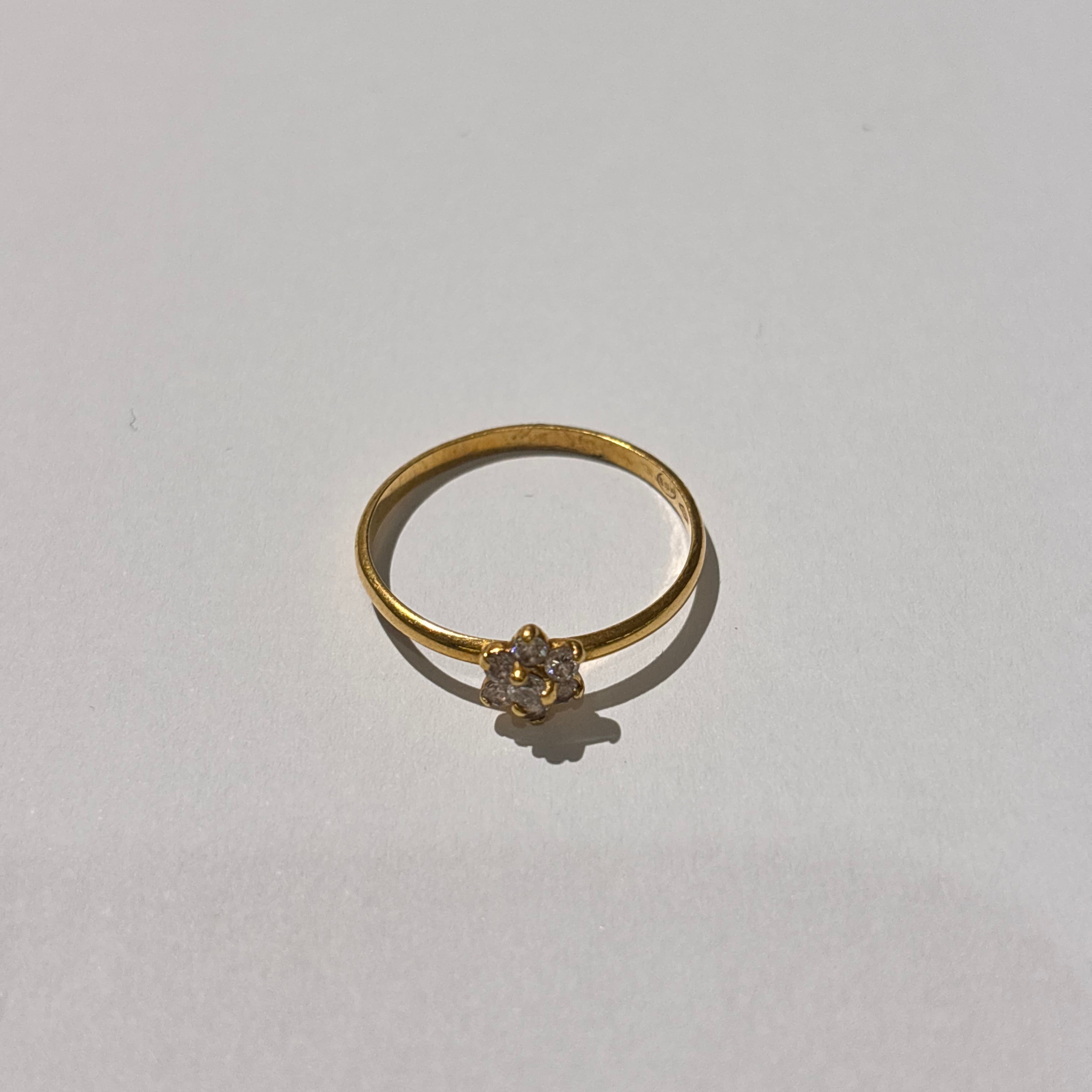 Bague empierrée en or jaune 18 carats (750/1000), poinçonnée "750". Sertie de sept oxydes de zirconium, elle pèse 1,37 gramme et correspond à une taille 56. État comme neuf.
