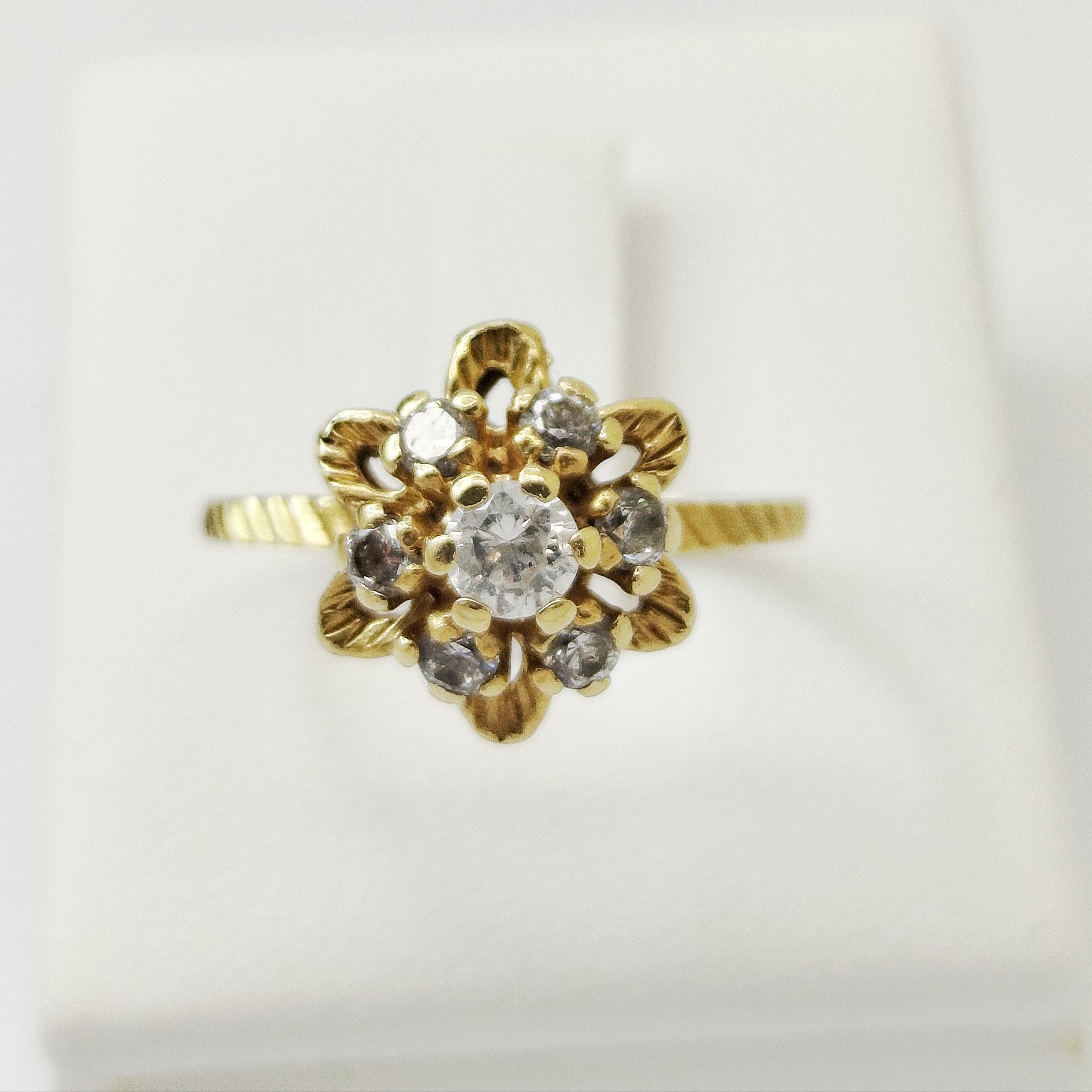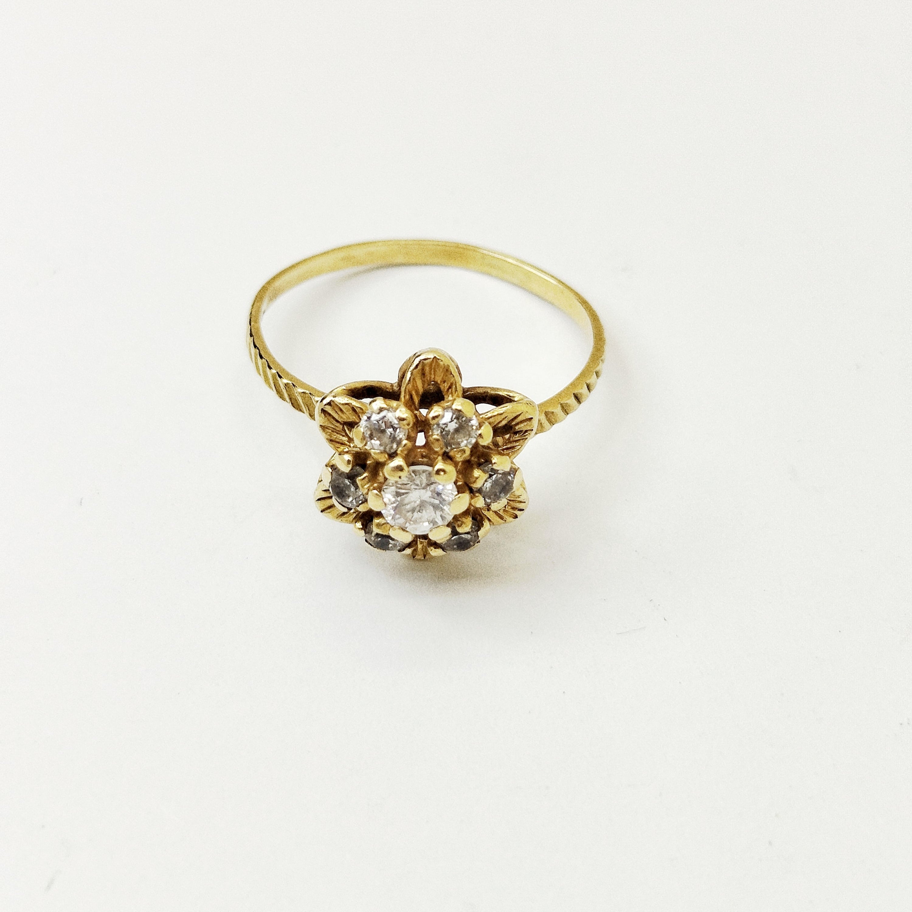 Bague fleur en or jaune 18 carats (750/1000), sans poinçon. Poids : 2,39 g, taille : 51. Sertie d’oxydes de zirconium pour une brillance subtile et délicate. En très bon état.