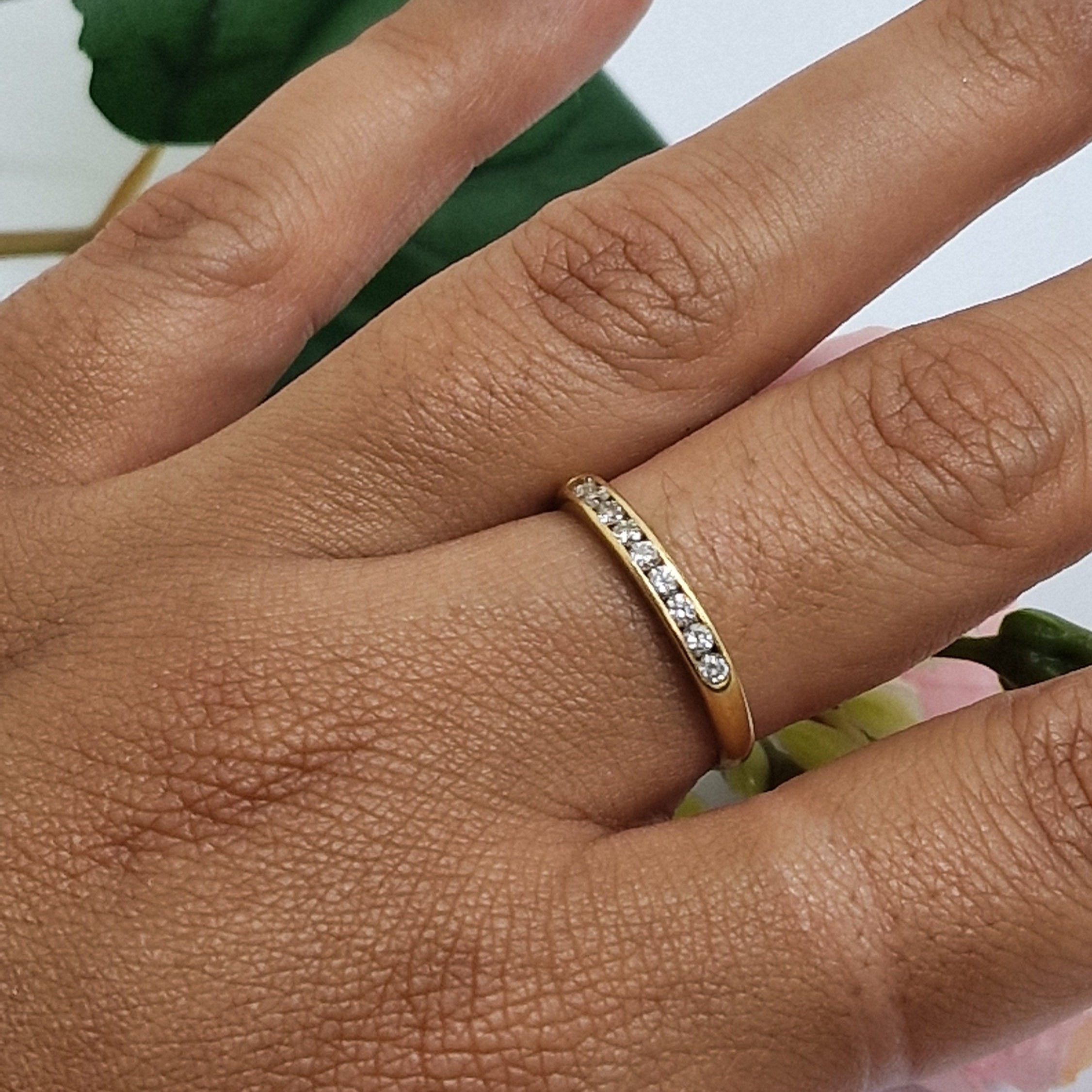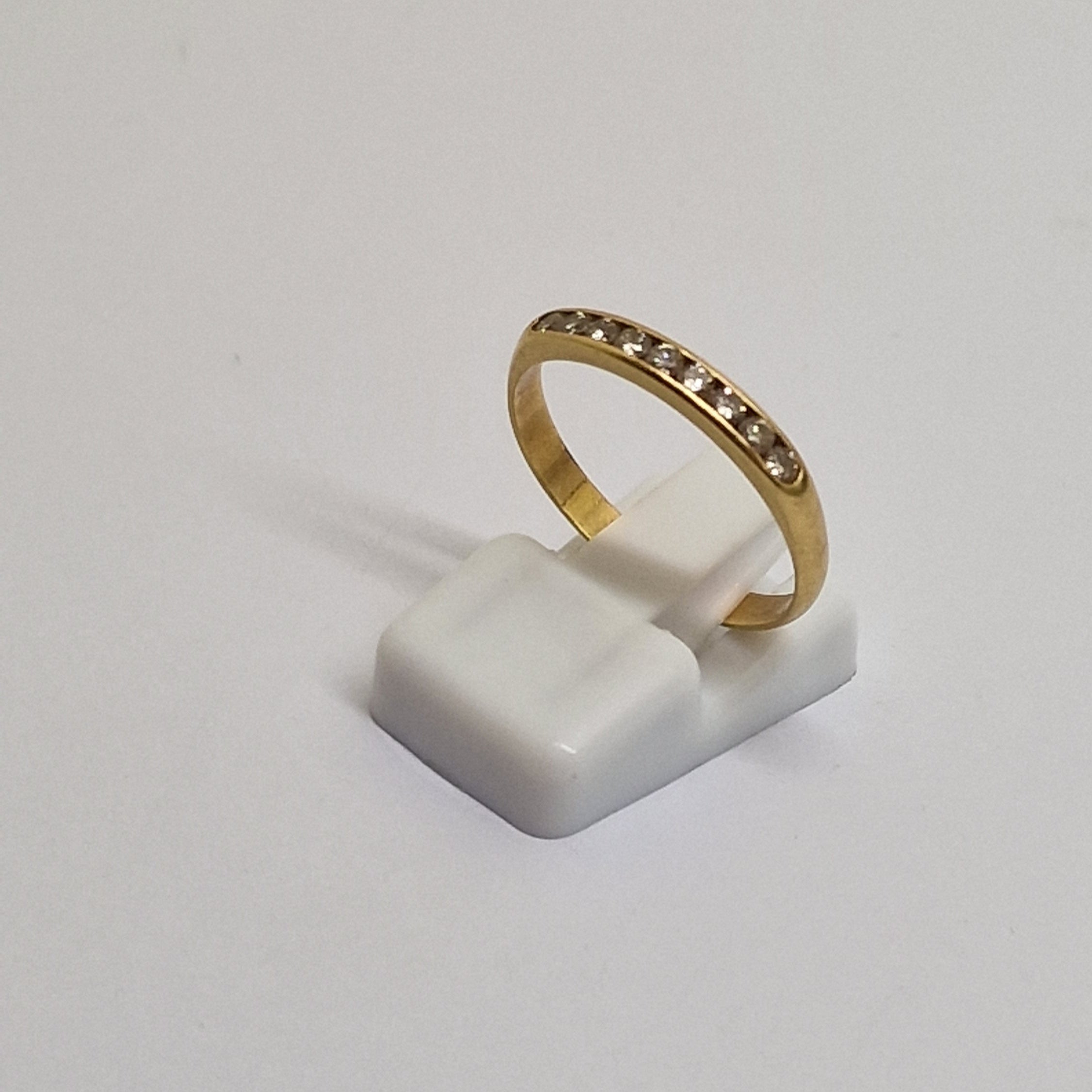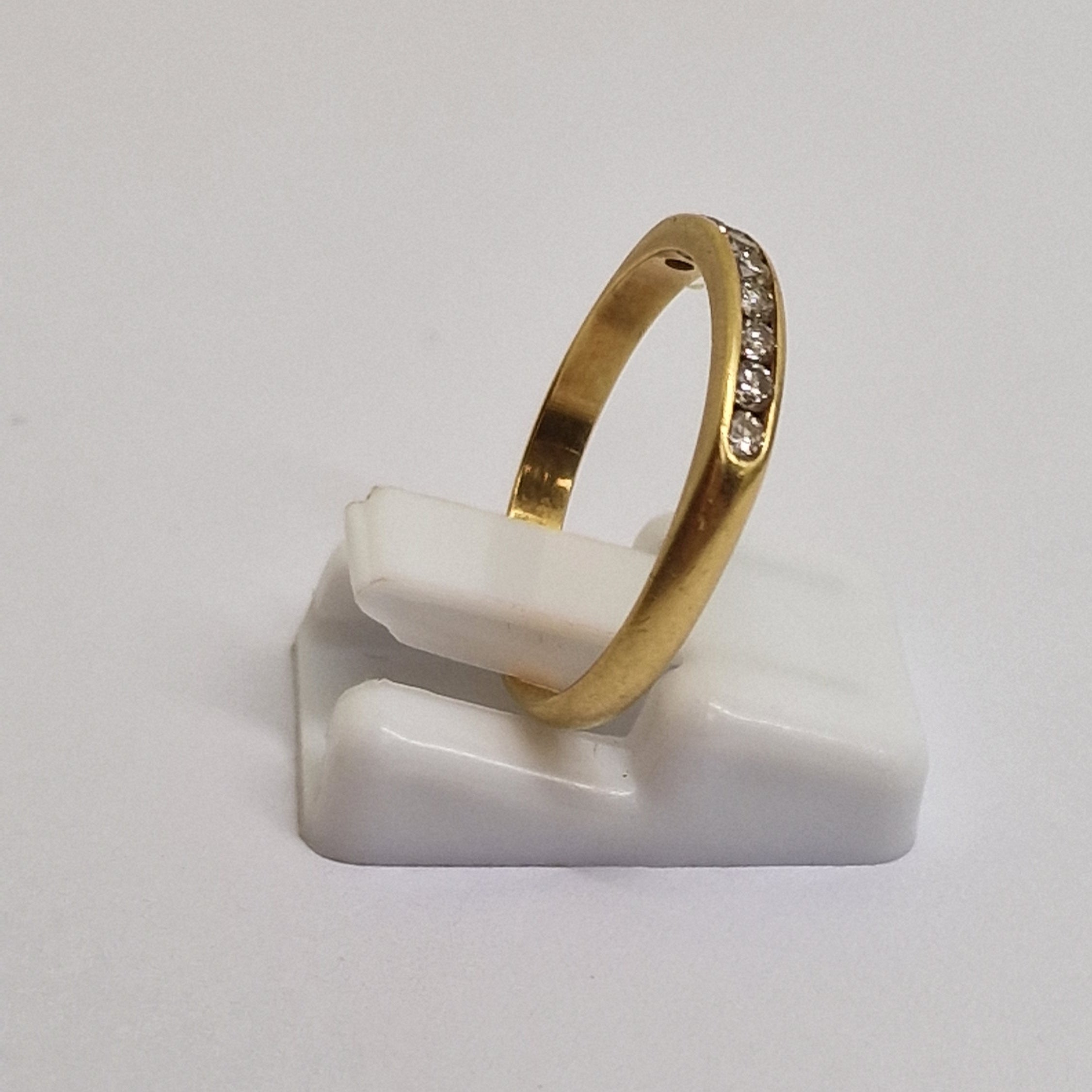 Bague demi-tour en or jaune 18 carats (750/1000), poinçonnée tête d’aigle, en bon état. Ce modèle raffiné est serti de 9 petits diamants, apportant une touche d’éclat discrète et élégante. Avec une taille 57 et un poids de 1,88 gramme.