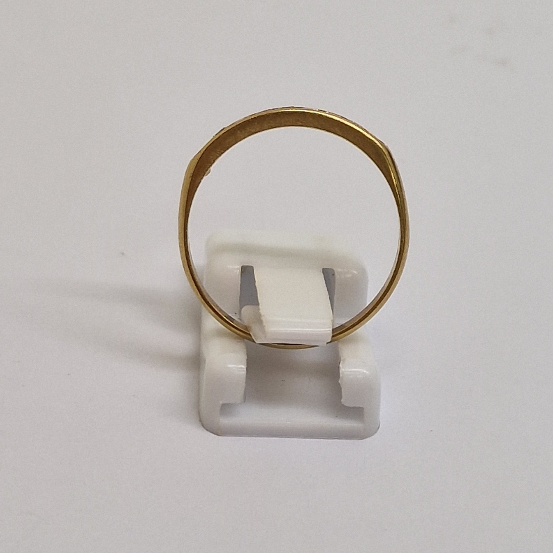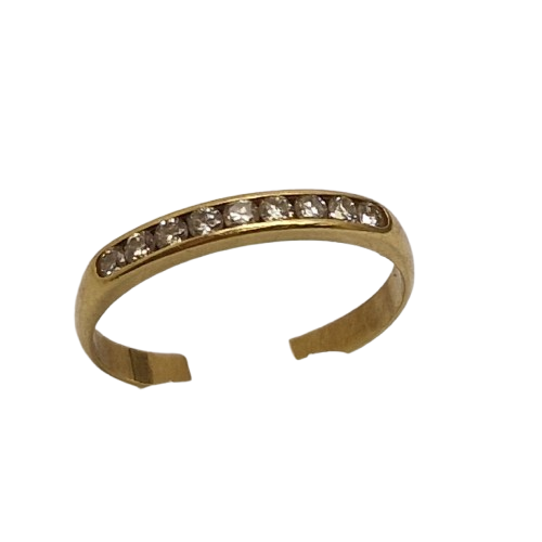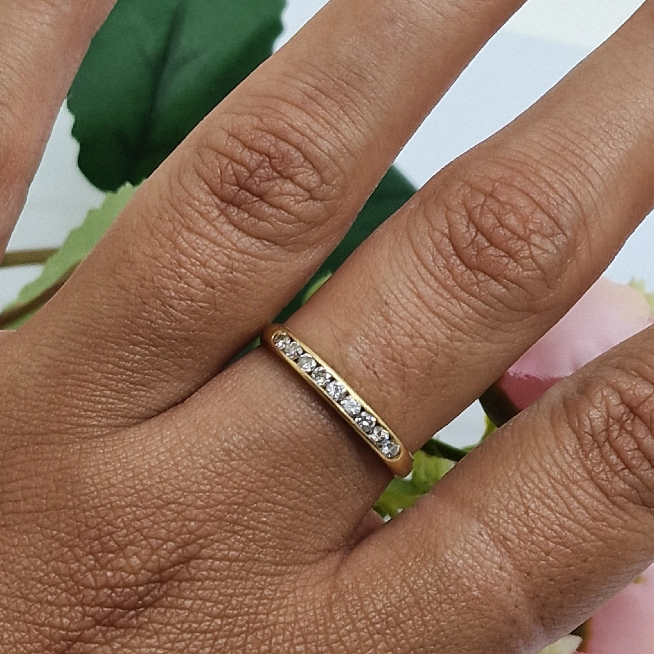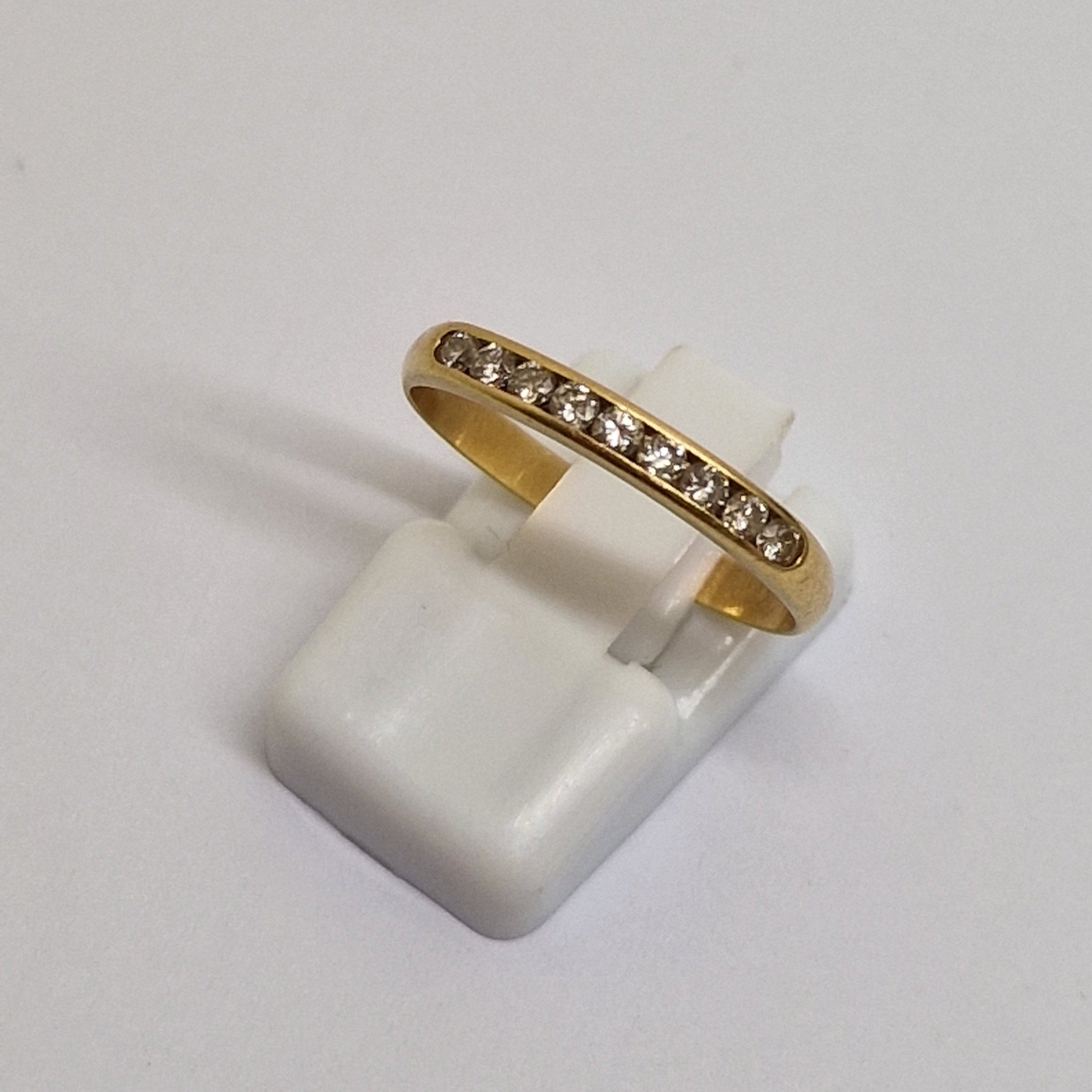 Bague demi-tour en or jaune 18 carats (750/1000), poinçonnée tête d’aigle, en bon état. Ce modèle raffiné est serti de 9 petits diamants, apportant une touche d’éclat discrète et élégante. Avec une taille 57 et un poids de 1,88 gramme.