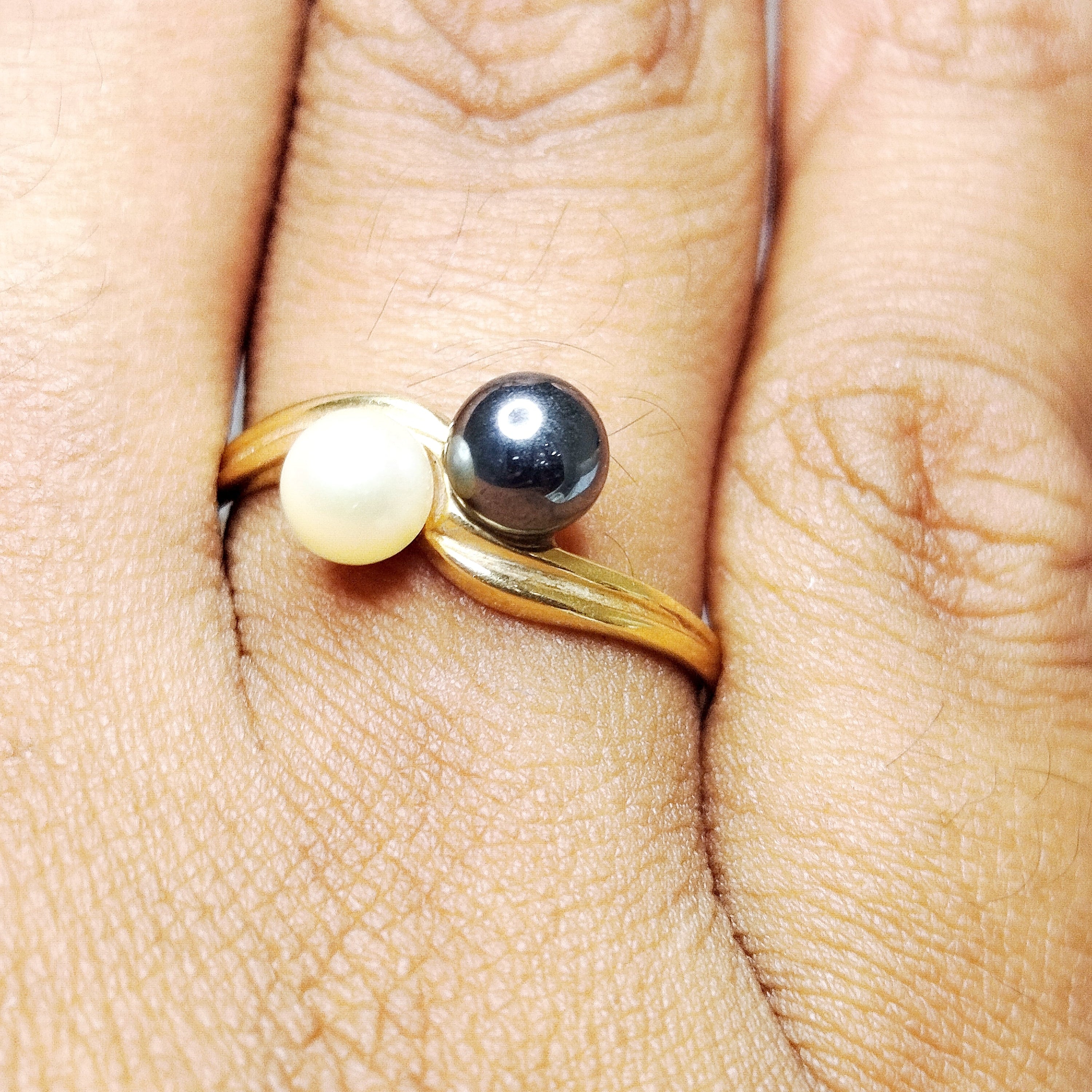 Bague en très bon état ornée d’une perle est réalisée en or jaune 18K (750/1000). Elle ne présente pas de poinçon visible et affiche une taille 56 pour un poids total de 2 grammes.