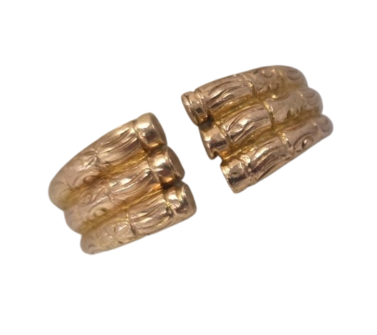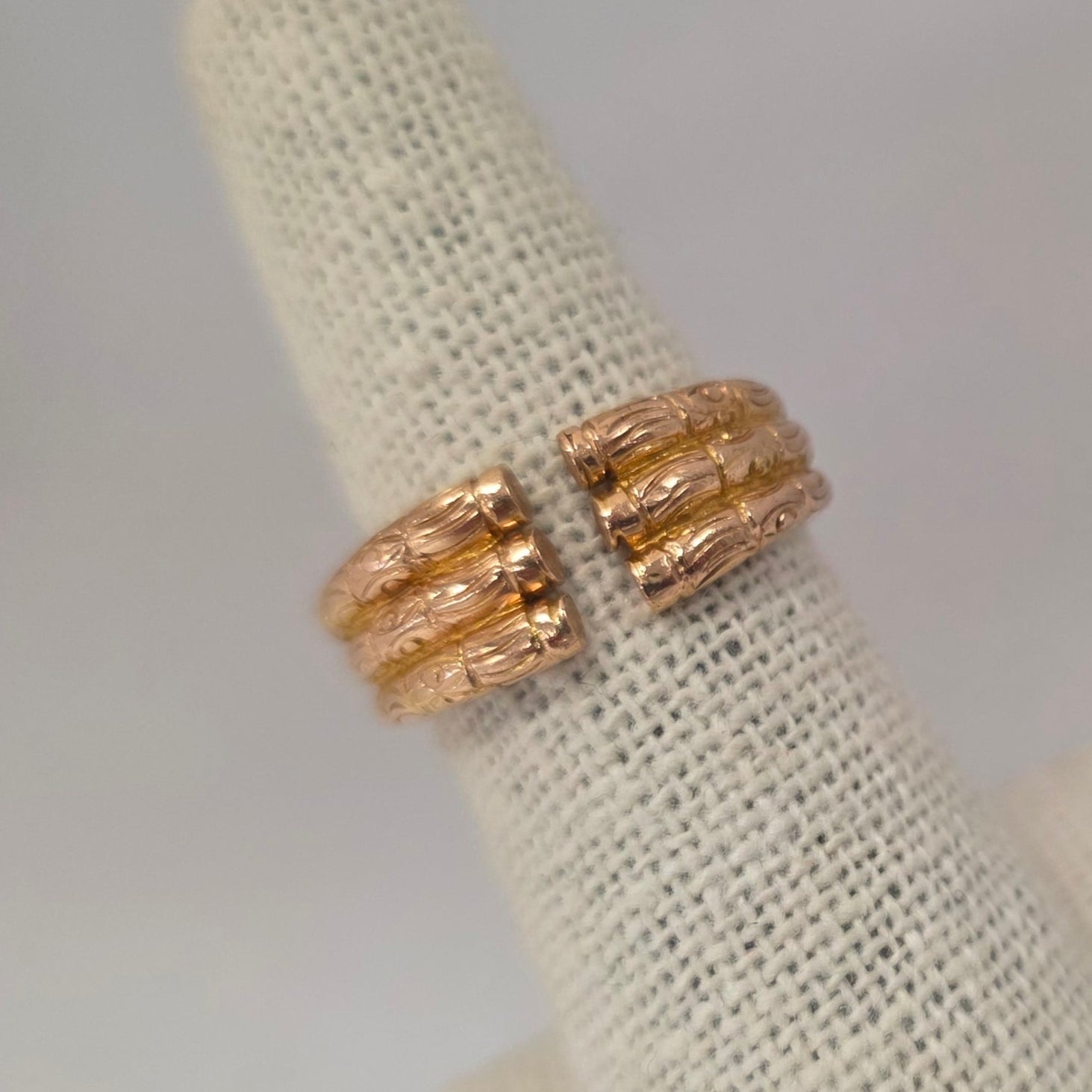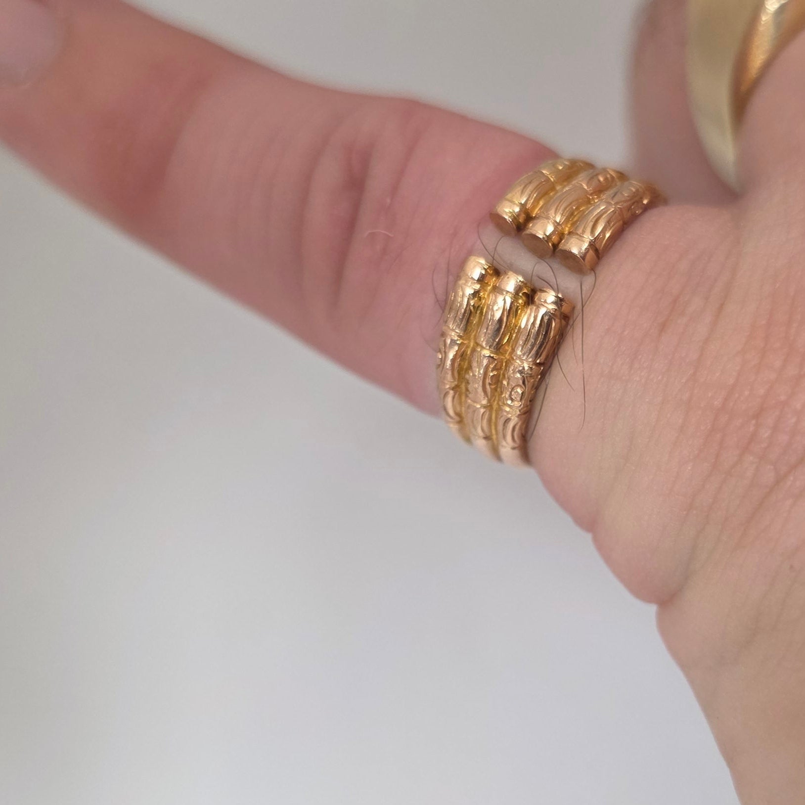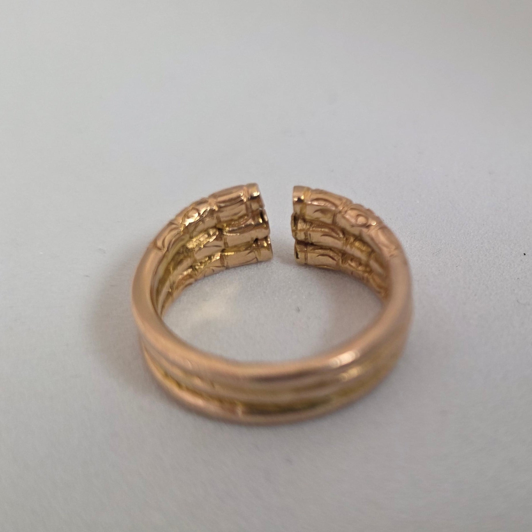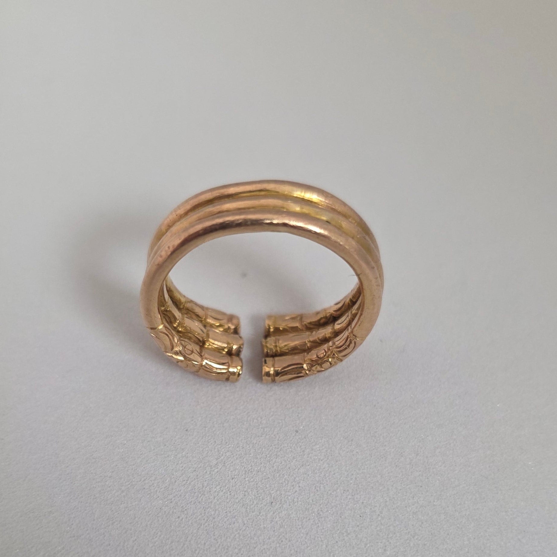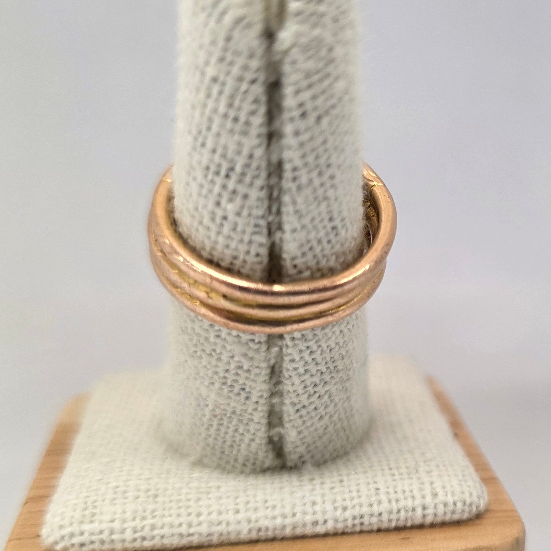 Bague triple jonc est en or 18 carats (750/1000), avec une teinte plus rosée que jaune. Elle pèse 8,79 grammes et présente une taille 53. L'anneau ne comporte aucune pierre et n'a pas de poinçon. En bon état général.