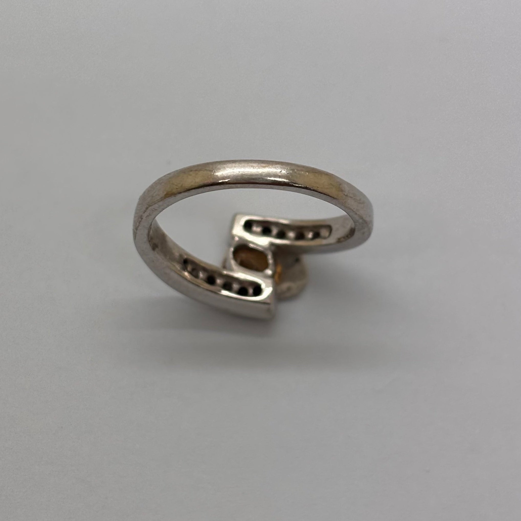 Raffinée bague en or gris 585/1000 (14K), ornée d’une topaze jaune et de 12 zirconiums. Poids : 3,69 g, taille 50, poinçon 585, en bon état.