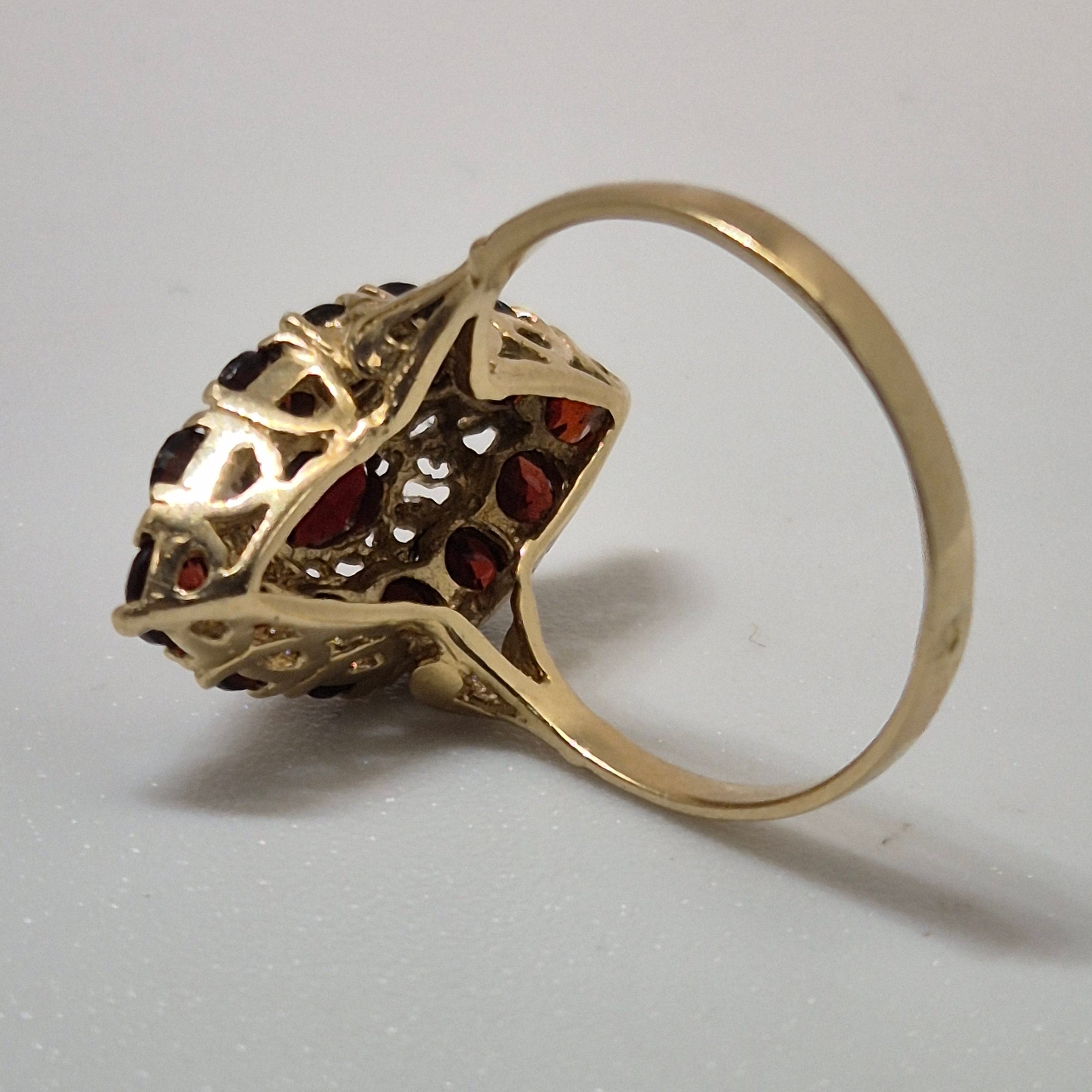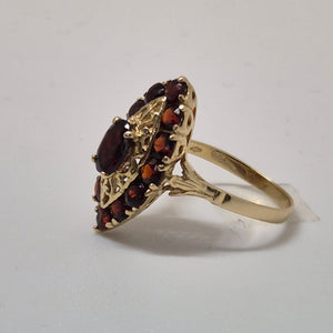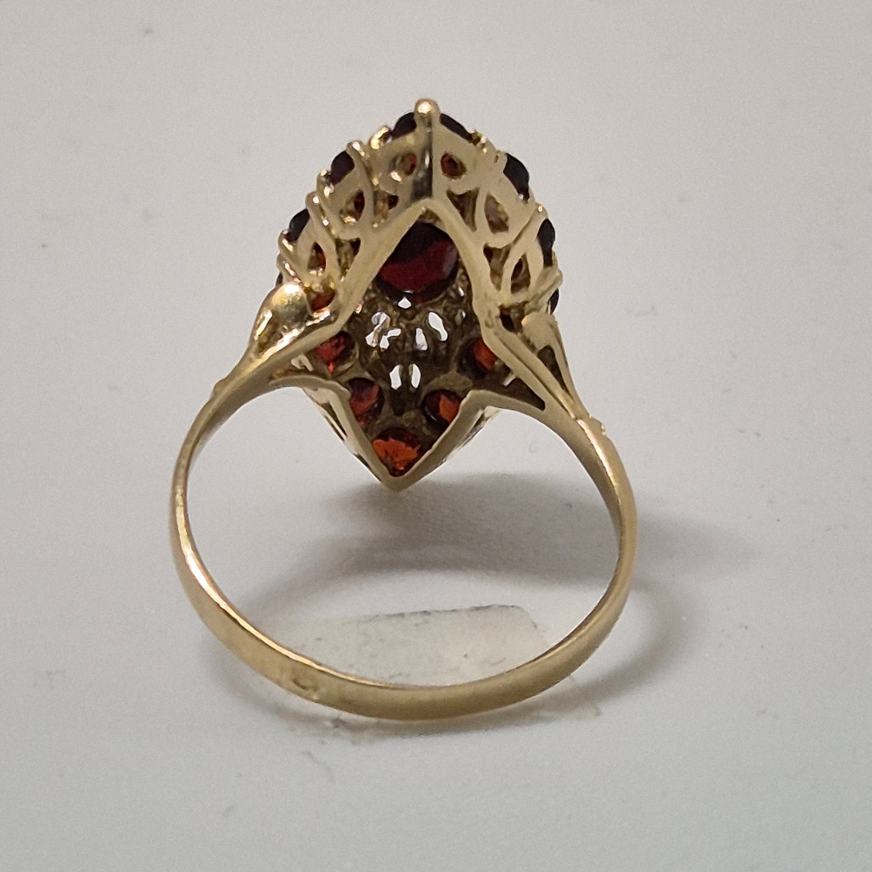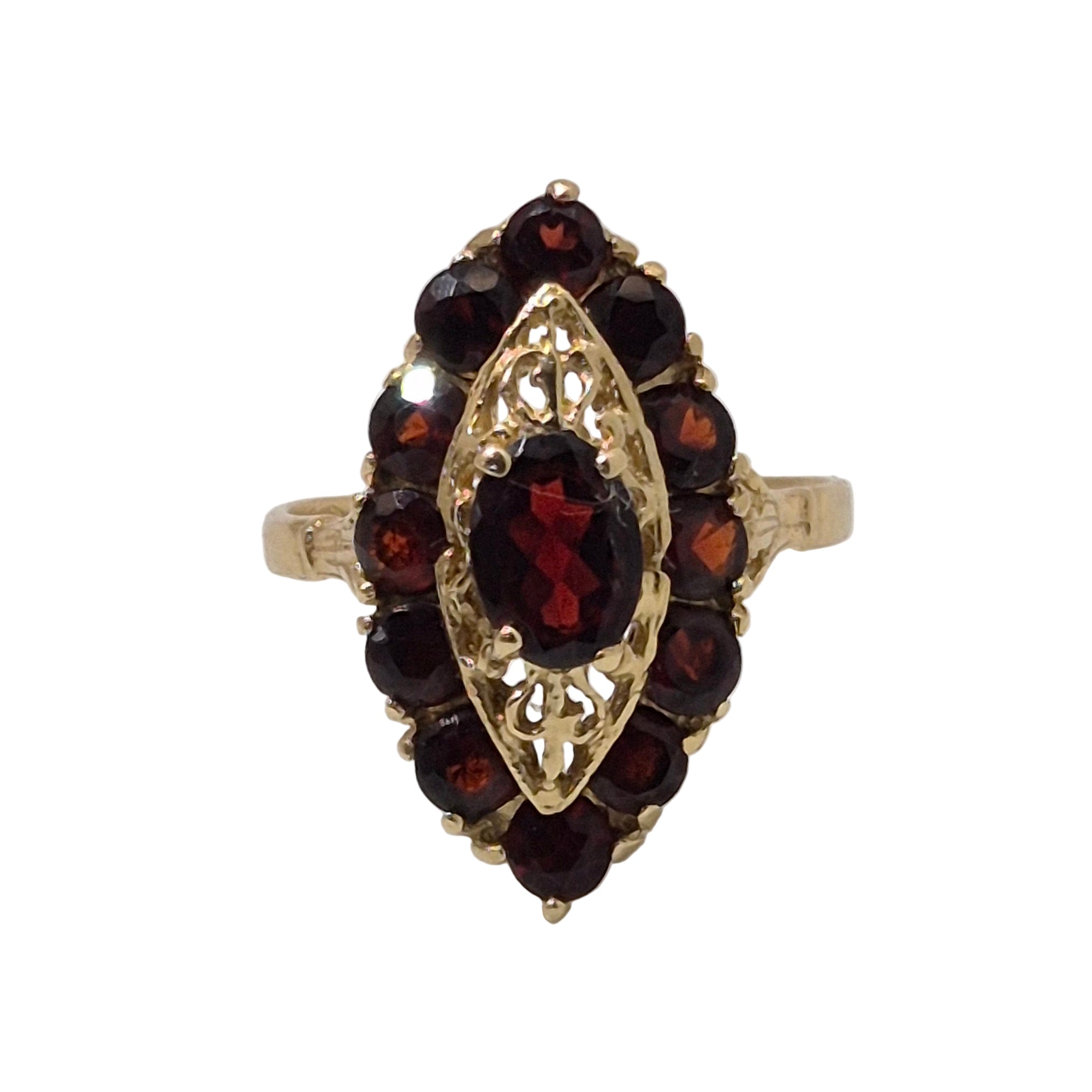 Élégante bague marquise en or jaune 750/1000 (18K), sertie de 13 grenats aux reflets profonds et lumineux. Poids : 4,63 g, taille 55, poinçon 750 en très bon état.