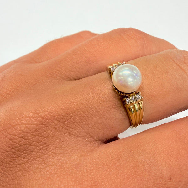 Bague empierrée en or jaune 750/1000, poinçon Tête d’Aigle, poids 2,83 g, taille 53, ornée d’une perle d’eau douce et d’éclats de diamants, très bon état.