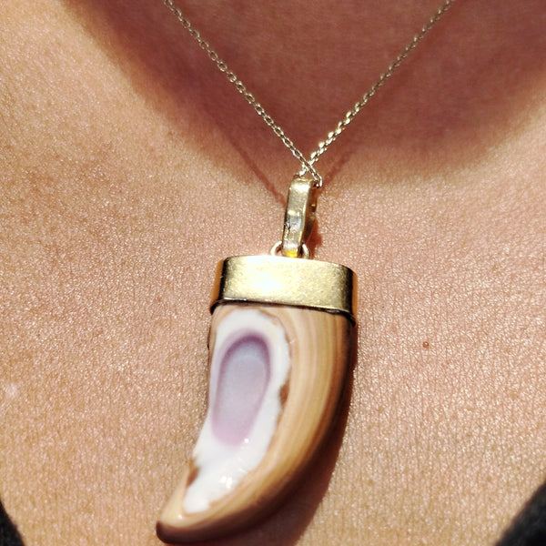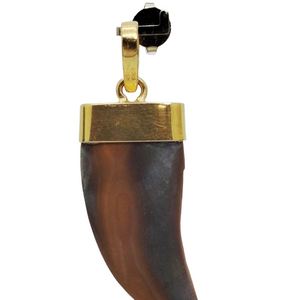 Pendentif dent en or jaune 18 carats, sans poinçon. Hauteur 3 cm, largeur 1,5 cm, épaisseur 0,4 cm, poids 5,95 g, sans pierres, en bon état.