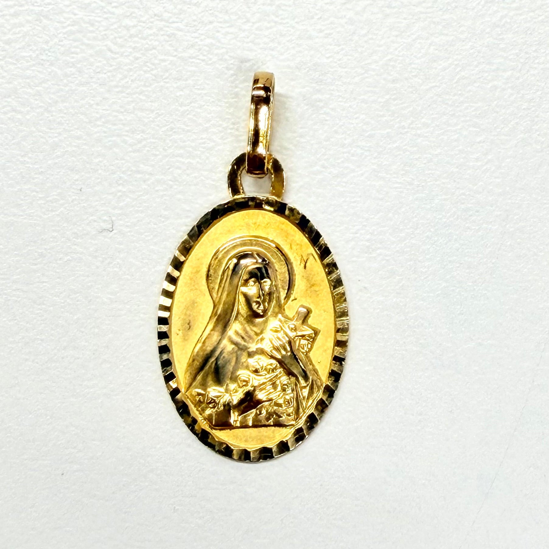 Présentant quelques traces mais en bon état général, ce pendentif en or 18 carats est une pièce intemporelle, idéale pour un cadeau chargé de sens ou pour affirmer sa foi avec élégance.