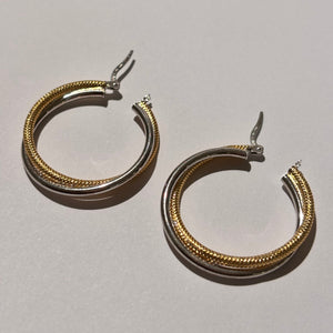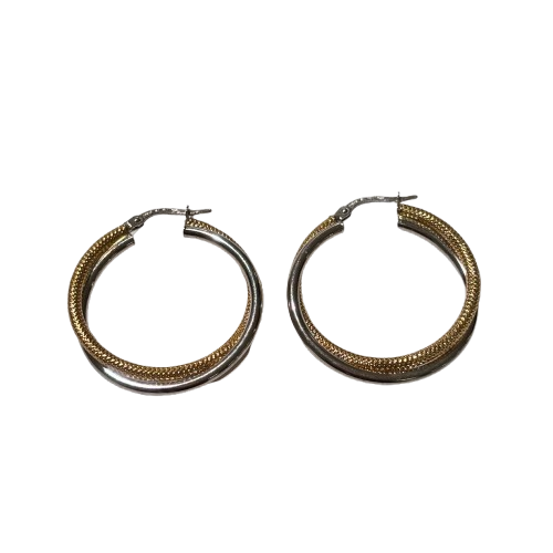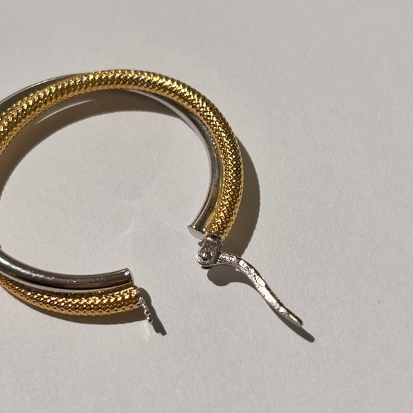 Raffinées et modernes, ces boucles créoles mêlent harmonieusement or jaune et or blanc 18 carats (750/1000). Avec leur diamètre de 3 cm, leur fermoir cliquet et un poids de 4,34 g, elles sont en excellent état, comme neuves.