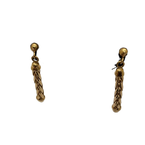 Paire de boucles d’oreilles pendantes en or jaune 18 carats (750/1000), poinçonnées 750, avec fermoirs à poussettes. Elles mesurent 2 cm de hauteur, 5 mm de largeur et 4 mm d’épaisseur, pour un poids total de 7,23 grammes. En très bon état.