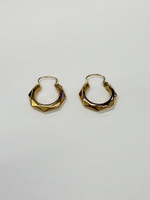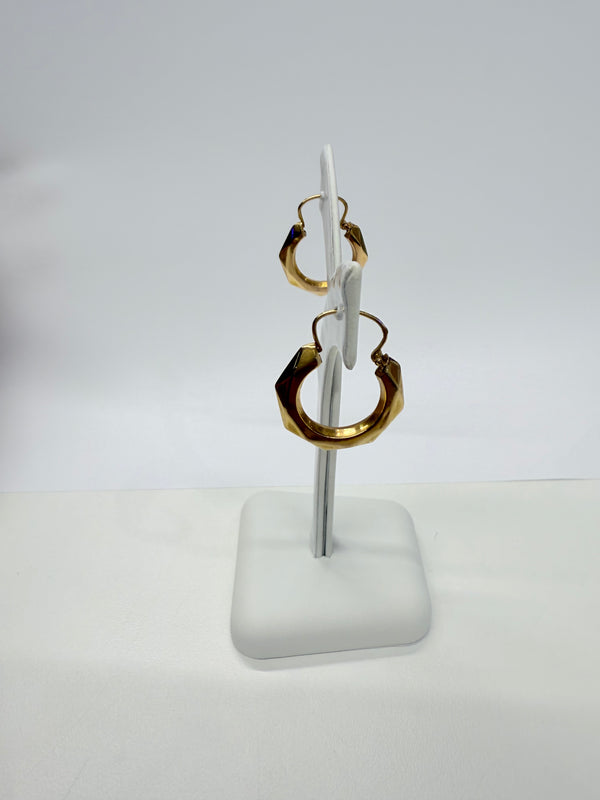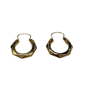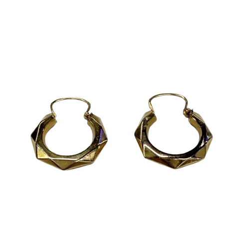 Créoles facettées en or jaune 18 carats (750/1000), poinçonnées Tête d’Aigle. Pesant 1,32 gramme, elles mesurent 2,5 cm de hauteur, 2 cm de largeur et ont une épaisseur de 0,3 cm, offrant une présence élégante et discrète. Leur fermoir à cliquets garantit un port confortable et sécurisé.