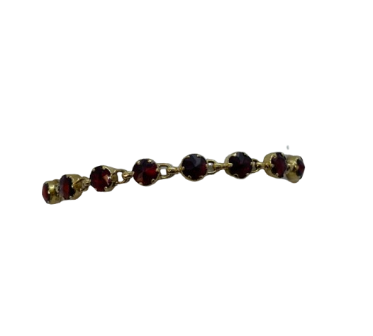Bracelet à maillons en or jaune 18 carats (750/1000), orné de 16 grenats pour une touche de couleur et d’élégance. Il mesure 18,5 cm de long, 0,5 cm de large et 0,4 cm d’épaisseur, pour un poids total de 9,15 grammes. Fermoir de type bouée. Sans poinçon, mais en bon état. Un bijou raffiné, idéal à porter seul ou en accumulation.