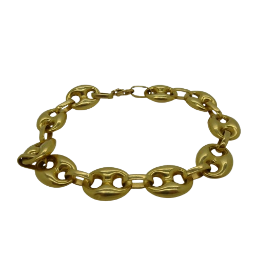 Bracelet gourmette à maille grain de café est en or jaune 18 carats (750/1000) et porte le poinçon tête d’aigle. Il mesure 29 cm de long, 1,6 cm de large et 5,5 mm d’épaisseur, pour un poids de 36,07 grammes. Dépourvu de pierres et muni d’un fermoir mousqueton, il est en très bon état.