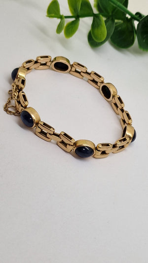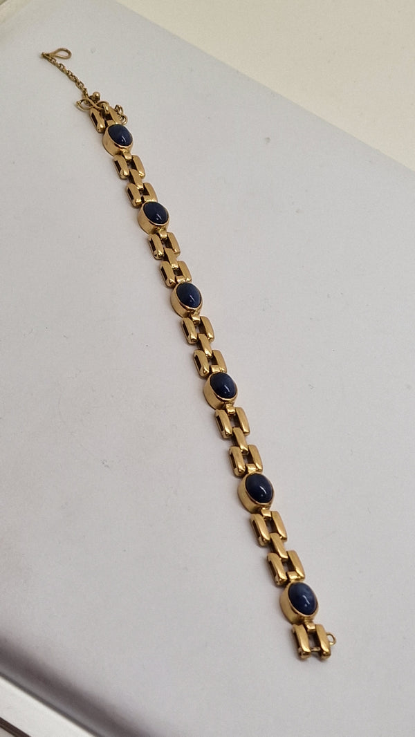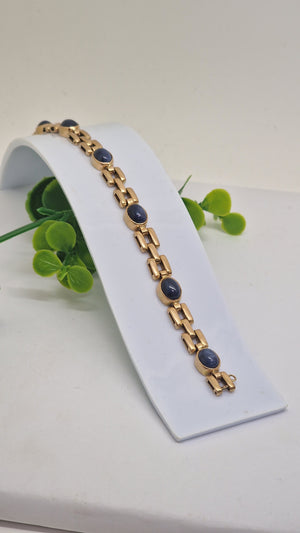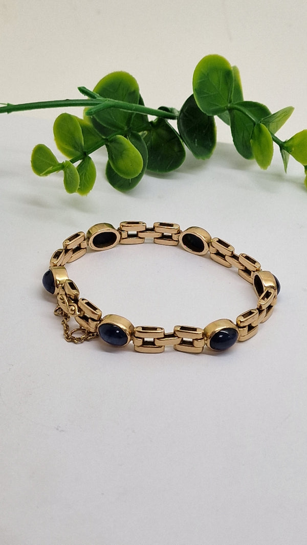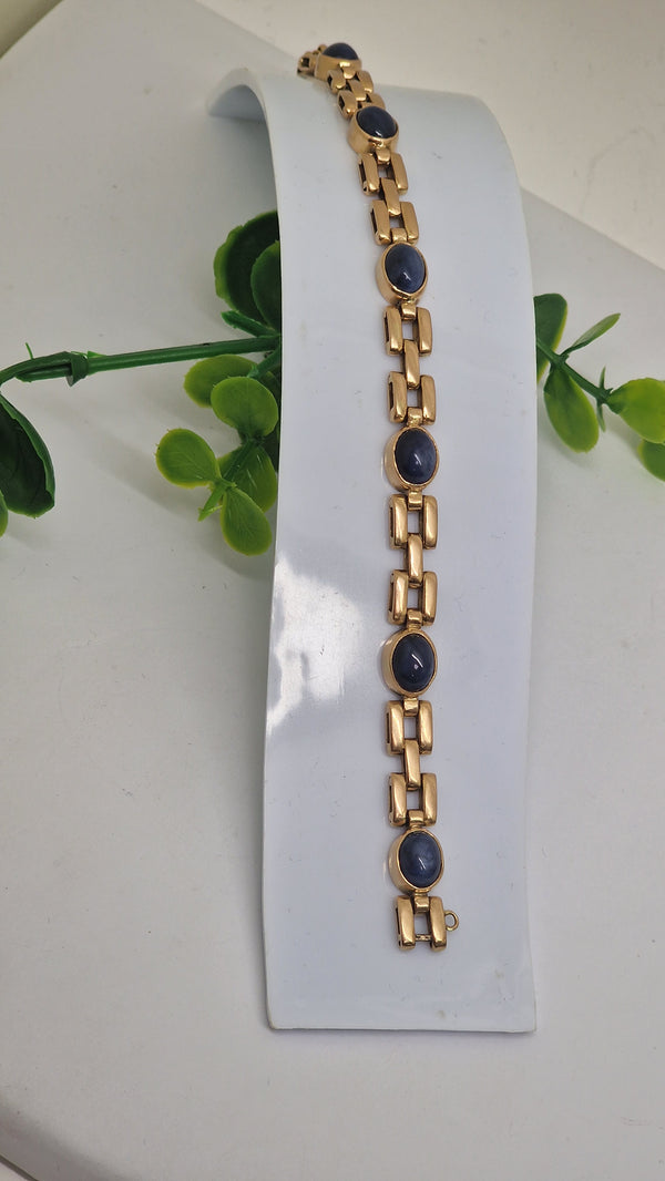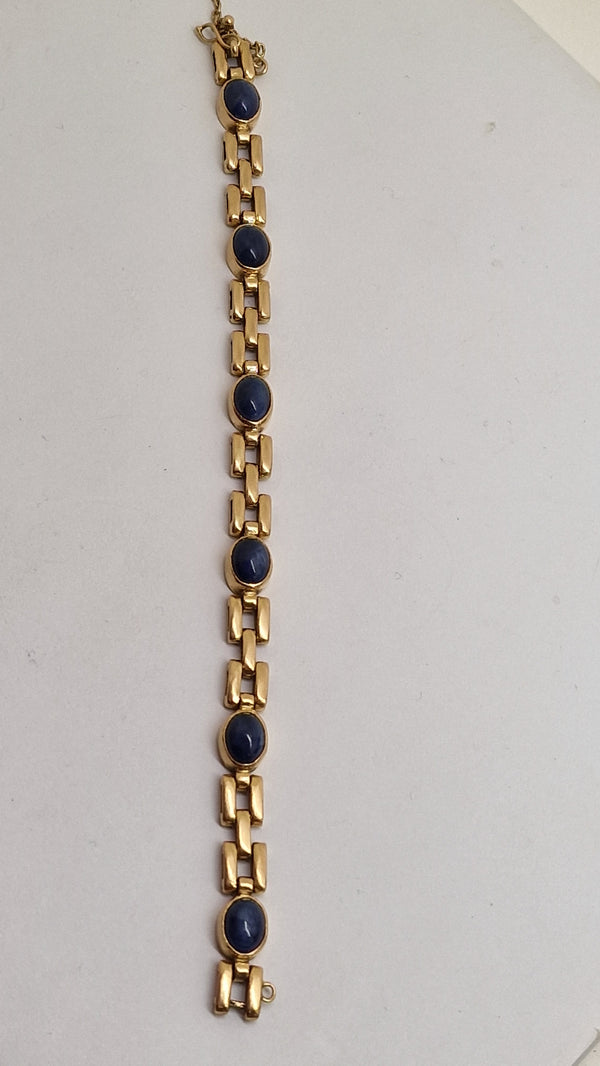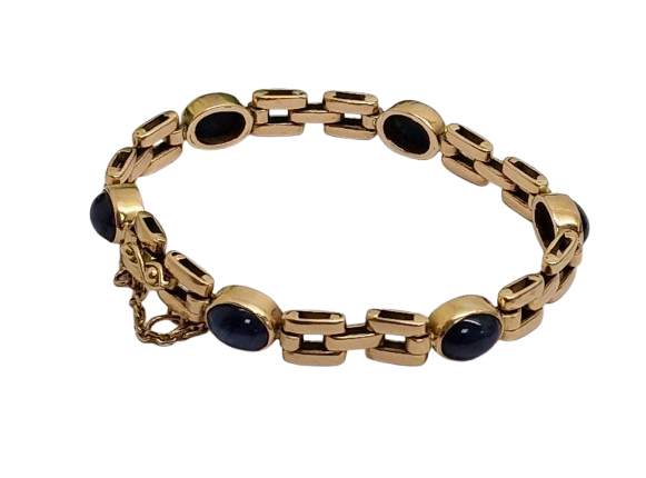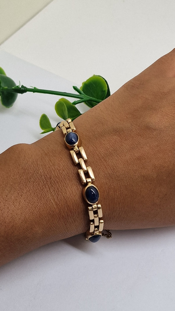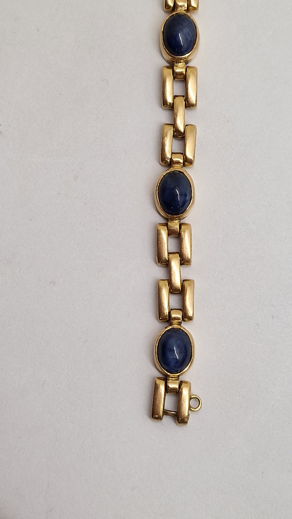 Bracelet fantaisie en or jaune 18 carats (750/1000), poinçonné Tête d’Aigle. Pesant 26,21 grammes et mesurant 18 cm de longueur, il se distingue par une largeur de 7 mm et une épaisseur de 3 mm, offrant un design à la fois solide et raffiné. Ce bijou est sublimé par de magnifiques saphirs étoilés, qui apportent de l'éclat.