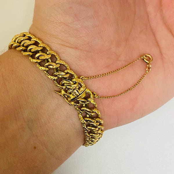 Bracelet à maillons de type américain, réalisé en or jaune 18 carats (750/1000) sans poinçon, dispose d’un fermoir à cliquet sécurisé ; il pèse 12,04 grammes, mesure 18 cm de long, 1 cm de large et 4 mm d’épaisseur, ne comporte aucune pierre et se trouve en très bon état.