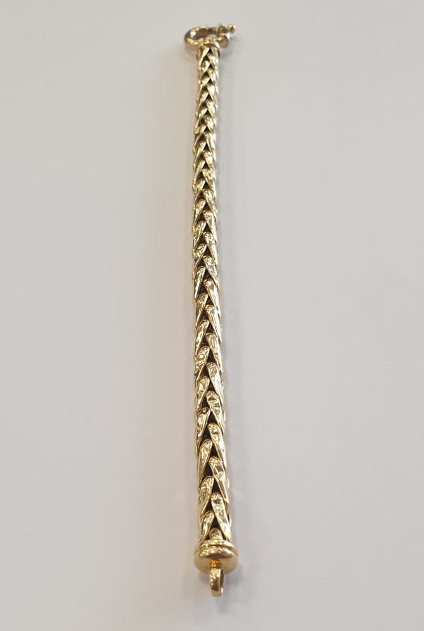 Ce très beau bracelet maillon en or jaune 18 carats (750/1000), poinçonné Tête d’Aigle, arbore une élégante maille palmier qui allie raffinement et caractère. Avec un poids de 18,81 grammes et une longueur de 19,5 cm, il s’adapte confortablement au poignet. Sa largeur de 0,6 cm lui confère une belle présence sans être imposante, tandis que son fermoir bouée assure une fixation sécurisée et pratique.